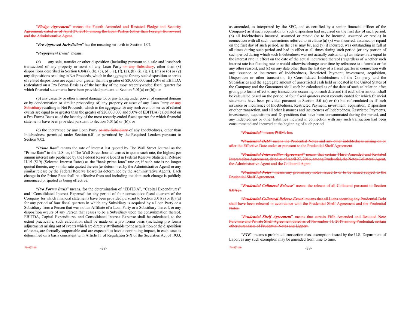 744627140 -38- “Pledge Agreement” means the Fourth Amended and Restated Pledge and Security Agreement, dated as of April 27, 2016, among the Loan Parties (other than Foreign Borrowers) and the Administrative Agent. “Pre-Approved Jurisdiction” has the meaning set forth in Section 1.07. “Prepayment Event” means: (a) any sale, transfer or other disposition (including pursuant to a sale and leaseback transaction) of any property or asset of any Loan Party or any Subsidiary, other than (x) dispositions described in Section 6.04(a), (b), (c), (d), (e), (f), (g), (h), (i), (j), (l), (m) or (o) or (y) any dispositions resulting in Net Proceeds, which in the aggregate for any such disposition or series of related dispositions are equal to or greater than the greater of $20,000,000 and 5.0% of EBITDA (calculated on a Pro Forma Basis as of the last day of the most recently-ended fiscal quarter for which financial statements have been provided pursuant to Section 5.01(a) or (b)); or (b) any casualty or other insured damage to, or any taking under power of eminent domain or by condemnation or similar proceeding of, any property or asset of any Loan Party or any Subsidiary resulting in Net Proceeds, which in the aggregate for any such event or series of related events are equal to or greater than the greater of $20,000,000 and 5.0% of EBITDA (calculated on a Pro Forma Basis as of the last day of the most recently-ended fiscal quarter for which financial statements have been provided pursuant to Section 5.01(a) or (b)); or (c) the incurrence by any Loan Party or any Subsidiary of any Indebtedness, other than Indebtedness permitted under Section 6.01 or permitted by the Required Lenders pursuant to Section 9.02. “Prime Rate” means the rate of interest last quoted by The Wall Street Journal as the “Prime Rate” in the U.S. or, if The Wall Street Journal ceases to quote such rate, the highest per annum interest rate published by the Federal Reserve Board in Federal Reserve Statistical Release H.15 (519) (Selected Interest Rates) as the “bank prime loan” rate or, if such rate is no longer quoted therein, any similar rate quoted therein (as determined by the Administrative Agent) or any similar release by the Federal Reserve Board (as determined by the Administrative Agent). Each change in the Prime Rate shall be effective from and including the date such change is publicly announced or quoted as being effective. “Pro Forma Basis” means, for the determination of “EBITDA”, “Capital Expenditures” and “Consolidated Interest Expense” for any period of four consecutive fiscal quarters of the Company for which financial statements have been provided pursuant to Section 5.01(a) or (b) (a) for any period of four fiscal quarters in which any Subsidiary is acquired by a Loan Party or a Subsidiary from a Person that was not an Affiliate of a Loan Party or a Subsidiary thereof, or any disposition occurs of any Person that ceases to be a Subsidiary upon the consummation thereof, EBITDA, Capital Expenditures and Consolidated Interest Expense shall be calculated, to the extent practicable, such calculation shall be made on a pro forma basis (including pro forma adjustments arising out of events which are directly attributable to the acquisition or the disposition of assets, are factually supportable and are expected to have a continuing impact, in each case as determined on a basis consistent with Article 11 of Regulation S-X of the Securities Act of 1933, 744627140 -39- as amended, as interpreted by the SEC, and as certified by a senior financial officer of the Company) as if such acquisition or such disposition had occurred on the first day of such period, (b) all Indebtedness incurred, assumed or repaid (or to be incurred, assumed or repaid) in connection with all such transactions referred to in clause (a) (x) was incurred, assumed or repaid on the first day of such period, as the case may be, and (y) if incurred, was outstanding in full at all times during such period and had in effect at all times during such period (or any portion of such period during which such Indebtedness was not actually outstanding) an interest rate equal to the interest rate in effect on the date of the actual incurrence thereof (regardless of whether such interest rate is a floating rate or would otherwise change over time by reference to a formula or for any other reason), and (c) on any date other than the last day of a fiscal quarter in connection with any issuance or incurrence of Indebtedness, Restricted Payment, investment, acquisition, Disposition or other transaction, (i) Consolidated Indebtedness of the Company and the Subsidiaries and the aggregate amount of unrestricted cash held or located in the United States of the Company and the Guarantors shall each be calculated as of the date of such calculation after giving pro forma effect to any transactions occurring on such date and (ii) each other amount shall be calculated based on the period of four fiscal quarters most recently ended for which financial statements have been provided pursuant to Section 5.01(a) or (b) but reformulated as if such issuance or incurrence of Indebtedness, Restricted Payment, investment, acquisition, Disposition or other transaction, and all other issuances and incurrences of Indebtedness, Restricted Payments, investments, acquisitions and Dispositions that have been consummated during the period, and any Indebtedness or other liabilities incurred in connection with any such transaction had been consummated and incurred at the beginning of such period. “Prudential” means PGIM, Inc. “Prudential Debt” means the Prudential Notes and any other indebtedness arising on or after the Effective Date under or pursuant to the Prudential Shelf Agreement. “Prudential Intercreditor Agreement” means that certain Third Amended and Restated Intercreditor Agreement, dated as of April 27, 2016, among Prudential, the Note