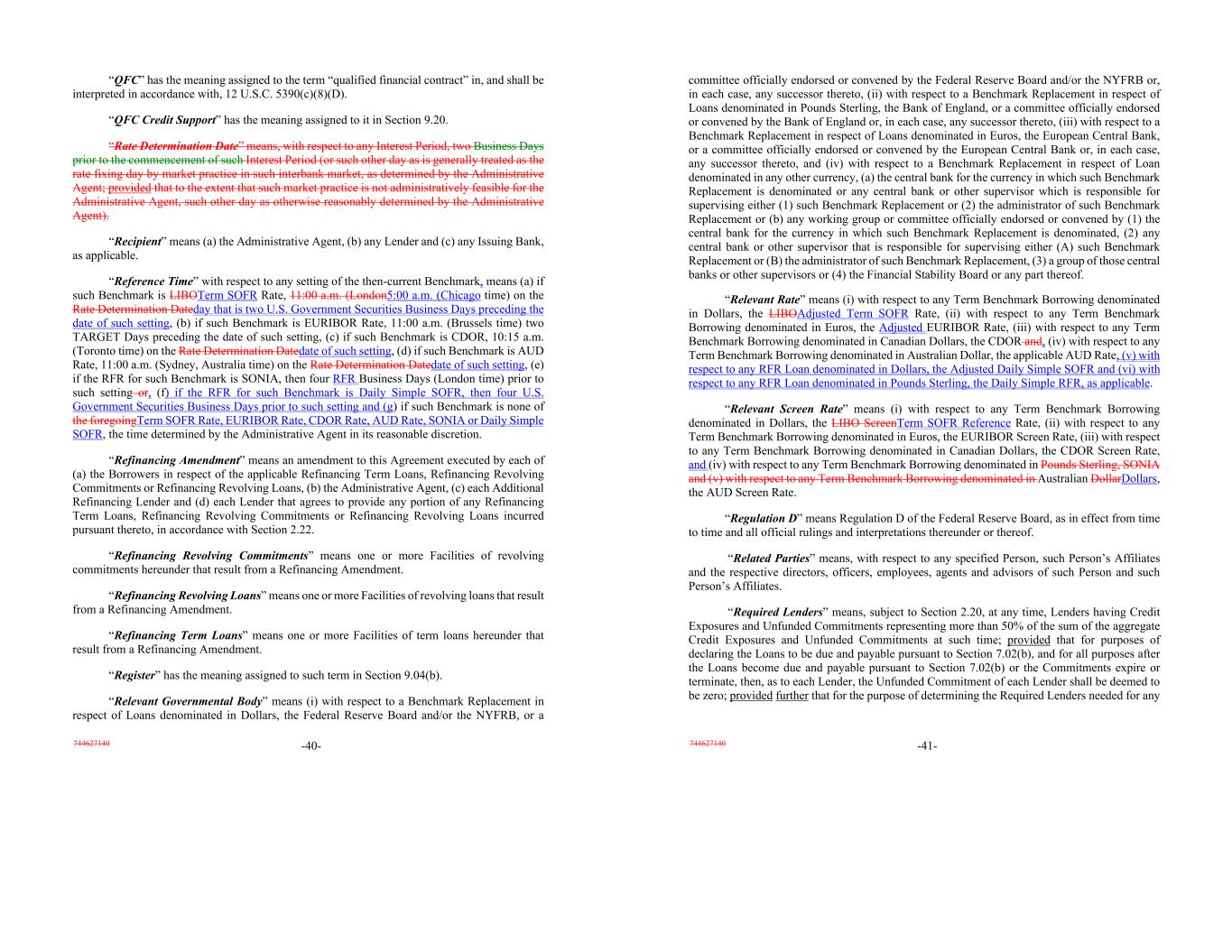 744627140 -40- “QFC” has the meaning assigned to the term “qualified financial contract” in, and shall be interpreted in accordance with, 12 U.S.C. 5390(c)(8)(D). “QFC Credit Support” has the meaning assigned to it in Section 9.20. “Rate Determination Date” means, with respect to any Interest Period, two Business Days prior to the commencement of such Interest Period (or such other day as is generally treated as the rate fixing day by market practice in such interbank market, as determined by the Administrative Agent; provided that to the extent that such market practice is not administratively feasible for the Administrative Agent, such other day as otherwise reasonably determined by the Administrative Agent). “Recipient” means (a) the Administrative Agent, (b) any Lender and (c) any Issuing Bank, as applicable. “Reference Time” with respect to any setting of the then-current Benchmark, means (a) if such Benchmark is LIBOTerm SOFR Rate, 11:00 a.m. (London5:00 a.m. (Chicago time) on the Rate Determination Dateday that is two U.S. Government Securities Business Days preceding the date of such setting, (b) if such Benchmark is EURIBOR Rate, 11:00 a.m. (Brussels time) two TARGET Days preceding the date of such setting, (c) if such Benchmark is CDOR, 10:15 a.m. (Toronto time) on the Rate Determination Datedate of such setting, (d) if such Benchmark is AUD Rate, 11:00 a.m. (Sydney, Australia time) on the Rate Determination Datedate of such setting, (e) if the RFR for such Benchmark is SONIA, then four RFR Business Days (London time) prior to such setting or, (f) if the RFR for such Benchmark is Daily Simple SOFR, then four U.S. Government Securities Business Days prior to such setting and (g) if such Benchmark is none of the foregoingTerm SOFR Rate, EURIBOR Rate, CDOR Rate, AUD Rate, SONIA or Daily Simple SOFR, the time determined by the Administrative Agent in its reasonable discretion. “Refinancing Amendment” means an amendment to this Agreement executed by each of (a) the Borrowers in respect of the applicable Refinancing Term Loans, Refinancing Revolving Commitments or Refinancing Revolving Loans, (b) the Administrative Agent, (c) each Additional Refinancing Lender and (d) each Lender that agrees to provide any portion of any Refinancing Term Loans, Refinancing Revolving Commitments or Refinancing Revolving Loans incurred pursuant thereto, in accordance with Section 2.22. “Refinancing Revolving Commitments” means one or more Facilities of revolving commitments hereunder that result from a Refinancing Amendment. “Refinancing Revolving Loans” means one or more Facilities of revolving loans that result from a Refinancing Amendment. “Refinancing Term Loans” means one or more Facilities of term loans hereunder that result from a Refinancing Amendment. “Register” has the meaning assigned to such term in Section 9.04(b). “Relevant Governmental Body” means (i) with respect to a Benchmark Replacement in respect of Loans denominated in Dollars, the Federal Reserve Board and/or the NYFRB, or a 744627140 -41- committee officially endorsed or convened by the Federal Reserve Board and/or the NYFRB or, in each case, any successor thereto, (ii) with respect to a Benchmark Replacement in respect of Loans denominated in Pounds Sterling, the Bank of England, or a committee officially endorsed or convened by the Bank of England or, in each case, any successor thereto, (iii) with respect to a Benchmark Replacement in respect of Loans denominated in Euros, the European Central Bank, or a committee officially endorsed or convened by the European Central Bank or, in each case, any successor thereto, and (iv) with respect to a Benchmark Replacement in respect of Loan denominated in any other currency, (a) the central bank for the currency in which such Benchmark Replacement is denominated or any central bank or other supervisor which is responsible for supervising either (1) such Benchmark Replacement or (2) the administrator of such Benchmark Replacement or (b) any working group or committee officially endorsed or convened by (1) the central bank for the currency in which such Benchmark Replacement is denominated, (2) any central bank or other supervisor that is responsible for supervising either (A) such Benchmark Replacement or (B) the administrator of such Benchmark Replacement, (3) a group of those central banks or other supervisors or (4) the Financial Stability Board or any part thereof. “Relevant Rate” means (i) with respect to any Term Benchmark Borrowing denominated in Dollars, the LIBOAdjusted Term SOFR Rate, (ii) with respect to any Term Benchmark Borrowing denominated in Euros, the Adjusted EURIBOR Rate, (iii) with respect to any Term Benchmark Borrowing denominated in Canadian Dollars, the CDOR and, (iv) with respect to any Term Benchmark Borrowing denominated in Australian Dollar, the applicable AUD Rate, (v) with respect to any RFR Loan denominated in Dollars, the Adjusted Daily Simple SOFR and (vi) with respect to any RFR Loan denominated in Pounds Sterling, the Daily Simple RFR, as applicable. “Relevant Screen Rate” means (i) with respect to any Term Benchmark Borrowing denominated in Dollars, the LIBO ScreenTerm SOFR Reference Rate, (ii) with respect to any Term Benchmark Borrowing denominated in Euros, the EURIBOR Screen Rate, (iii) with respect to any Term Benchmark Borrowing denominated in Canadian Dollars, the CDOR Screen Rate, and (iv) with respect to any Term Benchmark Borrowing denominated in Pounds Sterling, SONIA and (v) with respect to any Term Benchmark Borrowing denominated in Australian DollarDollars, the AUD Screen Rate. “Regulation D” means Regulation D of the Federal Reserve Board, as in effect from time to time and all official rulings and interpretations thereunder or thereof. “Related Parties” means, with respect to any specified Person, such Person’s Affiliates and the respective directors, officers, employees