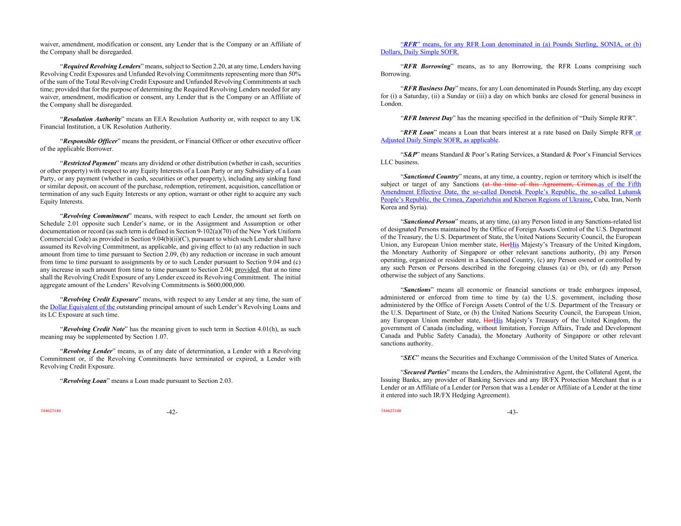 744627140 -42- waiver, amendment, modification or consent, any Lender that is the Company or an Affiliate of the Company shall be disregarded. “Required Revolving Lenders” means, subject to Section 2.20, at any time, Lenders having Revolving Credit Exposures and Unfunded Revolving Commitments representing more than 50% of the sum of the Total Revolving Credit Exposure and Unfunded Revolving Commitments at such time; provided that for the purpose of determining the Required Revolving Lenders needed for any waiver, amendment, modification or consent, any Lender that is the Company or an Affiliate of the Company shall be disregarded. “Resolution Authority” means an EEA Resolution Authority or, with respect to any UK Financial Institution, a UK Resolution Authority. “Responsible Officer” means the president, or Financial Officer or other executive officer of the applicable Borrower. “Restricted Payment” means any dividend or other distribution (whether in cash, securities or other property) with respect to any Equity Interests of a Loan Party or any Subsidiary of a Loan Party, or any payment (whether in cash, securities or other property), including any sinking fund or similar deposit, on account of the purchase, redemption, retirement, acquisition, cancellation or termination of any such Equity Interests or any option, warrant or other right to acquire any such Equity Interests. “Revolving Commitment” means, with respect to each Lender, the amount set forth on Schedule 2.01 opposite such Lender’s name, or in the Assignment and Assumption or other documentation or record (as such term is defined in Section 9-102(a)(70) of the New York Uniform Commercial Code) as provided in Section 9.04(b)(ii)(C), pursuant to which such Lender shall have assumed its Revolving Commitment, as applicable, and giving effect to (a) any reduction in such amount from time to time pursuant to Section 2.09, (b) any reduction or increase in such amount from time to time pursuant to assignments by or to such Lender pursuant to Section 9.04 and (c) any increase in such amount from time to time pursuant to Section 2.04; provided, that at no time shall the Revolving Credit Exposure of any Lender exceed its Revolving Commitment. The initial aggregate amount of the Lenders’ Revolving Commitments is $600,000,000. “Revolving Credit Exposure” means, with respect to any Lender at any time, the sum of the Dollar Equivalent of the outstanding principal amount of such Lender’s Revolving Loans and its LC Exposure at such time. “Revolving Credit Note” has the meaning given to such term in Section 4.01(h), as such meaning may be supplemented by Section 1.07. “Revolving Lender” means, as of any date of determination, a Lender with a Revolving Commitment or, if the Revolving Commitments have terminated or expired, a Lender with Revolving Credit Exposure. “Revolving Loan” means a Loan made pursuant to Section 2.03. 744627140 -43- “RFR” means, for any RFR Loan denominated in (a) Pounds Sterling, SONIA, or (b) Dollars, Daily Simple SOFR. “RFR Borrowing” means, as to any Borrowing, the RFR Loans comprising such Borrowing. “RFR Business Day” means, for any Loan denominated in Pounds Sterling, any day except for (i) a Saturday, (ii) a Sunday or (iii) a day on which banks are closed for general business in London. “RFR Interest Day” has the meaning specified in the definition of “Daily Simple RFR”. “RFR Loan” means a Loan that bears interest at a rate based on Daily Simple RFR or Adjusted Daily Simple SOFR, as applicable. “S&P” means Standard & Poor’s Rating Services, a Standard & Poor’s Financial Services LLC business. “Sanctioned Country” means, at any time, a country, region or territory which is itself the subject or target of any Sanctions (at the time of this Agreement, Crimea,as of the Fifth Amendment Effective Date, the so-called Donetsk People’s Republic, the so-called Luhansk People’s Republic, the Crimea, Zaporizhzhia and Kherson Regions of Ukraine, Cuba, Iran, North Korea and Syria). “Sanctioned Person” means, at any time, (a) any Person listed in any Sanctions-related list of designated Persons maintained by the Office of Foreign Assets Control of the U.S. Department of the Treasury, the U.S. Department of State, the United Nations Security Council, the European Union, any European Union member state, HerHis Majesty’s Treasury of the United Kingdom, the Monetary Authority of Singapore or other relevant sanctions authority, (b) any Person operating, organized or resident in a Sanctioned Country, (c) any Person owned or controlled by any such Person or Persons described in the foregoing clauses (a) or (b), or (d) any Person otherwise the subject of any Sanctions. “Sanctions” means all economic or financial sanctions or trade embargoes imposed, administered or enforced from time to time by (a) the U.S. government, including those administered by the Office of Foreign Assets Control of the U.S. Department of the Treasury or the U.S. Department of State, or (b) the United Nations Security Council, the European Union, any European Union member state, HerHis Majesty’s Treasury of the United Kingdom, the government of Canada (including, without limitation, Foreign Affairs, Trade and Development Canada and Public Safety Canada), the Monetary Authority of Singapore or other relevant sanctions authority. “SEC” means the Securities and Exchange Commission of the United States of America. “Secured Parties” means the Lenders, the Administrative Agent, the Collateral Agent, the Issuing Banks, any provider of Banking Services and any IR/FX Protection Merchant that is a Lender or an Affiliate of a Lender (or Person that was a Lender or Affiliate of a Lender at the time it entered into such IR/FX Hedging Agreement).