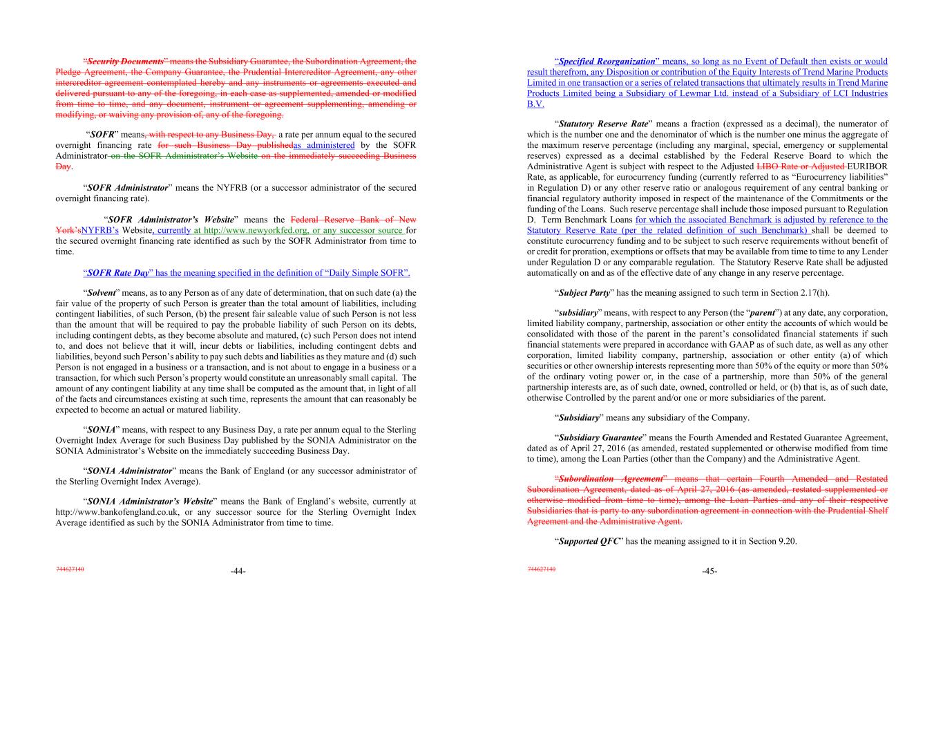 744627140 -44- “Security Documents” means the Subsidiary Guarantee, the Subordination Agreement, the Pledge Agreement, the Company Guarantee, the Prudential Intercreditor Agreement, any other intercreditor agreement contemplated hereby and any instruments or agreements executed and delivered pursuant to any of the foregoing, in each case as supplemented, amended or modified from time to time, and any document, instrument or agreement supplementing, amending or modifying, or waiving any provision of, any of the foregoing. “SOFR” means, with respect to any Business Day, a rate per annum equal to the secured overnight financing rate for such Business Day publishedas administered by the SOFR Administrator on the SOFR Administrator’s Website on the immediately succeeding Business Day. “SOFR Administrator” means the NYFRB (or a successor administrator of the secured overnight financing rate). “SOFR Administrator’s Website” means the Federal Reserve Bank of New York’sNYFRB’s Website, currently at http://www.newyorkfed.org, or any successor source for the secured overnight financing rate identified as such by the SOFR Administrator from time to time. “SOFR Rate Day” has the meaning specified in the definition of “Daily Simple SOFR”. “Solvent” means, as to any Person as of any date of determination, that on such date (a) the fair value of the property of such Person is greater than the total amount of liabilities, including contingent liabilities, of such Person, (b) the present fair saleable value of such Person is not less than the amount that will be required to pay the probable liability of such Person on its debts, including contingent debts, as they become absolute and matured, (c) such Person does not intend to, and does not believe that it will, incur debts or liabilities, including contingent debts and liabilities, beyond such Person’s ability to pay such debts and liabilities as they mature and (d) such Person is not engaged in a business or a transaction, and is not about to engage in a business or a transaction, for which such Person’s property would constitute an unreasonably small capital. The amount of any contingent liability at any time shall be computed as the amount that, in light of all of the facts and circumstances existing at such time, represents the amount that can reasonably be expected to become an actual or matured liability. “SONIA” means, with respect to any Business Day, a rate per annum equal to the Sterling Overnight Index Average for such Business Day published by the SONIA Administrator on the SONIA Administrator’s Website on the immediately succeeding Business Day. “SONIA Administrator” means the Bank of England (or any successor administrator of the Sterling Overnight Index Average). “SONIA Administrator’s Website” means the Bank of England’s website, currently at http://www.bankofengland.co.uk, or any successor source for the Sterling Overnight Index Average identified as such by the SONIA Administrator from time to time. 744627140 -45- “Specified Reorganization” means, so long as no Event of Default then exists or would result therefrom, any Disposition or contribution of the Equity Interests of Trend Marine Products Limited in one transaction or a series of related transactions that ultimately results in Trend Marine Products Limited being a Subsidiary of Lewmar Ltd. instead of a Subsidiary of LCI Industries B.V. “Statutory Reserve Rate” means a fraction (expressed as a decimal), the numerator of which is the number one and the denominator of which is the number one minus the aggregate of the maximum reserve percentage (including any marginal, special, emergency or supplemental reserves) expressed as a decimal established by the Federal Reserve Board to which the Administrative Agent is subject with respect to the Adjusted LIBO Rate or Adjusted EURIBOR Rate, as applicable, for eurocurrency funding (currently referred to as “Eurocurrency liabilities” in Regulation D) or any other reserve ratio or analogous requirement of any central banking or financial regulatory authority imposed in respect of the maintenance of the Commitments or the funding of the Loans. Such reserve percentage shall include those imposed pursuant to Regulation D. Term Benchmark Loans for which the associated Benchmark is adjusted by reference to the Statutory Reserve Rate (per the related definition of such Benchmark) shall be deemed to constitute eurocurrency funding and to be subject to such reserve requirements without benefit of or credit for proration, exemptions or offsets that may be available from time to time to any Lender under Regulation D or any comparable regulation. The Statutory Reserve Rate shall be adjusted automatically on and as of the effective date of any change in any reserve percentage. “Subject Party” has the meaning assigned to such term in Section 2.17(h). “subsidiary” means, with respect to any Person (the “parent”) at any date, any corporation, limited liability company, partnership, association or other entity the accounts of which would be consolidated with those of the parent in the parent’s consolidated financial statements if such financial statements were prepared in accordance with GAAP as of such date, as well as any other corporation, limited liability company, partnership, association or other entity (a) of which securities or other ownership interests representing more than 50% of the equity or more than 50% of the ordinary voting power or, in the case of a partnership, more than 50% of the general partnership interests are, as of such date, owned, controlled or held, or (b) that is, as of such date, otherwise Controlled by the parent and/or one or more subsidiaries of the parent. “Subsidiary” means any subsidiary of the Company. “Subsidiary Guarantee” means the Fourth Amended and Restated Guarantee Agreement, dated as of April 27, 2016 (as amended, restated