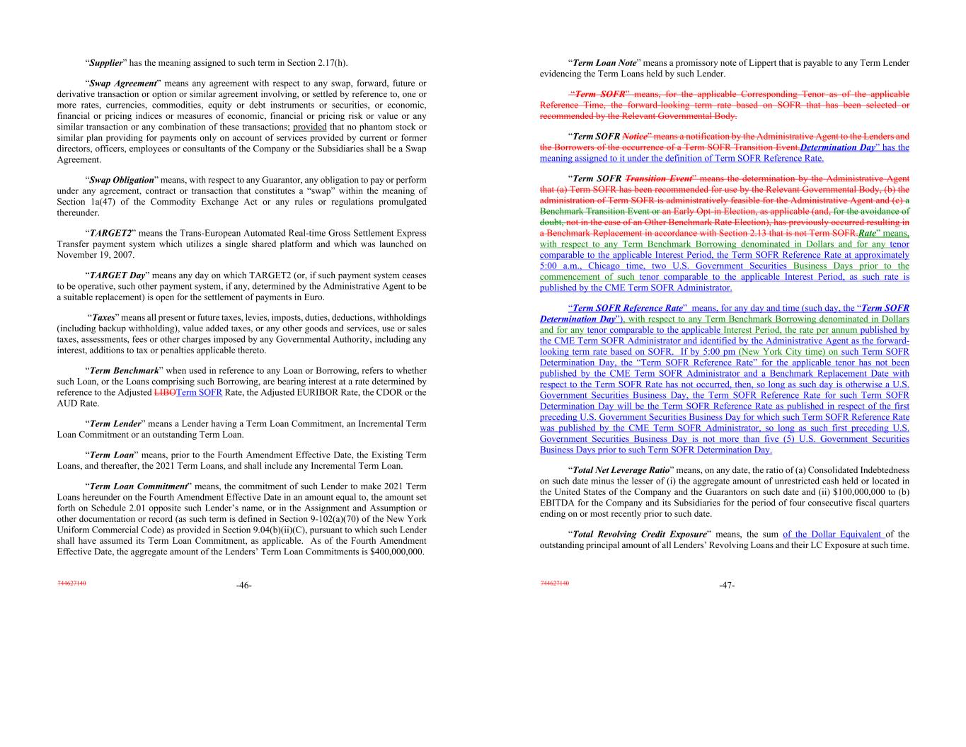 744627140 -46- “Supplier” has the meaning assigned to such term in Section 2.17(h). “Swap Agreement” means any agreement with respect to any swap, forward, future or derivative transaction or option or similar agreement involving, or settled by reference to, one or more rates, currencies, commodities, equity or debt instruments or securities, or economic, financial or pricing indices or measures of economic, financial or pricing risk or value or any similar transaction or any combination of these transactions; provided that no phantom stock or similar plan providing for payments only on account of services provided by current or former directors, officers, employees or consultants of the Company or the Subsidiaries shall be a Swap Agreement. “Swap Obligation” means, with respect to any Guarantor, any obligation to pay or perform under any agreement, contract or transaction that constitutes a “swap” within the meaning of Section 1a(47) of the Commodity Exchange Act or any rules or regulations promulgated thereunder. “TARGET2” means the Trans-European Automated Real-time Gross Settlement Express Transfer payment system which utilizes a single shared platform and which was launched on November 19, 2007. “TARGET Day” means any day on which TARGET2 (or, if such payment system ceases to be operative, such other payment system, if any, determined by the Administrative Agent to be a suitable replacement) is open for the settlement of payments in Euro. “Taxes” means all present or future taxes, levies, imposts, duties, deductions, withholdings (including backup withholding), value added taxes, or any other goods and services, use or sales taxes, assessments, fees or other charges imposed by any Governmental Authority, including any interest, additions to tax or penalties applicable thereto. “Term Benchmark” when used in reference to any Loan or Borrowing, refers to whether such Loan, or the Loans comprising such Borrowing, are bearing interest at a rate determined by reference to the Adjusted LIBOTerm SOFR Rate, the Adjusted EURIBOR Rate, the CDOR or the AUD Rate. “Term Lender” means a Lender having a Term Loan Commitment, an Incremental Term Loan Commitment or an outstanding Term Loan. “Term Loan” means, prior to the Fourth Amendment Effective Date, the Existing Term Loans, and thereafter, the 2021 Term Loans, and shall include any Incremental Term Loan. “Term Loan Commitment” means, the commitment of such Lender to make 2021 Term Loans hereunder on the Fourth Amendment Effective Date in an amount equal to, the amount set forth on Schedule 2.01 opposite such Lender’s name, or in the Assignment and Assumption or other documentation or record (as such term is defined in Section 9-102(a)(70) of the New York Uniform Commercial Code) as provided in Section 9.04(b)(ii)(C), pursuant to which such Lender shall have assumed its Term Loan Commitment, as applicable. As of the Fourth Amendment Effective Date, the aggregate amount of the Lenders’ Term Loan Commitments is $400,000,000. 744627140 -47- “Term Loan Note” means a promissory note of Lippert that is payable to any Term Lender evidencing the Term Loans held by such Lender. “Term SOFR” means, for the applicable Corresponding Tenor as of the applicable Reference Time, the forward-looking term rate based on SOFR that has been selected or recommended by the Relevant Governmental Body. “Term SOFR Notice” means a notification by the Administrative Agent to the Lenders and the Borrowers of the occurrence of a Term SOFR Transition Event.Determination Day” has the meaning assigned to it under the definition of Term SOFR Reference Rate. “Term SOFR Transition Event” means the determination by the Administrative Agent that (a) Term SOFR has been recommended for use by the Relevant Governmental Body, (b) the administration of Term SOFR is administratively feasible for the Administrative Agent and (c) a Benchmark Transition Event or an Early Opt-in Election, as applicable (and, for the avoidance of doubt, not in the case of an Other Benchmark Rate Election), has previously occurred resulting in a Benchmark Replacement in accordance with Section 2.13 that is not Term SOFR.Rate” means, with respect to any Term Benchmark Borrowing denominated in Dollars and for any tenor comparable to the applicable Interest Period, the Term SOFR Reference Rate at approximately 5:00 a.m., Chicago time, two U.S. Government Securities Business Days prior to the commencement of such tenor comparable to the applicable Interest Period, as such rate is published by the CME Term SOFR Administrator. “Term SOFR Reference Rate” means, for any day and time (such day, the “Term SOFR Determination Day”), with respect to any Term Benchmark Borrowing denominated in Dollars and for any tenor comparable to the applicable Interest Period, the rate per annum published by the CME Term SOFR Administrator and identified by the Administrative Agent as the forward- looking term rate based on SOFR. If by 5:00 pm (New York City time) on such Term SOFR Determination Day, the “Term SOFR Reference Rate” for the applicable tenor has not been published by the CME Term SOFR Administrator and a Benchmark Replacement Date with respect to the Term SOFR Rate has not occurred, then, so long as such day is otherwise a U.S. Government Securities Business Day, the Term SOFR Reference Rate for such Term SOFR Determination Day will be the Term SOFR Reference Rate as published in respect of the first preceding U.S. Government Securities Business Day for which such Term SOFR Reference Rate was published by the CME Term SOFR Administrator, so long as such first preceding U.S. Government Securities Business Day is not more than five (5) U.S. Government Securities Business Days prior to such Term SOFR Determination Day. “Total Net Leverage Ratio” means, on any date, the ratio of (a) Consolidated Indebtedness on such date minus the lesser of (i) th