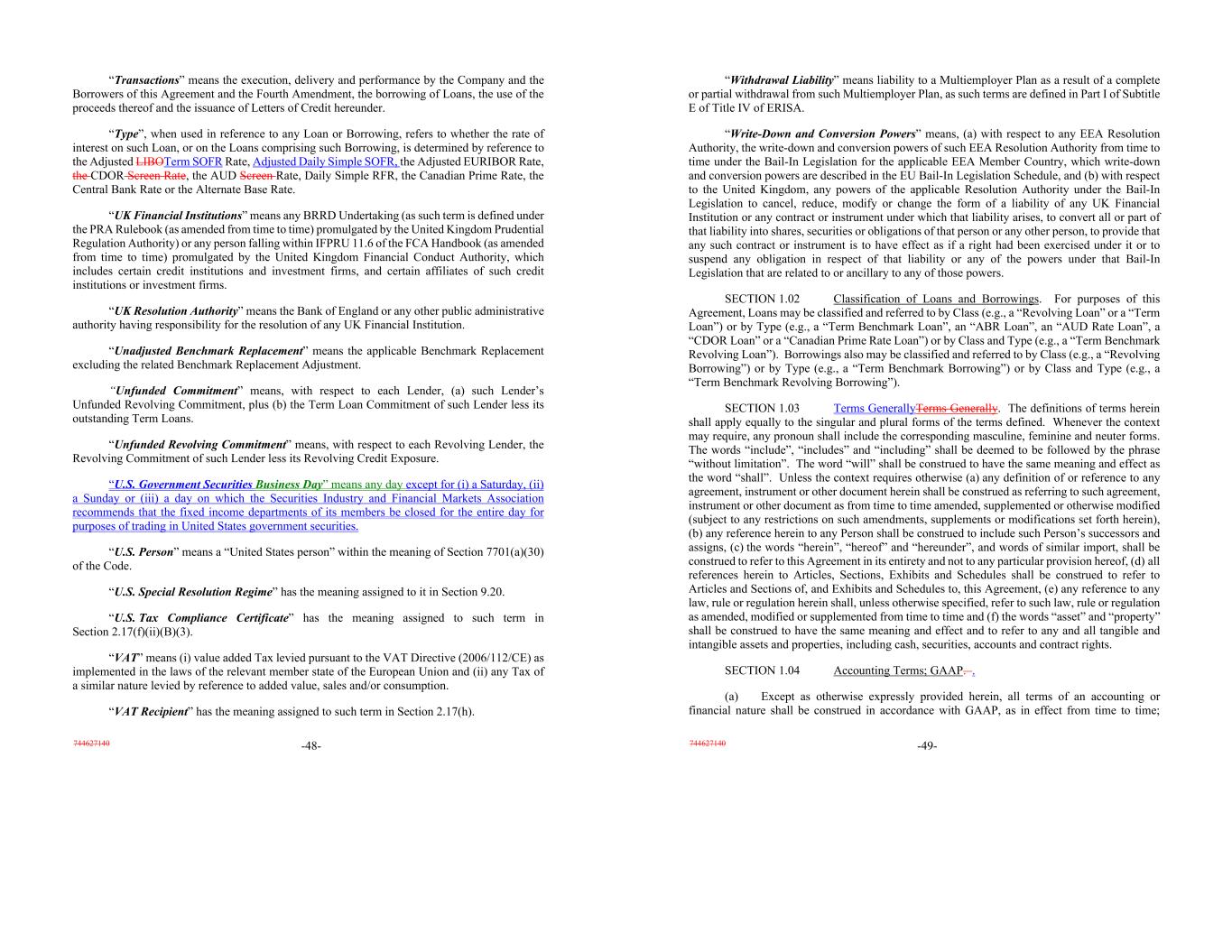 744627140 -48- “Transactions” means the execution, delivery and performance by the Company and the Borrowers of this Agreement and the Fourth Amendment, the borrowing of Loans, the use of the proceeds thereof and the issuance of Letters of Credit hereunder. “Type”, when used in reference to any Loan or Borrowing, refers to whether the rate of interest on such Loan, or on the Loans comprising such Borrowing, is determined by reference to the Adjusted LIBOTerm SOFR Rate, Adjusted Daily Simple SOFR, the Adjusted EURIBOR Rate, the CDOR Screen Rate, the AUD Screen Rate, Daily Simple RFR, the Canadian Prime Rate, the Central Bank Rate or the Alternate Base Rate. “UK Financial Institutions” means any BRRD Undertaking (as such term is defined under the PRA Rulebook (as amended from time to time) promulgated by the United Kingdom Prudential Regulation Authority) or any person falling within IFPRU 11.6 of the FCA Handbook (as amended from time to time) promulgated by the United Kingdom Financial Conduct Authority, which includes certain credit institutions and investment firms, and certain affiliates of such credit institutions or investment firms. “UK Resolution Authority” means the Bank of England or any other public administrative authority having responsibility for the resolution of any UK Financial Institution. “Unadjusted Benchmark Replacement” means the applicable Benchmark Replacement excluding the related Benchmark Replacement Adjustment. “Unfunded Commitment” means, with respect to each Lender, (a) such Lender’s Unfunded Revolving Commitment, plus (b) the Term Loan Commitment of such Lender less its outstanding Term Loans. “Unfunded Revolving Commitment” means, with respect to each Revolving Lender, the Revolving Commitment of such Lender less its Revolving Credit Exposure. “U.S. Government Securities Business Day” means any day except for (i) a Saturday, (ii) a Sunday or (iii) a day on which the Securities Industry and Financial Markets Association recommends that the fixed income departments of its members be closed for the entire day for purposes of trading in United States government securities. “U.S. Person” means a “United States person” within the meaning of Section 7701(a)(30) of the Code. “U.S. Special Resolution Regime” has the meaning assigned to it in Section 9.20. “U.S. Tax Compliance Certificate” has the meaning assigned to such term in Section 2.17(f)(ii)(B)(3). “VAT” means (i) value added Tax levied pursuant to the VAT Directive (2006/112/CE) as implemented in the laws of the relevant member state of the European Union and (ii) any Tax of a similar nature levied by reference to added value, sales and/or consumption. “VAT Recipient” has the meaning assigned to such term in Section 2.17(h). 744627140 -49- “Withdrawal Liability” means liability to a Multiemployer Plan as a result of a complete or partial withdrawal from such Multiemployer Plan, as such terms are defined in Part I of Subtitle E of Title IV of ERISA. “Write-Down and Conversion Powers” means, (a) with respect to any EEA Resolution Authority, the write-down and conversion powers of such EEA Resolution Authority from time to time under the Bail-In Legislation for the applicable EEA Member Country, which write-down and conversion powers are described in the EU Bail-In Legislation Schedule, and (b) with respect to the United Kingdom, any powers of the applicable Resolution Authority under the Bail-In Legislation to cancel, reduce, modify or change the form of a liability of any UK Financial Institution or any contract or instrument under which that liability arises, to convert all or part of that liability into shares, securities or obligations of that person or any other person, to provide that any such contract or instrument is to have effect as if a right had been exercised under it or to suspend any obligation in respect of that liability or any of the powers under that Bail-In Legislation that are related to or ancillary to any of those powers. SECTION 1.02 Classification of Loans and Borrowings. For purposes of this Agreement, Loans may be classified and referred to by Class (e.g., a “Revolving Loan” or a “Term Loan”) or by Type (e.g., a “Term Benchmark Loan”, an “ABR Loan”, an “AUD Rate Loan”, a “CDOR Loan” or a “Canadian Prime Rate Loan”) or by Class and Type (e.g., a “Term Benchmark Revolving Loan”). Borrowings also may be classified and referred to by Class (e.g., a “Revolving Borrowing”) or by Type (e.g., a “Term Benchmark Borrowing”) or by Class and Type (e.g., a “Term Benchmark Revolving Borrowing”). SECTION 1.03 Terms GenerallyTerms Generally. The definitions of terms herein shall apply equally to the singular and plural forms of the terms defined. Whenever the context may require, any pronoun shall include the corresponding masculine, feminine and neuter forms. The words “include”, “includes” and “including” shall be deemed to be followed by the phrase “without limitation”. The word “will” shall be construed to have the same meaning and effect as the word “shall”. Unless the context requires otherwise (a) any definition of or reference to any agreement, instrument or other document herein shall be construed as referring to such agreement, instrument or other document as from time to time amended, supplemented or otherwise modified (subject to any restrictions on such amendments, supplements or modifications set forth herein), (b) any reference herein to any Person shall be construed to include such Person’s successors and assigns, (c) the words “herein”, “hereof” and “hereunder”, and words of similar import, shall be construed to refer to this Agreement in its entirety and not to any particular provision hereof, (d) all references herein to Articles, Sections, Exhibits and Schedules shall be construed to refer to Articles and Sections of, and Exhibits and