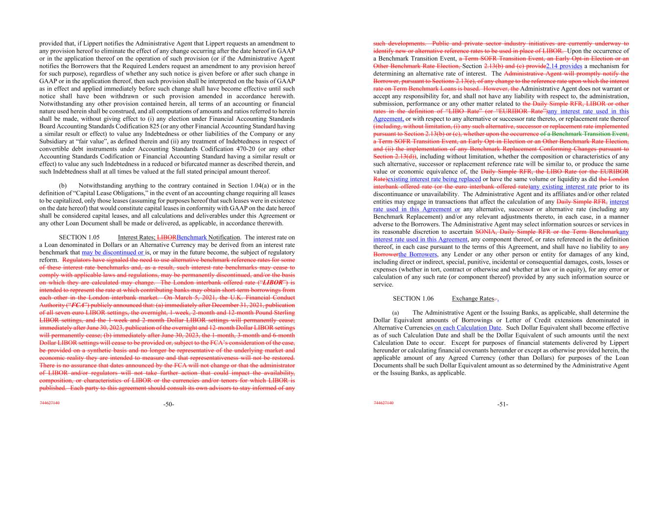744627140 -50- provided that, if Lippert notifies the Administrative Agent that Lippert requests an amendment to any provision hereof to eliminate the effect of any change occurring after the date hereof in GAAP or in the application thereof on the operation of such provision (or if the Administrative Agent notifies the Borrowers that the Required Lenders request an amendment to any provision hereof for such purpose), regardless of whether any such notice is given before or after such change in GAAP or in the application thereof, then such provision shall be interpreted on the basis of GAAP as in effect and applied immediately before such change shall have become effective until such notice shall have been withdrawn or such provision amended in accordance herewith. Notwithstanding any other provision contained herein, all terms of an accounting or financial nature used herein shall be construed, and all computations of amounts and ratios referred to herein shall be made, without giving effect to (i) any election under Financial Accounting Standards Board Accounting Standards Codification 825 (or any other Financial Accounting Standard having a similar result or effect) to value any Indebtedness or other liabilities of the Company or any Subsidiary at “fair value”, as defined therein and (ii) any treatment of Indebtedness in respect of convertible debt instruments under Accounting Standards Codification 470-20 (or any other Accounting Standards Codification or Financial Accounting Standard having a similar result or effect) to value any such Indebtedness in a reduced or bifurcated manner as described therein, and such Indebtedness shall at all times be valued at the full stated principal amount thereof. (b) Notwithstanding anything to the contrary contained in Section 1.04(a) or in the definition of “Capital Lease Obligations,” in the event of an accounting change requiring all leases to be capitalized, only those leases (assuming for purposes hereof that such leases were in existence on the date hereof) that would constitute capital leases in conformity with GAAP on the date hereof shall be considered capital leases, and all calculations and deliverables under this Agreement or any other Loan Document shall be made or delivered, as applicable, in accordance therewith. SECTION 1.05 Interest Rates; LIBORBenchmark Notification. The interest rate on a Loan denominated in Dollars or an Alternative Currency may be derived from an interest rate benchmark that may be discontinued or is, or may in the future become, the subject of regulatory reform. Regulators have signaled the need to use alternative benchmark reference rates for some of these interest rate benchmarks and, as a result, such interest rate benchmarks may cease to comply with applicable laws and regulations, may be permanently discontinued, and/or the basis on which they are calculated may change. The London interbank offered rate (“LIBOR”) is intended to represent the rate at which contributing banks may obtain short-term borrowings from each other in the London interbank market. On March 5, 2021, the U.K. Financial Conduct Authority (“FCA”) publicly announced that: (a) immediately after December 31, 2021, publication of all seven euro LIBOR settings, the overnight, 1-week, 2-month and 12-month Pound Sterling LIBOR settings, and the 1-week and 2-month Dollar LIBOR settings will permanently cease; immediately after June 30, 2023, publication of the overnight and 12-month Dollar LIBOR settings will permanently cease; (b) immediately after June 30, 2023, the 1-month, 3-month and 6-month Dollar LIBOR settings will cease to be provided or, subject to the FCA’s consideration of the case, be provided on a synthetic basis and no longer be representative of the underlying market and economic reality they are intended to measure and that representativeness will not be restored. There is no assurance that dates announced by the FCA will not change or that the administrator of LIBOR and/or regulators will not take further action that could impact the availability, composition, or characteristics of LIBOR or the currencies and/or tenors for which LIBOR is published. Each party to this agreement should consult its own advisors to stay informed of any 744627140 -51- such developments. Public and private sector industry initiatives are currently underway to identify new or alternative reference rates to be used in place of LIBOR. Upon the occurrence of a Benchmark Transition Event, a Term SOFR Transition Event, an Early Opt-in Election or an Other Benchmark Rate Election, Section 2.13(b) and (c) provide2.14 provides a mechanism for determining an alternative rate of interest. The Administrative Agent will promptly notify the Borrower, pursuant to Sections 2.13(e), of any change to the reference rate upon which the interest rate on Term Benchmark Loans is based. However, the Administrative Agent does not warrant or accept any responsibility for, and shall not have any liability with respect to, the administration, submission, performance or any other matter related to the Daily Simple RFR, LIBOR or other rates in the definition of “LIBO Rate” (or “EURIBOR Rate”)any interest rate used in this Agreement, or with respect to any alternative or successor rate thereto, or replacement rate thereof (including, without limitation, (i) any such alternative, successor or replacement rate implemented pursuant to Section 2.13(b) or (c), whether upon the occurrence of a Benchmark Transition Event, a Term SOFR Transition Event, an Early Opt-in Election or an Other Benchmark Rate Election, and (ii) the implementation of any Benchmark Replacement Conforming Changes pursuant to Section 2.13(d)), including without limitation, whether the composition or characteristics of any such alternative, successor or replacement reference rate will be similar to, or produce the same value or economic equivalence of, the Daily Simple RFR, the LIBO Rate 