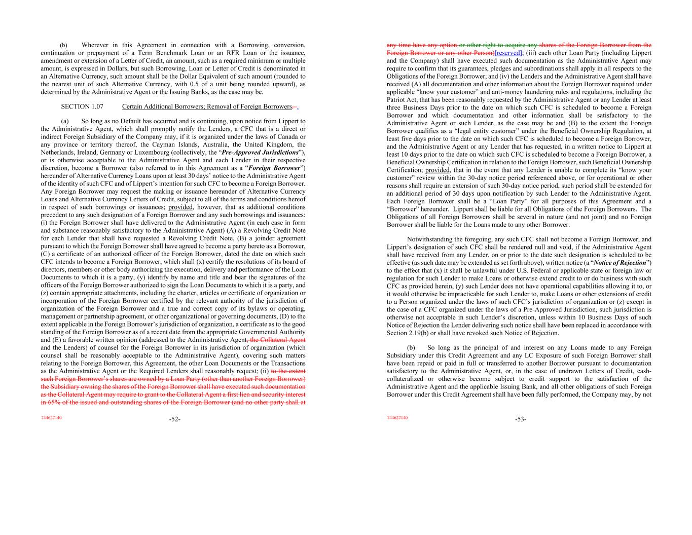744627140 -52- (b) Wherever in this Agreement in connection with a Borrowing, conversion, continuation or prepayment of a Term Benchmark Loan or an RFR Loan or the issuance, amendment or extension of a Letter of Credit, an amount, such as a required minimum or multiple amount, is expressed in Dollars, but such Borrowing, Loan or Letter of Credit is denominated in an Alternative Currency, such amount shall be the Dollar Equivalent of such amount (rounded to the nearest unit of such Alternative Currency, with 0.5 of a unit being rounded upward), as determined by the Administrative Agent or the Issuing Banks, as the case may be. SECTION 1.07 Certain Additional Borrowers; Removal of Foreign Borrowers. . (a) So long as no Default has occurred and is continuing, upon notice from Lippert to the Administrative Agent, which shall promptly notify the Lenders, a CFC that is a direct or indirect Foreign Subsidiary of the Company may, if it is organized under the laws of Canada or any province or territory thereof, the Cayman Islands, Australia, the United Kingdom, the Netherlands, Ireland, Germany or Luxembourg (collectively, the “Pre-Approved Jurisdictions”), or is otherwise acceptable to the Administrative Agent and each Lender in their respective discretion, become a Borrower (also referred to in this Agreement as a “Foreign Borrower”) hereunder of Alternative Currency Loans upon at least 30 days’ notice to the Administrative Agent of the identity of such CFC and of Lippert’s intention for such CFC to become a Foreign Borrower. Any Foreign Borrower may request the making or issuance hereunder of Alternative Currency Loans and Alternative Currency Letters of Credit, subject to all of the terms and conditions hereof in respect of such borrowings or issuances; provided, however, that as additional conditions precedent to any such designation of a Foreign Borrower and any such borrowings and issuances: (i) the Foreign Borrower shall have delivered to the Administrative Agent (in each case in form and substance reasonably satisfactory to the Administrative Agent) (A) a Revolving Credit Note for each Lender that shall have requested a Revolving Credit Note, (B) a joinder agreement pursuant to which the Foreign Borrower shall have agreed to become a party hereto as a Borrower, (C) a certificate of an authorized officer of the Foreign Borrower, dated the date on which such CFC intends to become a Foreign Borrower, which shall (x) certify the resolutions of its board of directors, members or other body authorizing the execution, delivery and performance of the Loan Documents to which it is a party, (y) identify by name and title and bear the signatures of the officers of the Foreign Borrower authorized to sign the Loan Documents to which it is a party, and (z) contain appropriate attachments, including the charter, articles or certificate of organization or incorporation of the Foreign Borrower certified by the relevant authority of the jurisdiction of organization of the Foreign Borrower and a true and correct copy of its bylaws or operating, management or partnership agreement, or other organizational or governing documents, (D) to the extent applicable in the Foreign Borrower’s jurisdiction of organization, a certificate as to the good standing of the Foreign Borrower as of a recent date from the appropriate Governmental Authority and (E) a favorable written opinion (addressed to the Administrative Agent, the Collateral Agent and the Lenders) of counsel for the Foreign Borrower in its jurisdiction of organization (which counsel shall be reasonably acceptable to the Administrative Agent), covering such matters relating to the Foreign Borrower, this Agreement, the other Loan Documents or the Transactions as the Administrative Agent or the Required Lenders shall reasonably request; (ii) to the extent such Foreign Borrower’s shares are owned by a Loan Party (other than another Foreign Borrower) the Subsidiary owning the shares of the Foreign Borrower shall have executed such documentation as the Collateral Agent may require to grant to the Collateral Agent a first lien and security interest in 65% of the issued and outstanding shares of the Foreign Borrower (and no other party shall at 744627140 -53- any time have any option or other right to acquire any shares of the Foreign Borrower from the Foreign Borrower or any other Person)[reserved]; (iii) each other Loan Party (including Lippert and the Company) shall have executed such documentation as the Administrative Agent may require to confirm that its guarantees, pledges and subordinations shall apply in all respects to the Obligations of the Foreign Borrower; and (iv) the Lenders and the Administrative Agent shall have received (A) all documentation and other information about the Foreign Borrower required under applicable “know your customer” and anti-money laundering rules and regulations, including the Patriot Act, that has been reasonably requested by the Administrative Agent or any Lender at least three Business Days prior to the date on which such CFC is scheduled to become a Foreign Borrower and which documentation and other information shall be satisfactory to the Administrative Agent or such Lender, as the case may be and (B) to the extent the Foreign Borrower qualifies as a “legal entity customer” under the Beneficial Ownership Regulation, at least five days prior to the date on which such CFC is scheduled to become a Foreign Borrower, and the Administrative Agent or any Lender that has requested, in a written notice to Lippert at least 10 days prior to the date on which such CFC is scheduled to become a Foreign Borrower, a Beneficial Ownership Certification in relation to the Foreign Borrower, such Beneficial Ownership Certification; provided, that in the event that any Lender is unable to complete its “know your customer” review within the 30-day notice period referenced above, or for operational or other reasons sh