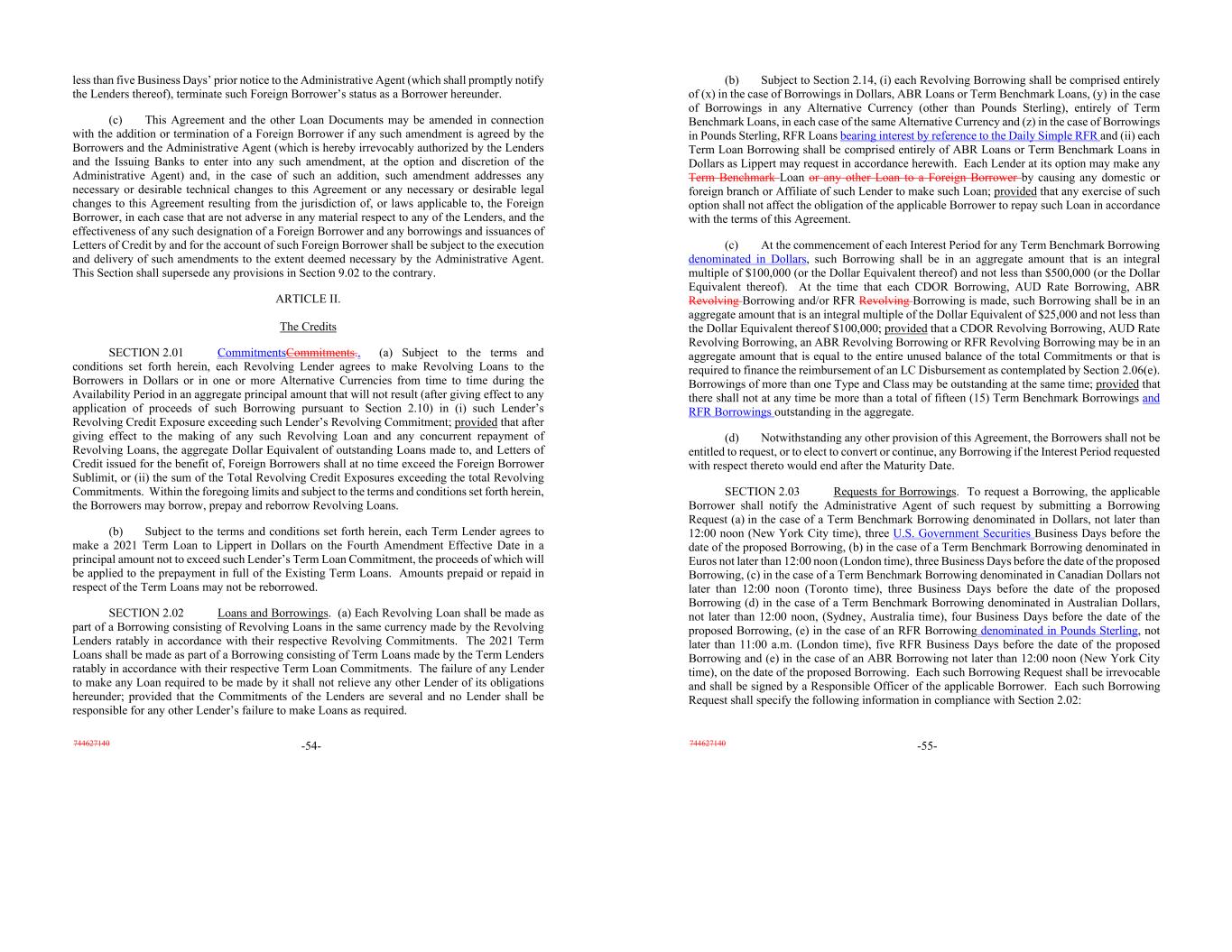 744627140 -54- less than five Business Days’ prior notice to the Administrative Agent (which shall promptly notify the Lenders thereof), terminate such Foreign Borrower’s status as a Borrower hereunder. (c) This Agreement and the other Loan Documents may be amended in connection with the addition or termination of a Foreign Borrower if any such amendment is agreed by the Borrowers and the Administrative Agent (which is hereby irrevocably authorized by the Lenders and the Issuing Banks to enter into any such amendment, at the option and discretion of the Administrative Agent) and, in the case of such an addition, such amendment addresses any necessary or desirable technical changes to this Agreement or any necessary or desirable legal changes to this Agreement resulting from the jurisdiction of, or laws applicable to, the Foreign Borrower, in each case that are not adverse in any material respect to any of the Lenders, and the effectiveness of any such designation of a Foreign Borrower and any borrowings and issuances of Letters of Credit by and for the account of such Foreign Borrower shall be subject to the execution and delivery of such amendments to the extent deemed necessary by the Administrative Agent. This Section shall supersede any provisions in Section 9.02 to the contrary. ARTICLE II. The Credits SECTION 2.01 CommitmentsCommitments.. (a) Subject to the terms and conditions set forth herein, each Revolving Lender agrees to make Revolving Loans to the Borrowers in Dollars or in one or more Alternative Currencies from time to time during the Availability Period in an aggregate principal amount that will not result (after giving effect to any application of proceeds of such Borrowing pursuant to Section 2.10) in (i) such Lender’s Revolving Credit Exposure exceeding such Lender’s Revolving Commitment; provided that after giving effect to the making of any such Revolving Loan and any concurrent repayment of Revolving Loans, the aggregate Dollar Equivalent of outstanding Loans made to, and Letters of Credit issued for the benefit of, Foreign Borrowers shall at no time exceed the Foreign Borrower Sublimit, or (ii) the sum of the Total Revolving Credit Exposures exceeding the total Revolving Commitments. Within the foregoing limits and subject to the terms and conditions set forth herein, the Borrowers may borrow, prepay and reborrow Revolving Loans. (b) Subject to the terms and conditions set forth herein, each Term Lender agrees to make a 2021 Term Loan to Lippert in Dollars on the Fourth Amendment Effective Date in a principal amount not to exceed such Lender’s Term Loan Commitment, the proceeds of which will be applied to the prepayment in full of the Existing Term Loans. Amounts prepaid or repaid in respect of the Term Loans may not be reborrowed. SECTION 2.02 Loans and Borrowings. (a) Each Revolving Loan shall be made as part of a Borrowing consisting of Revolving Loans in the same currency made by the Revolving Lenders ratably in accordance with their respective Revolving Commitments. The 2021 Term Loans shall be made as part of a Borrowing consisting of Term Loans made by the Term Lenders ratably in accordance with their respective Term Loan Commitments. The failure of any Lender to make any Loan required to be made by it shall not relieve any other Lender of its obligations hereunder; provided that the Commitments of the Lenders are several and no Lender shall be responsible for any other Lender’s failure to make Loans as required. 744627140 -55- (b) Subject to Section 2.14, (i) each Revolving Borrowing shall be comprised entirely of (x) in the case of Borrowings in Dollars, ABR Loans or Term Benchmark Loans, (y) in the case of Borrowings in any Alternative Currency (other than Pounds Sterling), entirely of Term Benchmark Loans, in each case of the same Alternative Currency and (z) in the case of Borrowings in Pounds Sterling, RFR Loans bearing interest by reference to the Daily Simple RFR and (ii) each Term Loan Borrowing shall be comprised entirely of ABR Loans or Term Benchmark Loans in Dollars as Lippert may request in accordance herewith. Each Lender at its option may make any Term Benchmark Loan or any other Loan to a Foreign Borrower by causing any domestic or foreign branch or Affiliate of such Lender to make such Loan; provided that any exercise of such option shall not affect the obligation of the applicable Borrower to repay such Loan in accordance with the terms of this Agreement. (c) At the commencement of each Interest Period for any Term Benchmark Borrowing denominated in Dollars, such Borrowing shall be in an aggregate amount that is an integral multiple of $100,000 (or the Dollar Equivalent thereof) and not less than $500,000 (or the Dollar Equivalent thereof). At the time that each CDOR Borrowing, AUD Rate Borrowing, ABR Revolving Borrowing and/or RFR Revolving Borrowing is made, such Borrowing shall be in an aggregate amount that is an integral multiple of the Dollar Equivalent of $25,000 and not less than the Dollar Equivalent thereof $100,000; provided that a CDOR Revolving Borrowing, AUD Rate Revolving Borrowing, an ABR Revolving Borrowing or RFR Revolving Borrowing may be in an aggregate amount that is equal to the entire unused balance of the total Commitments or that is required to finance the reimbursement of an LC Disbursement as contemplated by Section 2.06(e). Borrowings of more than one Type and Class may be outstanding at the same time; provided that there shall not at any time be more than a total of fifteen (15) Term Benchmark Borrowings and RFR Borrowings outstanding in the aggregate. (d) Notwithstanding any other provision of this Agreement, the Borrowers shall not be entitled to request, or to elect to convert or continue, any Borrowing if the Interest Period requested with respect thereto would end after the Maturity Date. SECTION 2.03 Requests for Borrowings. To request a Borrowing, the applicable Borrower shall notify the Admi