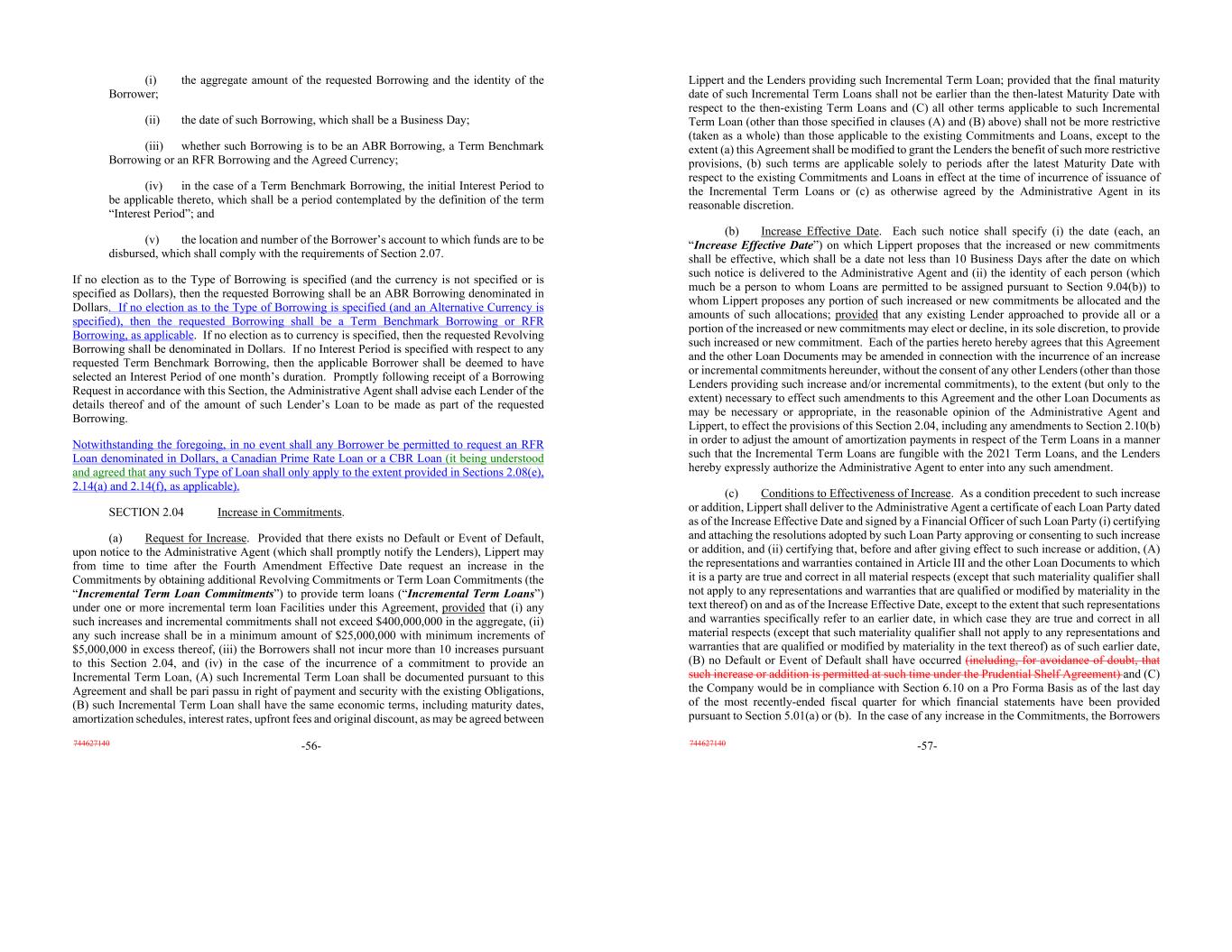 744627140 -56- (i) the aggregate amount of the requested Borrowing and the identity of the Borrower; (ii) the date of such Borrowing, which shall be a Business Day; (iii) whether such Borrowing is to be an ABR Borrowing, a Term Benchmark Borrowing or an RFR Borrowing and the Agreed Currency; (iv) in the case of a Term Benchmark Borrowing, the initial Interest Period to be applicable thereto, which shall be a period contemplated by the definition of the term “Interest Period”; and (v) the location and number of the Borrower’s account to which funds are to be disbursed, which shall comply with the requirements of Section 2.07. If no election as to the Type of Borrowing is specified (and the currency is not specified or is specified as Dollars), then the requested Borrowing shall be an ABR Borrowing denominated in Dollars. If no election as to the Type of Borrowing is specified (and an Alternative Currency is specified), then the requested Borrowing shall be a Term Benchmark Borrowing or RFR Borrowing, as applicable. If no election as to currency is specified, then the requested Revolving Borrowing shall be denominated in Dollars. If no Interest Period is specified with respect to any requested Term Benchmark Borrowing, then the applicable Borrower shall be deemed to have selected an Interest Period of one month’s duration. Promptly following receipt of a Borrowing Request in accordance with this Section, the Administrative Agent shall advise each Lender of the details thereof and of the amount of such Lender’s Loan to be made as part of the requested Borrowing. Notwithstanding the foregoing, in no event shall any Borrower be permitted to request an RFR Loan denominated in Dollars, a Canadian Prime Rate Loan or a CBR Loan (it being understood and agreed that any such Type of Loan shall only apply to the extent provided in Sections 2.08(e), 2.14(a) and 2.14(f), as applicable). SECTION 2.04 Increase in Commitments. (a) Request for Increase. Provided that there exists no Default or Event of Default, upon notice to the Administrative Agent (which shall promptly notify the Lenders), Lippert may from time to time after the Fourth Amendment Effective Date request an increase in the Commitments by obtaining additional Revolving Commitments or Term Loan Commitments (the “Incremental Term Loan Commitments”) to provide term loans (“Incremental Term Loans”) under one or more incremental term loan Facilities under this Agreement, provided that (i) any such increases and incremental commitments shall not exceed $400,000,000 in the aggregate, (ii) any such increase shall be in a minimum amount of $25,000,000 with minimum increments of $5,000,000 in excess thereof, (iii) the Borrowers shall not incur more than 10 increases pursuant to this Section 2.04, and (iv) in the case of the incurrence of a commitment to provide an Incremental Term Loan, (A) such Incremental Term Loan shall be documented pursuant to this Agreement and shall be pari passu in right of payment and security with the existing Obligations, (B) such Incremental Term Loan shall have the same economic terms, including maturity dates, amortization schedules, interest rates, upfront fees and original discount, as may be agreed between 744627140 -57- Lippert and the Lenders providing such Incremental Term Loan; provided that the final maturity date of such Incremental Term Loans shall not be earlier than the then-latest Maturity Date with respect to the then-existing Term Loans and (C) all other terms applicable to such Incremental Term Loan (other than those specified in clauses (A) and (B) above) shall not be more restrictive (taken as a whole) than those applicable to the existing Commitments and Loans, except to the extent (a) this Agreement shall be modified to grant the Lenders the benefit of such more restrictive provisions, (b) such terms are applicable solely to periods after the latest Maturity Date with respect to the existing Commitments and Loans in effect at the time of incurrence of issuance of the Incremental Term Loans or (c) as otherwise agreed by the Administrative Agent in its reasonable discretion. (b) Increase Effective Date. Each such notice shall specify (i) the date (each, an “Increase Effective Date”) on which Lippert proposes that the increased or new commitments shall be effective, which shall be a date not less than 10 Business Days after the date on which such notice is delivered to the Administrative Agent and (ii) the identity of each person (which much be a person to whom Loans are permitted to be assigned pursuant to Section 9.04(b)) to whom Lippert proposes any portion of such increased or new commitments be allocated and the amounts of such allocations; provided that any existing Lender approached to provide all or a portion of the increased or new commitments may elect or decline, in its sole discretion, to provide such increased or new commitment. Each of the parties hereto hereby agrees that this Agreement and the other Loan Documents may be amended in connection with the incurrence of an increase or incremental commitments hereunder, without the consent of any other Lenders (other than those Lenders providing such increase and/or incremental commitments), to the extent (but only to the extent) necessary to effect such amendments to this Agreement and the other Loan Documents as may be necessary or appropriate, in the reasonable opinion of the Administrative Agent and Lippert, to effect the provisions of this Section 2.04, including any amendments to Section 2.10(b) in order to adjust the amount of amortization payments in respect of the Term Loans in a manner such that the Incremental Term Loans are fungible with the 2021 Term Loans, and the Lenders hereby expressly authorize the Administrative Agent to enter into any such amendment. (c) Conditions to Effectiveness of Increase. As a condition precedent to such increase or addition, Lippert shall deliver to the Administrative Agent a c