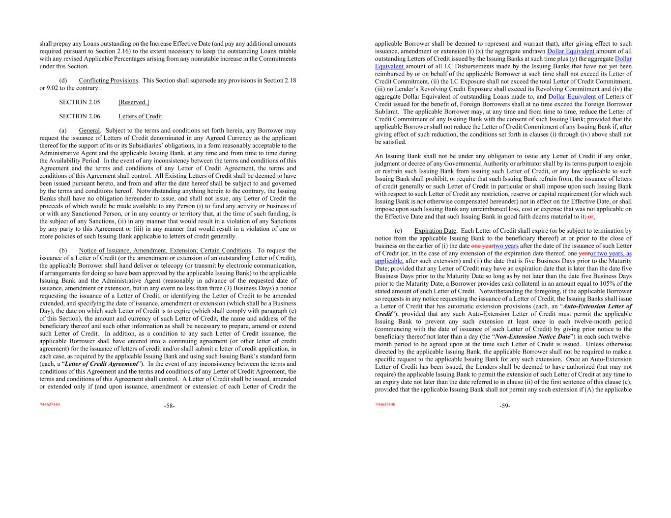 744627140 -58- shall prepay any Loans outstanding on the Increase Effective Date (and pay any additional amounts required pursuant to Section 2.16) to the extent necessary to keep the outstanding Loans ratable with any revised Applicable Percentages arising from any nonratable increase in the Commitments under this Section. (d) Conflicting Provisions. This Section shall supersede any provisions in Section 2.18 or 9.02 to the contrary. SECTION 2.05 [Reserved.] SECTION 2.06 Letters of Credit. (a) General. Subject to the terms and conditions set forth herein, any Borrower may request the issuance of Letters of Credit denominated in any Agreed Currency as the applicant thereof for the support of its or its Subsidiaries’ obligations, in a form reasonably acceptable to the Administrative Agent and the applicable Issuing Bank, at any time and from time to time during the Availability Period. In the event of any inconsistency between the terms and conditions of this Agreement and the terms and conditions of any Letter of Credit Agreement, the terms and conditions of this Agreement shall control. All Existing Letters of Credit shall be deemed to have been issued pursuant hereto, and from and after the date hereof shall be subject to and governed by the terms and conditions hereof. Notwithstanding anything herein to the contrary, the Issuing Banks shall have no obligation hereunder to issue, and shall not issue, any Letter of Credit the proceeds of which would be made available to any Person (i) to fund any activity or business of or with any Sanctioned Person, or in any country or territory that, at the time of such funding, is the subject of any Sanctions, (ii) in any manner that would result in a violation of any Sanctions by any party to this Agreement or (iii) in any manner that would result in a violation of one or more policies of such Issuing Bank applicable to letters of credit generally. (b) Notice of Issuance, Amendment, Extension; Certain Conditions. To request the issuance of a Letter of Credit (or the amendment or extension of an outstanding Letter of Credit), the applicable Borrower shall hand deliver or telecopy (or transmit by electronic communication, if arrangements for doing so have been approved by the applicable Issuing Bank) to the applicable Issuing Bank and the Administrative Agent (reasonably in advance of the requested date of issuance, amendment or extension, but in any event no less than three (3) Business Days) a notice requesting the issuance of a Letter of Credit, or identifying the Letter of Credit to be amended extended, and specifying the date of issuance, amendment or extension (which shall be a Business Day), the date on which such Letter of Credit is to expire (which shall comply with paragraph (c) of this Section), the amount and currency of such Letter of Credit, the name and address of the beneficiary thereof and such other information as shall be necessary to prepare, amend or extend such Letter of Credit. In addition, as a condition to any such Letter of Credit issuance, the applicable Borrower shall have entered into a continuing agreement (or other letter of credit agreement) for the issuance of letters of credit and/or shall submit a letter of credit application, in each case, as required by the applicable Issuing Bank and using such Issuing Bank’s standard form (each, a “Letter of Credit Agreement”). In the event of any inconsistency between the terms and conditions of this Agreement and the terms and conditions of any Letter of Credit Agreement, the terms and conditions of this Agreement shall control. A Letter of Credit shall be issued, amended or extended only if (and upon issuance, amendment or extension of each Letter of Credit the 744627140 -59- applicable Borrower shall be deemed to represent and warrant that), after giving effect to such issuance, amendment or extension (i) (x) the aggregate undrawn Dollar Equivalent amount of all outstanding Letters of Credit issued by the Issuing Banks at such time plus (y) the aggregate Dollar Equivalent amount of all LC Disbursements made by the Issuing Banks that have not yet been reimbursed by or on behalf of the applicable Borrower at such time shall not exceed its Letter of Credit Commitment, (ii) the LC Exposure shall not exceed the total Letter of Credit Commitment, (iii) no Lender’s Revolving Credit Exposure shall exceed its Revolving Commitment and (iv) the aggregate Dollar Equivalent of outstanding Loans made to, and Dollar Equivalent of Letters of Credit issued for the benefit of, Foreign Borrowers shall at no time exceed the Foreign Borrower Sublimit. The applicable Borrower may, at any time and from time to time, reduce the Letter of Credit Commitment of any Issuing Bank with the consent of such Issuing Bank; provided that the applicable Borrower shall not reduce the Letter of Credit Commitment of any Issuing Bank if, after giving effect of such reduction, the conditions set forth in clauses (i) through (iv) above shall not be satisfied. An Issuing Bank shall not be under any obligation to issue any Letter of Credit if any order, judgment or decree of any Governmental Authority or arbitrator shall by its terms purport to enjoin or restrain such Issuing Bank from issuing such Letter of Credit, or any law applicable to such Issuing Bank shall prohibit, or require that such Issuing Bank refrain from, the issuance of letters of credit generally or such Letter of Credit in particular or shall impose upon such Issuing Bank with respect to such Letter of Credit any restriction, reserve or capital requirement (for which such Issuing Bank is not otherwise compensated hereunder) not in effect on the Effective Date, or shall impose upon such Issuing Bank any unreimbursed loss, cost or expense that was not applicable on the Effective Date and that such Issuing Bank in good faith deems material to it; or. (c) Expiration Date. Each Letter of Credit shall expire (or be subject to termination by noti