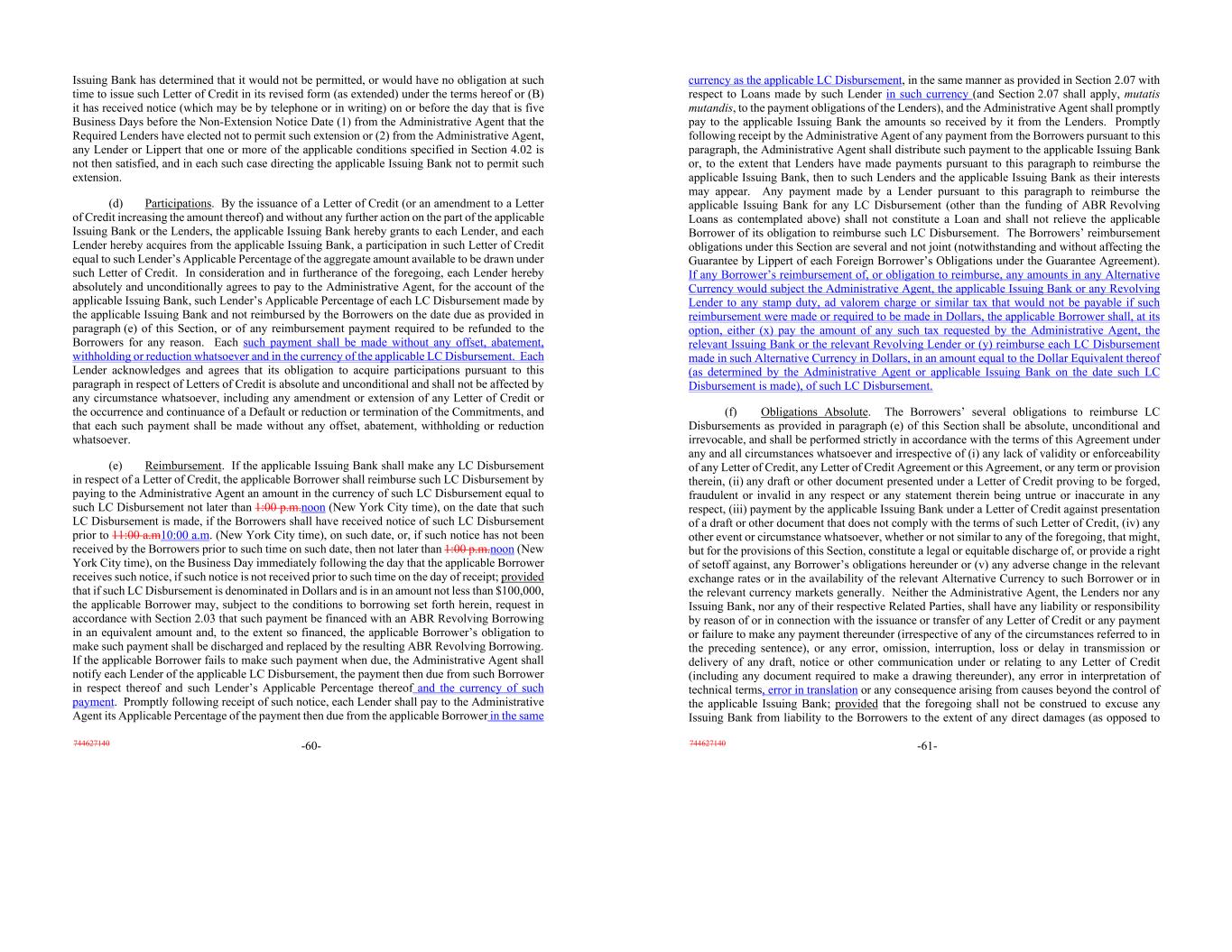 744627140 -60- Issuing Bank has determined that it would not be permitted, or would have no obligation at such time to issue such Letter of Credit in its revised form (as extended) under the terms hereof or (B) it has received notice (which may be by telephone or in writing) on or before the day that is five Business Days before the Non-Extension Notice Date (1) from the Administrative Agent that the Required Lenders have elected not to permit such extension or (2) from the Administrative Agent, any Lender or Lippert that one or more of the applicable conditions specified in Section 4.02 is not then satisfied, and in each such case directing the applicable Issuing Bank not to permit such extension. (d) Participations. By the issuance of a Letter of Credit (or an amendment to a Letter of Credit increasing the amount thereof) and without any further action on the part of the applicable Issuing Bank or the Lenders, the applicable Issuing Bank hereby grants to each Lender, and each Lender hereby acquires from the applicable Issuing Bank, a participation in such Letter of Credit equal to such Lender’s Applicable Percentage of the aggregate amount available to be drawn under such Letter of Credit. In consideration and in furtherance of the foregoing, each Lender hereby absolutely and unconditionally agrees to pay to the Administrative Agent, for the account of the applicable Issuing Bank, such Lender’s Applicable Percentage of each LC Disbursement made by the applicable Issuing Bank and not reimbursed by the Borrowers on the date due as provided in paragraph (e) of this Section, or of any reimbursement payment required to be refunded to the Borrowers for any reason. Each such payment shall be made without any offset, abatement, withholding or reduction whatsoever and in the currency of the applicable LC Disbursement. Each Lender acknowledges and agrees that its obligation to acquire participations pursuant to this paragraph in respect of Letters of Credit is absolute and unconditional and shall not be affected by any circumstance whatsoever, including any amendment or extension of any Letter of Credit or the occurrence and continuance of a Default or reduction or termination of the Commitments, and that each such payment shall be made without any offset, abatement, withholding or reduction whatsoever. (e) Reimbursement. If the applicable Issuing Bank shall make any LC Disbursement in respect of a Letter of Credit, the applicable Borrower shall reimburse such LC Disbursement by paying to the Administrative Agent an amount in the currency of such LC Disbursement equal to such LC Disbursement not later than 1:00 p.m.noon (New York City time), on the date that such LC Disbursement is made, if the Borrowers shall have received notice of such LC Disbursement prior to 11:00 a.m10:00 a.m. (New York City time), on such date, or, if such notice has not been received by the Borrowers prior to such time on such date, then not later than 1:00 p.m.noon (New York City time), on the Business Day immediately following the day that the applicable Borrower receives such notice, if such notice is not received prior to such time on the day of receipt; provided that if such LC Disbursement is denominated in Dollars and is in an amount not less than $100,000, the applicable Borrower may, subject to the conditions to borrowing set forth herein, request in accordance with Section 2.03 that such payment be financed with an ABR Revolving Borrowing in an equivalent amount and, to the extent so financed, the applicable Borrower’s obligation to make such payment shall be discharged and replaced by the resulting ABR Revolving Borrowing. If the applicable Borrower fails to make such payment when due, the Administrative Agent shall notify each Lender of the applicable LC Disbursement, the payment then due from such Borrower in respect thereof and such Lender’s Applicable Percentage thereof and the currency of such payment. Promptly following receipt of such notice, each Lender shall pay to the Administrative Agent its Applicable Percentage of the payment then due from the applicable Borrower in the same 744627140 -61- currency as the applicable LC Disbursement, in the same manner as provided in Section 2.07 with respect to Loans made by such Lender in such currency (and Section 2.07 shall apply, mutatis mutandis, to the payment obligations of the Lenders), and the Administrative Agent shall promptly pay to the applicable Issuing Bank the amounts so received by it from the Lenders. Promptly following receipt by the Administrative Agent of any payment from the Borrowers pursuant to this paragraph, the Administrative Agent shall distribute such payment to the applicable Issuing Bank or, to the extent that Lenders have made payments pursuant to this paragraph to reimburse the applicable Issuing Bank, then to such Lenders and the applicable Issuing Bank as their interests may appear. Any payment made by a Lender pursuant to this paragraph to reimburse the applicable Issuing Bank for any LC Disbursement (other than the funding of ABR Revolving Loans as contemplated above) shall not constitute a Loan and shall not relieve the applicable Borrower of its obligation to reimburse such LC Disbursement. The Borrowers’ reimbursement obligations under this Section are several and not joint (notwithstanding and without affecting the Guarantee by Lippert of each Foreign Borrower’s Obligations under the Guarantee Agreement). If any Borrower’s reimbursement of, or obligation to reimburse, any amounts in any Alternative Currency would subject the Administrative Agent, the applicable Issuing Bank or any Revolving Lender to any stamp duty, ad valorem charge or similar tax that would not be payable if such reimbursement were made or required to be made in Dollars, the applicable Borrower shall, at its option, either (x) pay the amount of any such tax requested by the Administrative Agent, the relevant Issuing Bank or the relevant Revo