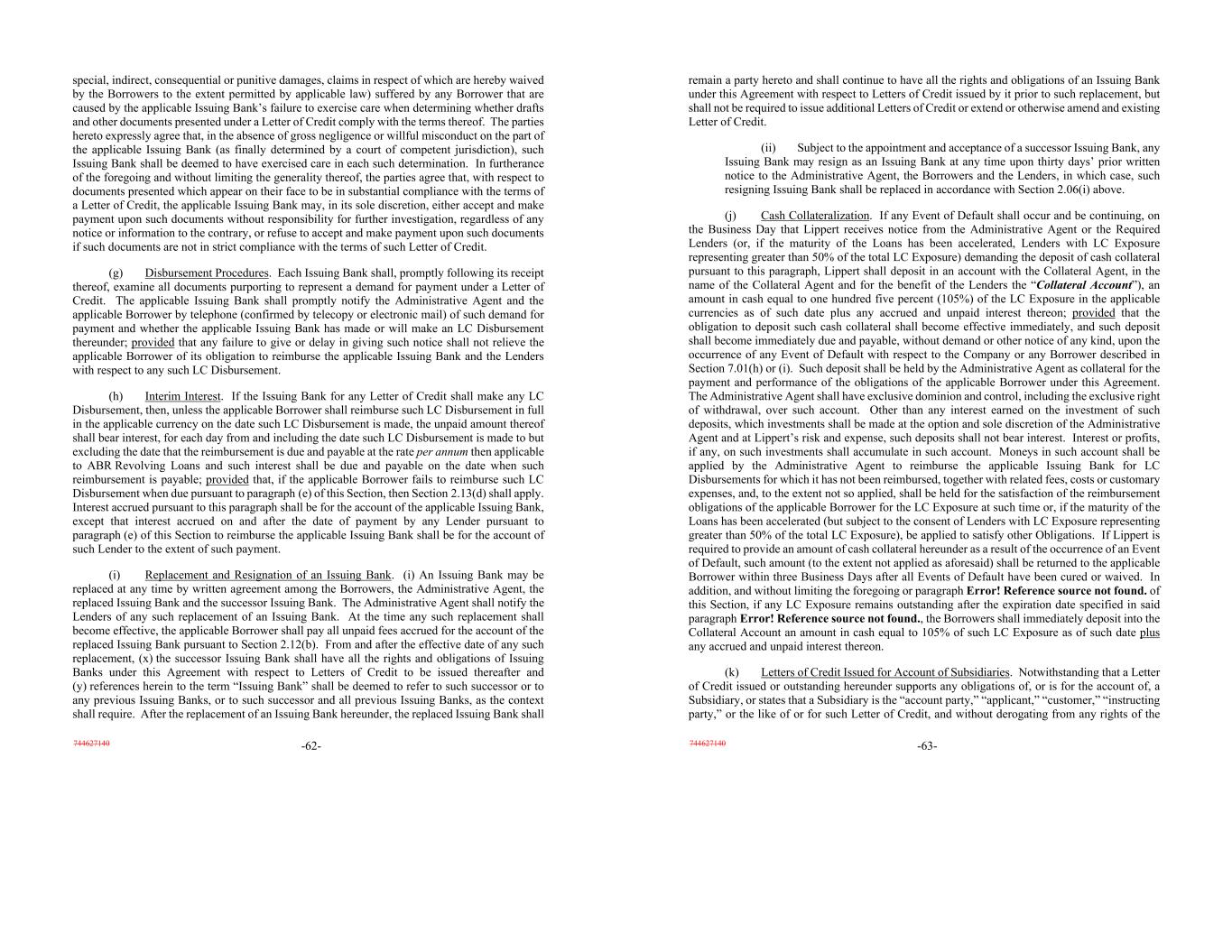 744627140 -62- special, indirect, consequential or punitive damages, claims in respect of which are hereby waived by the Borrowers to the extent permitted by applicable law) suffered by any Borrower that are caused by the applicable Issuing Bank’s failure to exercise care when determining whether drafts and other documents presented under a Letter of Credit comply with the terms thereof. The parties hereto expressly agree that, in the absence of gross negligence or willful misconduct on the part of the applicable Issuing Bank (as finally determined by a court of competent jurisdiction), such Issuing Bank shall be deemed to have exercised care in each such determination. In furtherance of the foregoing and without limiting the generality thereof, the parties agree that, with respect to documents presented which appear on their face to be in substantial compliance with the terms of a Letter of Credit, the applicable Issuing Bank may, in its sole discretion, either accept and make payment upon such documents without responsibility for further investigation, regardless of any notice or information to the contrary, or refuse to accept and make payment upon such documents if such documents are not in strict compliance with the terms of such Letter of Credit. (g) Disbursement Procedures. Each Issuing Bank shall, promptly following its receipt thereof, examine all documents purporting to represent a demand for payment under a Letter of Credit. The applicable Issuing Bank shall promptly notify the Administrative Agent and the applicable Borrower by telephone (confirmed by telecopy or electronic mail) of such demand for payment and whether the applicable Issuing Bank has made or will make an LC Disbursement thereunder; provided that any failure to give or delay in giving such notice shall not relieve the applicable Borrower of its obligation to reimburse the applicable Issuing Bank and the Lenders with respect to any such LC Disbursement. (h) Interim Interest. If the Issuing Bank for any Letter of Credit shall make any LC Disbursement, then, unless the applicable Borrower shall reimburse such LC Disbursement in full in the applicable currency on the date such LC Disbursement is made, the unpaid amount thereof shall bear interest, for each day from and including the date such LC Disbursement is made to but excluding the date that the reimbursement is due and payable at the rate per annum then applicable to ABR Revolving Loans and such interest shall be due and payable on the date when such reimbursement is payable; provided that, if the applicable Borrower fails to reimburse such LC Disbursement when due pursuant to paragraph (e) of this Section, then Section 2.13(d) shall apply. Interest accrued pursuant to this paragraph shall be for the account of the applicable Issuing Bank, except that interest accrued on and after the date of payment by any Lender pursuant to paragraph (e) of this Section to reimburse the applicable Issuing Bank shall be for the account of such Lender to the extent of such payment. (i) Replacement and Resignation of an Issuing Bank. (i) An Issuing Bank may be replaced at any time by written agreement among the Borrowers, the Administrative Agent, the replaced Issuing Bank and the successor Issuing Bank. The Administrative Agent shall notify the Lenders of any such replacement of an Issuing Bank. At the time any such replacement shall become effective, the applicable Borrower shall pay all unpaid fees accrued for the account of the replaced Issuing Bank pursuant to Section 2.12(b). From and after the effective date of any such replacement, (x) the successor Issuing Bank shall have all the rights and obligations of Issuing Banks under this Agreement with respect to Letters of Credit to be issued thereafter and (y) references herein to the term “Issuing Bank” shall be deemed to refer to such successor or to any previous Issuing Banks, or to such successor and all previous Issuing Banks, as the context shall require. After the replacement of an Issuing Bank hereunder, the replaced Issuing Bank shall 744627140 -63- remain a party hereto and shall continue to have all the rights and obligations of an Issuing Bank under this Agreement with respect to Letters of Credit issued by it prior to such replacement, but shall not be required to issue additional Letters of Credit or extend or otherwise amend and existing Letter of Credit. (ii) Subject to the appointment and acceptance of a successor Issuing Bank, any Issuing Bank may resign as an Issuing Bank at any time upon thirty days’ prior written notice to the Administrative Agent, the Borrowers and the Lenders, in which case, such resigning Issuing Bank shall be replaced in accordance with Section 2.06(i) above. (j) Cash Collateralization. If any Event of Default shall occur and be continuing, on the Business Day that Lippert receives notice from the Administrative Agent or the Required Lenders (or, if the maturity of the Loans has been accelerated, Lenders with LC Exposure representing greater than 50% of the total LC Exposure) demanding the deposit of cash collateral pursuant to this paragraph, Lippert shall deposit in an account with the Collateral Agent, in the name of the Collateral Agent and for the benefit of the Lenders the “Collateral Account”), an amount in cash equal to one hundred five percent (105%) of the LC Exposure in the applicable currencies as of such date plus any accrued and unpaid interest thereon; provided that the obligation to deposit such cash collateral shall become effective immediately, and such deposit shall become immediately due and payable, without demand or other notice of any kind, upon the occurrence of any Event of Default with respect to the Company or any Borrower described in Section 7.01(h) or (i). Such deposit shall be held by the Administrative Agent as collateral for the payment and performance of the obligations of the applicable Borrower under this Agreement. The Administrative 