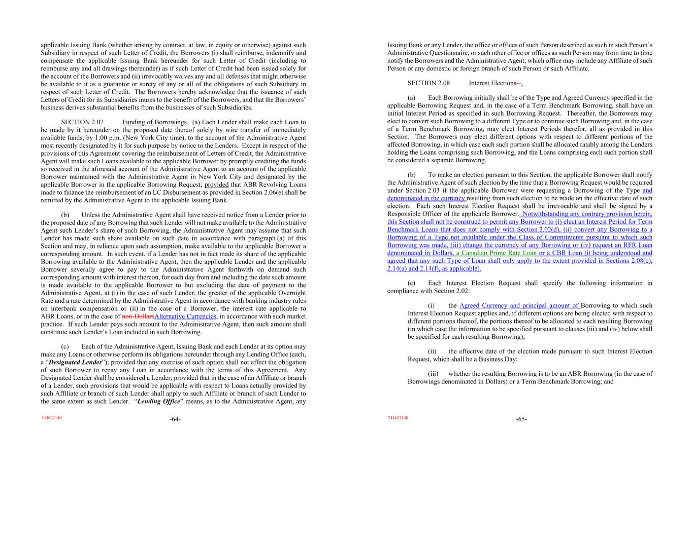 744627140 -64- applicable Issuing Bank (whether arising by contract, at law, in equity or otherwise) against such Subsidiary in respect of such Letter of Credit, the Borrowers (i) shall reimburse, indemnify and compensate the applicable Issuing Bank hereunder for such Letter of Credit (including to reimburse any and all drawings thereunder) as if such Letter of Credit had been issued solely for the account of the Borrowers and (ii) irrevocably waives any and all defenses that might otherwise be available to it as a guarantor or surety of any or all of the obligations of such Subsidiary in respect of such Letter of Credit. The Borrowers hereby acknowledge that the issuance of such Letters of Credit for its Subsidiaries inures to the benefit of the Borrowers, and that the Borrowers’ business derives substantial benefits from the businesses of such Subsidiaries. SECTION 2.07 Funding of Borrowings. (a) Each Lender shall make each Loan to be made by it hereunder on the proposed date thereof solely by wire transfer of immediately available funds, by 1:00 p.m. (New York City time), to the account of the Administrative Agent most recently designated by it for such purpose by notice to the Lenders. Except in respect of the provisions of this Agreement covering the reimbursement of Letters of Credit, the Administrative Agent will make such Loans available to the applicable Borrower by promptly crediting the funds so received in the aforesaid account of the Administrative Agent to an account of the applicable Borrower maintained with the Administrative Agent in New York City and designated by the applicable Borrower in the applicable Borrowing Request; provided that ABR Revolving Loans made to finance the reimbursement of an LC Disbursement as provided in Section 2.06(e) shall be remitted by the Administrative Agent to the applicable Issuing Bank. (b) Unless the Administrative Agent shall have received notice from a Lender prior to the proposed date of any Borrowing that such Lender will not make available to the Administrative Agent such Lender’s share of such Borrowing, the Administrative Agent may assume that such Lender has made such share available on such date in accordance with paragraph (a) of this Section and may, in reliance upon such assumption, make available to the applicable Borrower a corresponding amount. In such event, if a Lender has not in fact made its share of the applicable Borrowing available to the Administrative Agent, then the applicable Lender and the applicable Borrower severally agree to pay to the Administrative Agent forthwith on demand such corresponding amount with interest thereon, for each day from and including the date such amount is made available to the applicable Borrower to but excluding the date of payment to the Administrative Agent, at (i) in the case of such Lender, the greater of the applicable Overnight Rate and a rate determined by the Administrative Agent in accordance with banking industry rules on interbank compensation or (ii) in the case of a Borrower, the interest rate applicable to ABR Loans, or in the case of non-DollarsAlternative Currencies, in accordance with such market practice. If such Lender pays such amount to the Administrative Agent, then such amount shall constitute such Lender’s Loan included in such Borrowing. (c) Each of the Administrative Agent, Issuing Bank and each Lender at its option may make any Loans or otherwise perform its obligations hereunder through any Lending Office (each, a “Designated Lender”); provided that any exercise of such option shall not affect the obligation of such Borrower to repay any Loan in accordance with the terms of this Agreement. Any Designated Lender shall be considered a Lender; provided that in the case of an Affiliate or branch of a Lender, such provisions that would be applicable with respect to Loans actually provided by such Affiliate or branch of such Lender shall apply to such Affiliate or branch of such Lender to the same extent as such Lender. “Lending Office” means, as to the Administrative Agent, any 744627140 -65- Issuing Bank or any Lender, the office or offices of such Person described as such in such Person’s Administrative Questionnaire, or such other office or offices as such Person may from time to time notify the Borrowers and the Administrative Agent; which office may include any Affiliate of such Person or any domestic or foreign branch of such Person or such Affiliate. SECTION 2.08 Interest Elections. . (a) Each Borrowing initially shall be of the Type and Agreed Currency specified in the applicable Borrowing Request and, in the case of a Term Benchmark Borrowing, shall have an initial Interest Period as specified in such Borrowing Request. Thereafter, the Borrowers may elect to convert such Borrowing to a different Type or to continue such Borrowing and, in the case of a Term Benchmark Borrowing, may elect Interest Periods therefor, all as provided in this Section. The Borrowers may elect different options with respect to different portions of the affected Borrowing, in which case each such portion shall be allocated ratably among the Lenders holding the Loans comprising such Borrowing, and the Loans comprising each such portion shall be considered a separate Borrowing. (b) To make an election pursuant to this Section, the applicable Borrower shall notify the Administrative Agent of such election by the time that a Borrowing Request would be required under Section 2.03 if the applicable Borrower were requesting a Borrowing of the Type and denominated in the currency resulting from such election to be made on the effective date of such election. Each such Interest Election Request shall be irrevocable and shall be signed by a Responsible Officer of the applicable Borrower. Notwithstanding any contrary provision herein, this Section shall not be construed to permit any Borrower to (i) elect an Interest Period for Term Benchmark Loans that does not comply wi