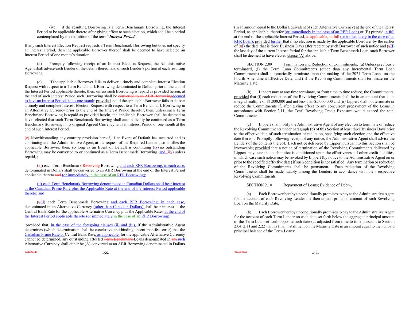 744627140 -66- (iv) if the resulting Borrowing is a Term Benchmark Borrowing, the Interest Period to be applicable thereto after giving effect to such election, which shall be a period contemplated by the definition of the term “Interest Period”. If any such Interest Election Request requests a Term Benchmark Borrowing but does not specify an Interest Period, then the applicable Borrower thereof shall be deemed to have selected an Interest Period of one month’s duration. (d) Promptly following receipt of an Interest Election Request, the Administrative Agent shall advise each Lender of the details thereof and of such Lender’s portion of each resulting Borrowing. (e) If the applicable Borrower fails to deliver a timely and complete Interest Election Request with respect to a Term Benchmark Borrowing denominated in Dollars prior to the end of the Interest Period applicable thereto, then, unless such Borrowing is repaid as provided herein, at the end of such Interest Period such Borrowing shall be converted to an ABR Borrowingdeemed to have an Interest Period that is one month; provided that if the applicable Borrower fails to deliver a timely and complete Interest Election Request with respect to a Term Benchmark Borrowing in an Alternative Currency prior to the end of the Interest Period therefor, then, unless such Term Benchmark Borrowing is repaid as provided herein, the applicable Borrower shall be deemed to have selected that such Term Benchmark Borrowing shall automatically be continued as a Term Benchmark Borrowing in its original Agreed Currency with an Interest Period of one month at the end of such Interest Period. (e) Notwithstanding any contrary provision hereof, if an Event of Default has occurred and is continuing and the Administrative Agent, at the request of the Required Lenders, so notifies the applicable Borrower, then, so long as an Event of Default is continuing (ix) no outstanding Borrowing may be converted to or continued as a Term Benchmark Borrowing, and (iiy) unless repaid, : (xi) each Term Benchmark Revolving Borrowing and each RFR Borrowing, in each case, denominated in Dollars shall be converted to an ABR Borrowing at the end of the Interest Period applicable thereto and (or immediately in the case of an RFR Borrowing); (ii) each Term Benchmark Borrowing denominated in Canadian Dollars shall bear interest at the Canadian Prime Rate plus the Applicable Rate at the end of the Interest Period applicable thereto; and (yiii) each Term Benchmark Borrowing and each RFR Borrowing, in each case, denominated in an Alternative Currency (other than Canadian Dollars) shall bear interest at the Central Bank Rate for the applicable Alternative Currency plus the Applicable Rate; at the end of the Interest Period applicable thereto (or immediately in the case of an RFR Borrowing); provided that, in the case of the foregoing clauses (ii) and (iii), if the Administrative Agent determines (which determination shall be conclusive and binding absent manifest error) that the Canadian Prime Rate or Central Bank Rate, as applicable, for the applicable Alternative Currency cannot be determined, any outstanding affected Term Benchmark Loans denominated in anysuch Alternative Currency shall either be (A) converted to an ABR Borrowing denominated in Dollars 744627140 -67- (in an amount equal to the Dollar Equivalent of such Alternative Currency) at the end of the Interest Period, as applicable, therefor (or immediately in the case of an RFR Loan) or (B) prepaid in full at the end of the applicable Interest Period, as applicable, in full (or immediately in the case of an RFR Loan); provided further that if no election is made by the applicable Borrower by the earlier of (xI) the date that is three Business Days after receipt by such Borrower of such notice and (yII) the last day of the current Interest Period for the applicable Term Benchmark Loan, such Borrower shall be deemed to have elected clause (A) above. SECTION 2.09 Termination and Reduction of Commitments. (a) Unless previously terminated, (i) the Term Loan Commitments (other than any Incremental Term Loan Commitments) shall automatically terminate upon the making of the 2021 Term Loans on the Fourth Amendment Effective Date, and (ii) the Revolving Commitments shall terminate on the Maturity Date. (b) Lippert may at any time terminate, or from time to time reduce, the Commitments; provided that (i) each reduction of the Revolving Commitments shall be in an amount that is an integral multiple of $1,000,000 and not less than $5,000,000 and (ii) Lippert shall not terminate or reduce the Commitments if, after giving effect to any concurrent prepayment of the Loans in accordance with Section 2.11, the Total Revolving Credit Exposure would exceed the total Commitments. (c) Lippert shall notify the Administrative Agent of any election to terminate or reduce the Revolving Commitments under paragraph (b) of this Section at least three Business Days prior to the effective date of such termination or reduction, specifying such election and the effective date thereof. Promptly following receipt of any notice, the Administrative Agent shall advise the Lenders of the contents thereof. Each notice delivered by Lippert pursuant to this Section shall be irrevocable; provided that a notice of termination of the Revolving Commitments delivered by Lippert may state that such notice is conditioned upon the effectiveness of other credit facilities, in which case such notice may be revoked by Lippert (by notice to the Administrative Agent on or prior to the specified effective date) if such condition is not satisfied. Any termination or reduction of the Revolving Commitments shall be permanent. Each reduction of the Revolving Commitments shall be made ratably among the Lenders in accordance with their respective Revolving Commitments. SECTION 2.10 Repayment of Loans; Evidence of Debt. . (a) Each Borrower hereby unconditionally promises to pay to 
