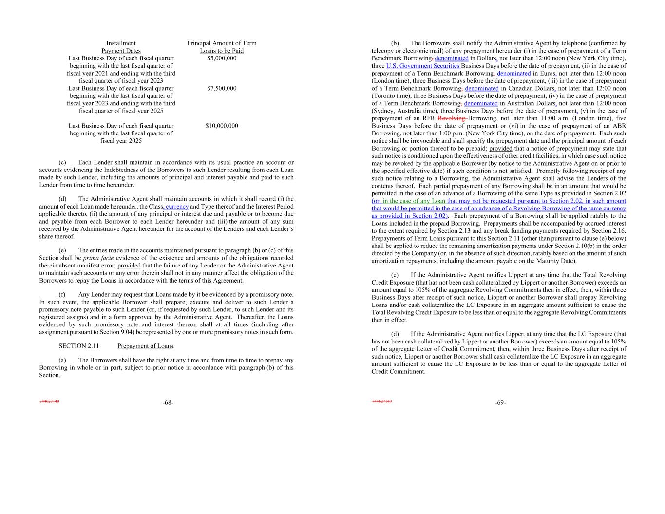 744627140 -68- Installment Payment Dates Principal Amount of Term Loans to be Paid Last Business Day of each fiscal quarter beginning with the last fiscal quarter of fiscal year 2021 and ending with the third fiscal quarter of fiscal year 2023 $5,000,000 Last Business Day of each fiscal quarter beginning with the last fiscal quarter of fiscal year 2023 and ending with the third fiscal quarter of fiscal year 2025 $7,500,000 Last Business Day of each fiscal quarter beginning with the last fiscal quarter of fiscal year 2025 $10,000,000 (c) Each Lender shall maintain in accordance with its usual practice an account or accounts evidencing the Indebtedness of the Borrowers to such Lender resulting from each Loan made by such Lender, including the amounts of principal and interest payable and paid to such Lender from time to time hereunder. (d) The Administrative Agent shall maintain accounts in which it shall record (i) the amount of each Loan made hereunder, the Class, currency and Type thereof and the Interest Period applicable thereto, (ii) the amount of any principal or interest due and payable or to become due and payable from each Borrower to each Lender hereunder and (iii) the amount of any sum received by the Administrative Agent hereunder for the account of the Lenders and each Lender’s share thereof. (e) The entries made in the accounts maintained pursuant to paragraph (b) or (c) of this Section shall be prima facie evidence of the existence and amounts of the obligations recorded therein absent manifest error; provided that the failure of any Lender or the Administrative Agent to maintain such accounts or any error therein shall not in any manner affect the obligation of the Borrowers to repay the Loans in accordance with the terms of this Agreement. (f) Any Lender may request that Loans made by it be evidenced by a promissory note. In such event, the applicable Borrower shall prepare, execute and deliver to such Lender a promissory note payable to such Lender (or, if requested by such Lender, to such Lender and its registered assigns) and in a form approved by the Administrative Agent. Thereafter, the Loans evidenced by such promissory note and interest thereon shall at all times (including after assignment pursuant to Section 9.04) be represented by one or more promissory notes in such form. SECTION 2.11 Prepayment of Loans. (a) The Borrowers shall have the right at any time and from time to time to prepay any Borrowing in whole or in part, subject to prior notice in accordance with paragraph (b) of this Section. 744627140 -69- (b) The Borrowers shall notify the Administrative Agent by telephone (confirmed by telecopy or electronic mail) of any prepayment hereunder (i) in the case of prepayment of a Term Benchmark Borrowing, denominated in Dollars, not later than 12:00 noon (New York City time), three U.S. Government Securities Business Days before the date of prepayment, (ii) in the case of prepayment of a Term Benchmark Borrowing, denominated in Euros, not later than 12:00 noon (London time), three Business Days before the date of prepayment, (iii) in the case of prepayment of a Term Benchmark Borrowing, denominated in Canadian Dollars, not later than 12:00 noon (Toronto time), three Business Days before the date of prepayment, (iv) in the case of prepayment of a Term Benchmark Borrowing, denominated in Australian Dollars, not later than 12:00 noon (Sydney, Australia time), three Business Days before the date of prepayment, (v) in the case of prepayment of an RFR Revolving Borrowing, not later than 11:00 a.m. (London time), five Business Days before the date of prepayment or (vi) in the case of prepayment of an ABR Borrowing, not later than 1:00 p.m. (New York City time), on the date of prepayment. Each such notice shall be irrevocable and shall specify the prepayment date and the principal amount of each Borrowing or portion thereof to be prepaid; provided that a notice of prepayment may state that such notice is conditioned upon the effectiveness of other credit facilities, in which case such notice may be revoked by the applicable Borrower (by notice to the Administrative Agent on or prior to the specified effective date) if such condition is not satisfied. Promptly following receipt of any such notice relating to a Borrowing, the Administrative Agent shall advise the Lenders of the contents thereof. Each partial prepayment of any Borrowing shall be in an amount that would be permitted in the case of an advance of a Borrowing of the same Type as provided in Section 2.02 (or, in the case of any Loan that may not be requested pursuant to Section 2.02, in such amount that would be permitted in the case of an advance of a Revolving Borrowing of the same currency as provided in Section 2.02). Each prepayment of a Borrowing shall be applied ratably to the Loans included in the prepaid Borrowing. Prepayments shall be accompanied by accrued interest to the extent required by Section 2.13 and any break funding payments required by Section 2.16. Prepayments of Term Loans pursuant to this Section 2.11 (other than pursuant to clause (e) below) shall be applied to reduce the remaining amortization payments under Section 2.10(b) in the order directed by the Company (or, in the absence of such direction, ratably based on the amount of such amortization repayments, including the amount payable on the Maturity Date). (c) If the Administrative Agent notifies Lippert at any time that the Total Revolving Credit Exposure (that has not been cash collateralized by Lippert or another Borrower) exceeds an amount equal to 105% of the aggregate Revolving Commitments then in effect, then, within three Business Days after receipt of such notice, Lippert or another Borrower shall prepay Revolving Loans and/or cash collateralize the LC Exposure in an aggregate amount sufficient to cause the Total Revolving Credit Exposure to be less than or equal to the aggregate Revolving Commitments then in effect. (d)