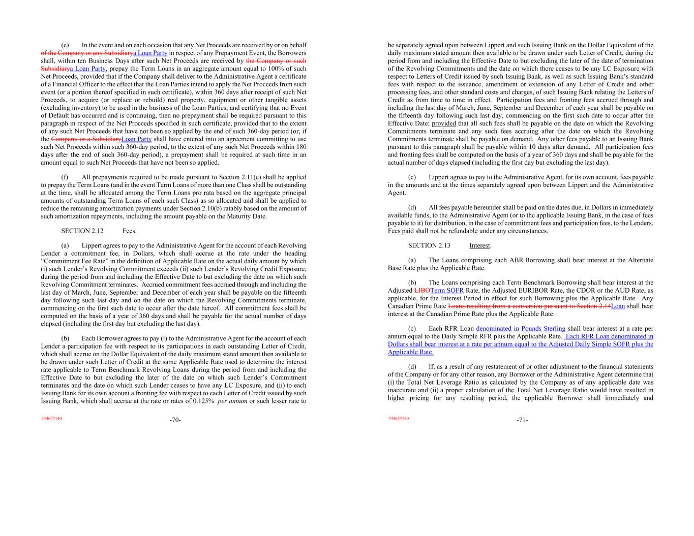 744627140 -70- (e) In the event and on each occasion that any Net Proceeds are received by or on behalf of the Company or any Subsidiarya Loan Party in respect of any Prepayment Event, the Borrowers shall, within ten Business Days after such Net Proceeds are received by the Company or such Subsidiarya Loan Party, prepay the Term Loans in an aggregate amount equal to 100% of such Net Proceeds, provided that if the Company shall deliver to the Administrative Agent a certificate of a Financial Officer to the effect that the Loan Parties intend to apply the Net Proceeds from such event (or a portion thereof specified in such certificate), within 360 days after receipt of such Net Proceeds, to acquire (or replace or rebuild) real property, equipment or other tangible assets (excluding inventory) to be used in the business of the Loan Parties, and certifying that no Event of Default has occurred and is continuing, then no prepayment shall be required pursuant to this paragraph in respect of the Net Proceeds specified in such certificate, provided that to the extent of any such Net Proceeds that have not been so applied by the end of such 360-day period (or, if the Company or a SubsidiaryLoan Party shall have entered into an agreement committing to use such Net Proceeds within such 360-day period, to the extent of any such Net Proceeds within 180 days after the end of such 360-day period), a prepayment shall be required at such time in an amount equal to such Net Proceeds that have not been so applied. (f) All prepayments required to be made pursuant to Section 2.11(e) shall be applied to prepay the Term Loans (and in the event Term Loans of more than one Class shall be outstanding at the time, shall be allocated among the Term Loans pro rata based on the aggregate principal amounts of outstanding Term Loans of each such Class) as so allocated and shall be applied to reduce the remaining amortization payments under Section 2.10(b) ratably based on the amount of such amortization repayments, including the amount payable on the Maturity Date. SECTION 2.12 Fees. (a) Lippert agrees to pay to the Administrative Agent for the account of each Revolving Lender a commitment fee, in Dollars, which shall accrue at the rate under the heading “Commitment Fee Rate” in the definition of Applicable Rate on the actual daily amount by which (i) such Lender’s Revolving Commitment exceeds (ii) such Lender’s Revolving Credit Exposure, during the period from and including the Effective Date to but excluding the date on which such Revolving Commitment terminates. Accrued commitment fees accrued through and including the last day of March, June, September and December of each year shall be payable on the fifteenth day following such last day and on the date on which the Revolving Commitments terminate, commencing on the first such date to occur after the date hereof. All commitment fees shall be computed on the basis of a year of 360 days and shall be payable for the actual number of days elapsed (including the first day but excluding the last day). (b) Each Borrower agrees to pay (i) to the Administrative Agent for the account of each Lender a participation fee with respect to its participations in each outstanding Letter of Credit, which shall accrue on the Dollar Equivalent of the daily maximum stated amount then available to be drawn under such Letter of Credit at the same Applicable Rate used to determine the interest rate applicable to Term Benchmark Revolving Loans during the period from and including the Effective Date to but excluding the later of the date on which such Lender’s Commitment terminates and the date on which such Lender ceases to have any LC Exposure, and (ii) to each Issuing Bank for its own account a fronting fee with respect to each Letter of Credit issued by such Issuing Bank, which shall accrue at the rate or rates of 0.125% per annum or such lesser rate to 744627140 -71- be separately agreed upon between Lippert and such Issuing Bank on the Dollar Equivalent of the daily maximum stated amount then available to be drawn under such Letter of Credit, during the period from and including the Effective Date to but excluding the later of the date of termination of the Revolving Commitments and the date on which there ceases to be any LC Exposure with respect to Letters of Credit issued by such Issuing Bank, as well as such Issuing Bank’s standard fees with respect to the issuance, amendment or extension of any Letter of Credit and other processing fees, and other standard costs and charges, of such Issuing Bank relating the Letters of Credit as from time to time in effect. Participation fees and fronting fees accrued through and including the last day of March, June, September and December of each year shall be payable on the fifteenth day following such last day, commencing on the first such date to occur after the Effective Date; provided that all such fees shall be payable on the date on which the Revolving Commitments terminate and any such fees accruing after the date on which the Revolving Commitments terminate shall be payable on demand. Any other fees payable to an Issuing Bank pursuant to this paragraph shall be payable within 10 days after demand. All participation fees and fronting fees shall be computed on the basis of a year of 360 days and shall be payable for the actual number of days elapsed (including the first day but excluding the last day). (c) Lippert agrees to pay to the Administrative Agent, for its own account, fees payable in the amounts and at the times separately agreed upon between Lippert and the Administrative Agent. (d) All fees payable hereunder shall be paid on the dates due, in Dollars in immediately available funds, to the Administrative Agent (or to the applicable Issuing Bank, in the case of fees payable to it) for distribution, in the case of commitment fees and participation fees, to the Lenders. Fees paid shall not be refundable under any circu