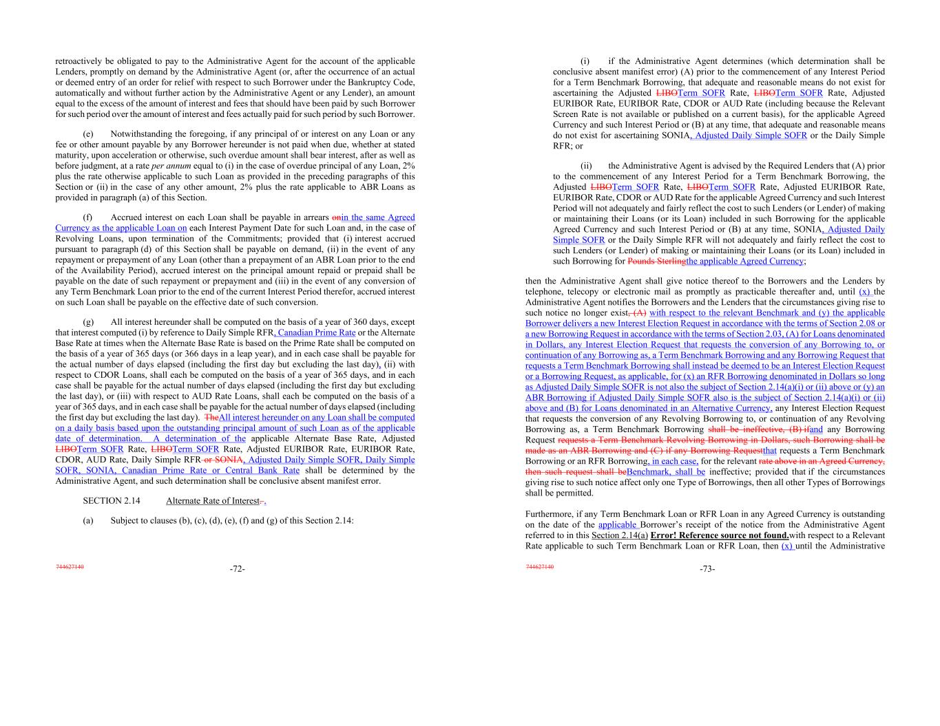 744627140 -72- retroactively be obligated to pay to the Administrative Agent for the account of the applicable Lenders, promptly on demand by the Administrative Agent (or, after the occurrence of an actual or deemed entry of an order for relief with respect to such Borrower under the Bankruptcy Code, automatically and without further action by the Administrative Agent or any Lender), an amount equal to the excess of the amount of interest and fees that should have been paid by such Borrower for such period over the amount of interest and fees actually paid for such period by such Borrower. (e) Notwithstanding the foregoing, if any principal of or interest on any Loan or any fee or other amount payable by any Borrower hereunder is not paid when due, whether at stated maturity, upon acceleration or otherwise, such overdue amount shall bear interest, after as well as before judgment, at a rate per annum equal to (i) in the case of overdue principal of any Loan, 2% plus the rate otherwise applicable to such Loan as provided in the preceding paragraphs of this Section or (ii) in the case of any other amount, 2% plus the rate applicable to ABR Loans as provided in paragraph (a) of this Section. (f) Accrued interest on each Loan shall be payable in arrears onin the same Agreed Currency as the applicable Loan on each Interest Payment Date for such Loan and, in the case of Revolving Loans, upon termination of the Commitments; provided that (i) interest accrued pursuant to paragraph (d) of this Section shall be payable on demand, (ii) in the event of any repayment or prepayment of any Loan (other than a prepayment of an ABR Loan prior to the end of the Availability Period), accrued interest on the principal amount repaid or prepaid shall be payable on the date of such repayment or prepayment and (iii) in the event of any conversion of any Term Benchmark Loan prior to the end of the current Interest Period therefor, accrued interest on such Loan shall be payable on the effective date of such conversion. (g) All interest hereunder shall be computed on the basis of a year of 360 days, except that interest computed (i) by reference to Daily Simple RFR, Canadian Prime Rate or the Alternate Base Rate at times when the Alternate Base Rate is based on the Prime Rate shall be computed on the basis of a year of 365 days (or 366 days in a leap year), and in each case shall be payable for the actual number of days elapsed (including the first day but excluding the last day), (ii) with respect to CDOR Loans, shall each be computed on the basis of a year of 365 days, and in each case shall be payable for the actual number of days elapsed (including the first day but excluding the last day), or (iii) with respect to AUD Rate Loans, shall each be computed on the basis of a year of 365 days, and in each case shall be payable for the actual number of days elapsed (including the first day but excluding the last day). TheAll interest hereunder on any Loan shall be computed on a daily basis based upon the outstanding principal amount of such Loan as of the applicable date of determination. A determination of the applicable Alternate Base Rate, Adjusted LIBOTerm SOFR Rate, LIBOTerm SOFR Rate, Adjusted EURIBOR Rate, EURIBOR Rate, CDOR, AUD Rate, Daily Simple RFR or SONIA, Adjusted Daily Simple SOFR, Daily Simple SOFR, SONIA, Canadian Prime Rate or Central Bank Rate shall be determined by the Administrative Agent, and such determination shall be conclusive absent manifest error. SECTION 2.14 Alternate Rate of Interest. . (a) Subject to clauses (b), (c), (d), (e), (f) and (g) of this Section 2.14: 744627140 -73- (i) if the Administrative Agent determines (which determination shall be conclusive absent manifest error) (A) prior to the commencement of any Interest Period for a Term Benchmark Borrowing, that adequate and reasonable means do not exist for ascertaining the Adjusted LIBOTerm SOFR Rate, LIBOTerm SOFR Rate, Adjusted EURIBOR Rate, EURIBOR Rate, CDOR or AUD Rate (including because the Relevant Screen Rate is not available or published on a current basis), for the applicable Agreed Currency and such Interest Period or (B) at any time, that adequate and reasonable means do not exist for ascertaining SONIA, Adjusted Daily Simple SOFR or the Daily Simple RFR; or (ii) the Administrative Agent is advised by the Required Lenders that (A) prior to the commencement of any Interest Period for a Term Benchmark Borrowing, the Adjusted LIBOTerm SOFR Rate, LIBOTerm SOFR Rate, Adjusted EURIBOR Rate, EURIBOR Rate, CDOR or AUD Rate for the applicable Agreed Currency and such Interest Period will not adequately and fairly reflect the cost to such Lenders (or Lender) of making or maintaining their Loans (or its Loan) included in such Borrowing for the applicable Agreed Currency and such Interest Period or (B) at any time, SONIA, Adjusted Daily Simple SOFR or the Daily Simple RFR will not adequately and fairly reflect the cost to such Lenders (or Lender) of making or maintaining their Loans (or its Loan) included in such Borrowing for Pounds Sterlingthe applicable Agreed Currency; then the Administrative Agent shall give notice thereof to the Borrowers and the Lenders by telephone, telecopy or electronic mail as promptly as practicable thereafter and, until (x) the Administrative Agent notifies the Borrowers and the Lenders that the circumstances giving rise to such notice no longer exist, (A) with respect to the relevant Benchmark and (y) the applicable Borrower delivers a new Interest Election Request in accordance with the terms of Section 2.08 or a new Borrowing Request in accordance with the terms of Section 2.03, (A) for Loans denominated in Dollars, any Interest Election Request that requests the conversion of any Borrowing to, or continuation of any Borrowing as, a Term Benchmark Borrowing and any Borrowing Request that requests a Term Benchmark Borrowing shall instead be deemed to be an Interest Election Request or a Borrowin