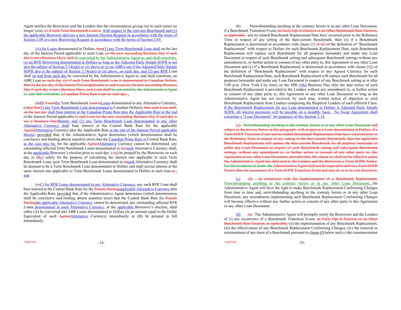 744627140 -74- Agent notifies the Borrowers and the Lenders that the circumstances giving rise to such notice no longer exist, (i) if such Term Benchmark Loan is with respect to the relevant Benchmark and (y) the applicable Borrower delivers a new Interest Election Request in accordance with the terms of Section 2.08 or a new Borrowing Request in accordance with the terms of Section 2.03: (A) for Loans denominated in Dollars, then(1) any Term Benchmark Loan shall on the last day of the Interest Period applicable to such Loan (or the next succeeding Business Day if such day is not a Business Day), such be converted by the Administrative Agent to, and shall constitute, (x) an RFR Borrowing denominated in Dollars so long as the Adjusted Daily Simple SOFR is not also the subject of Section 2.14(a)(i) or (ii) above or (y) an ABR Loan if the Adjusted Daily Simple SOFR also is the subject of Section 2.14(a)(i) or (ii) above, on such day, and (2) any RFR Loan shall on and from such day be converted by the Administrative Agent to, and shall constitute, an ABR Loan on such day, (ii) if such Term Benchmark Loan is denominated in Canadian Dollars, then on the last day of the Interest Period applicable to such Loan (or the next succeeding Business Day if such day is not a Business Day), such Loan shall be converted by the Administrative Agent to, and shall constitute, a Canadian Prime Rate Loan on such day, ; (iiiB) if suchfor Term Benchmark Loan isLoans denominated in any Alternative Currency, (other than1) any Term Benchmark Loan denominated in Canadian Dollars), then such Loan shall, on the last day shall bear interest at the Canadian Prime Rate plus the Applicable Rate at the end of the Interest Period applicable to such Loan (or the next succeeding Business Day if such day is not a Business Day)thereto, and (2) any Term Benchmark Loan denominated in any other Alternative Currency shall bear interest at the Central Bank Rate for the applicable AgreedAlternative Currency plus the Applicable Rate at the end of the Interest Period applicable thereto; provided that, if the Administrative Agent determines (which determination shall be conclusive and binding absent manifest error) that the Canadian Prime Rate or Central Bank Rate, as the case may be, for the applicable AgreedAlternative Currency cannot be determined, any outstanding affected Term Benchmark Loans denominated in anysuch Alternative Currency shall, at the applicable Borrower’s election prior to such day: (Ax) be prepaid by the Borrowers on such day or (By) solely for the purpose of calculating the interest rate applicable to such Term Benchmark Loan, such Term Benchmark Loan denominated in ansuch Alternative Currency shall be deemed to be a Term Benchmark Loan denominated in Dollars and shall accrue interest at the same interest rate applicable to Term Benchmark Loans denominated in Dollars at such time or ; and (ivC) for RFR Loans denominated in any Alternative Currency, any such RFR Loan shall bear interest at the Central Bank Rate for the Pounds Sterlingapplicable Alternative Currency plus the Applicable Rate; provided that, if the Administrative Agent determines (which determination shall be conclusive and binding absent manifest error) that the Central Bank Rate for Pounds Sterlingthe applicable Alternative Currency cannot be determined, any outstanding affected RFR Loans denominated in such Alternative Currency, at the applicable Borrower’s election, shall either (A) be converted into ABR Loans denominated in Dollars (in an amount equal to the Dollar Equivalent of such AgreedAlternative Currency) immediately or (B) be prepaid in full immediately. 744627140 -75- (b) Notwithstanding anything to the contrary herein or in any other Loan Document, if a Benchmark Transition Event, an Early Opt-in Election or an Other Benchmark Rate Election, as applicable, and its related Benchmark Replacement Date have occurred prior to the Reference Time in respect of any setting of the then-current Benchmark, then (x) if a Benchmark Replacement is determined in accordance with clause (1) or (2) of the definition of “Benchmark Replacement” with respect to Dollars for such Benchmark Replacement Date, such Benchmark Replacement will replace such Benchmark for all purposes hereunder and under any Loan Document in respect of such Benchmark setting and subsequent Benchmark settings without any amendment to, or further action or consent of any other party to, this Agreement or any other Loan Document and (y) if a Benchmark Replacement is determined in accordance with clause (32) of the definition of “Benchmark Replacement” with respect to any Agreed Currency for such Benchmark Replacement Date, such Benchmark Replacement will replace such Benchmark for all purposes hereunder and under any Loan Document in respect of any Benchmark setting at or after 5:00 p.m. (New York City time) on the fifth (5th) Business Day after the date notice of such Benchmark Replacement is provided to the Lenders without any amendment to, or further action or consent of any other party to, this Agreement or any other Loan Document so long as the Administrative Agent has not received, by such time, written notice of objection to such Benchmark Replacement from Lenders comprising the Required Lenders of each affected Class. If the Benchmark Replacement for any Loan denominated in Dollars is Adjusted Daily Simple SOFR, all interest payments will be payable on a monthly basis. No Swap Agreement shall constitute a “Loan Document” for purposes of this Section 2.14. (c) Notwithstanding anything to the contrary herein or in any other Loan Document and subject to the proviso below in this paragraph, with respect to a Loan denominated in Dollars, if a Term SOFR Transition Event and its related Benchmark Replacement Date have occurred prior to the Reference Time in respect of any setting of the then-current Benchmark, then the applicable Benchmark Replacement will replace the th