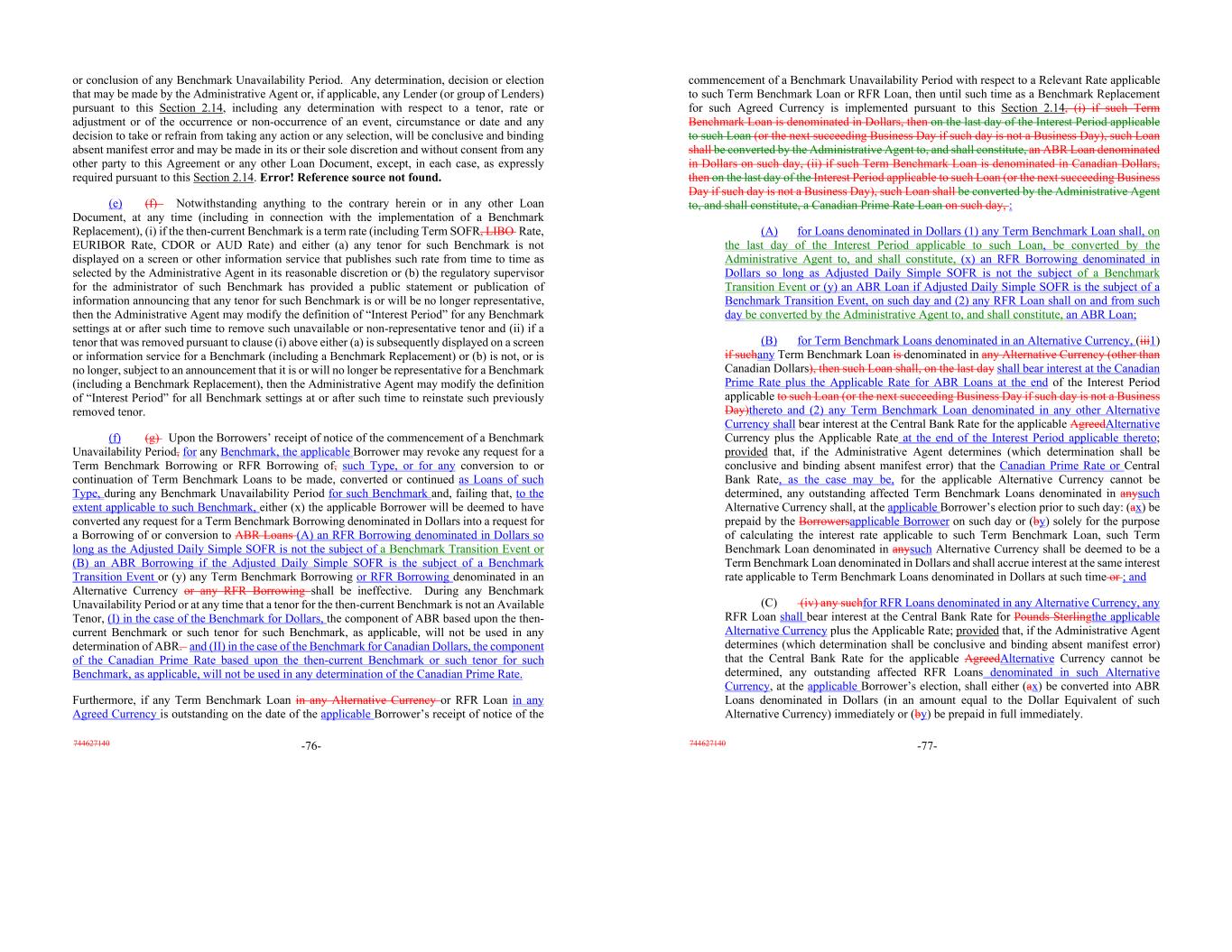 744627140 -76- or conclusion of any Benchmark Unavailability Period. Any determination, decision or election that may be made by the Administrative Agent or, if applicable, any Lender (or group of Lenders) pursuant to this Section 2.14, including any determination with respect to a tenor, rate or adjustment or of the occurrence or non-occurrence of an event, circumstance or date and any decision to take or refrain from taking any action or any selection, will be conclusive and binding absent manifest error and may be made in its or their sole discretion and without consent from any other party to this Agreement or any other Loan Document, except, in each case, as expressly required pursuant to this Section 2.14. Error! Reference source not found. (e) (f) Notwithstanding anything to the contrary herein or in any other Loan Document, at any time (including in connection with the implementation of a Benchmark Replacement), (i) if the then-current Benchmark is a term rate (including Term SOFR, LIBO Rate, EURIBOR Rate, CDOR or AUD Rate) and either (a) any tenor for such Benchmark is not displayed on a screen or other information service that publishes such rate from time to time as selected by the Administrative Agent in its reasonable discretion or (b) the regulatory supervisor for the administrator of such Benchmark has provided a public statement or publication of information announcing that any tenor for such Benchmark is or will be no longer representative, then the Administrative Agent may modify the definition of “Interest Period” for any Benchmark settings at or after such time to remove such unavailable or non-representative tenor and (ii) if a tenor that was removed pursuant to clause (i) above either (a) is subsequently displayed on a screen or information service for a Benchmark (including a Benchmark Replacement) or (b) is not, or is no longer, subject to an announcement that it is or will no longer be representative for a Benchmark (including a Benchmark Replacement), then the Administrative Agent may modify the definition of “Interest Period” for all Benchmark settings at or after such time to reinstate such previously removed tenor. (f) (g) Upon the Borrowers’ receipt of notice of the commencement of a Benchmark Unavailability Period, for any Benchmark, the applicable Borrower may revoke any request for a Term Benchmark Borrowing or RFR Borrowing of, such Type, or for any conversion to or continuation of Term Benchmark Loans to be made, converted or continued as Loans of such Type, during any Benchmark Unavailability Period for such Benchmark and, failing that, to the extent applicable to such Benchmark, either (x) the applicable Borrower will be deemed to have converted any request for a Term Benchmark Borrowing denominated in Dollars into a request for a Borrowing of or conversion to ABR Loans (A) an RFR Borrowing denominated in Dollars so long as the Adjusted Daily Simple SOFR is not the subject of a Benchmark Transition Event or (B) an ABR Borrowing if the Adjusted Daily Simple SOFR is the subject of a Benchmark Transition Event or (y) any Term Benchmark Borrowing or RFR Borrowing denominated in an Alternative Currency or any RFR Borrowing shall be ineffective. During any Benchmark Unavailability Period or at any time that a tenor for the then-current Benchmark is not an Available Tenor, (I) in the case of the Benchmark for Dollars, the component of ABR based upon the then- current Benchmark or such tenor for such Benchmark, as applicable, will not be used in any determination of ABR. and (II) in the case of the Benchmark for Canadian Dollars, the component of the Canadian Prime Rate based upon the then-current Benchmark or such tenor for such Benchmark, as applicable, will not be used in any determination of the Canadian Prime Rate. Furthermore, if any Term Benchmark Loan in any Alternative Currency or RFR Loan in any Agreed Currency is outstanding on the date of the applicable Borrower’s receipt of notice of the 744627140 -77- commencement of a Benchmark Unavailability Period with respect to a Relevant Rate applicable to such Term Benchmark Loan or RFR Loan, then until such time as a Benchmark Replacement for such Agreed Currency is implemented pursuant to this Section 2.14, (i) if such Term Benchmark Loan is denominated in Dollars, then on the last day of the Interest Period applicable to such Loan (or the next succeeding Business Day if such day is not a Business Day), such Loan shall be converted by the Administrative Agent to, and shall constitute, an ABR Loan denominated in Dollars on such day, (ii) if such Term Benchmark Loan is denominated in Canadian Dollars, then on the last day of the Interest Period applicable to such Loan (or the next succeeding Business Day if such day is not a Business Day), such Loan shall be converted by the Administrative Agent to, and shall constitute, a Canadian Prime Rate Loan on such day, : (A) for Loans denominated in Dollars (1) any Term Benchmark Loan shall, on the last day of the Interest Period applicable to such Loan, be converted by the Administrative Agent to, and shall constitute, (x) an RFR Borrowing denominated in Dollars so long as Adjusted Daily Simple SOFR is not the subject of a Benchmark Transition Event or (y) an ABR Loan if Adjusted Daily Simple SOFR is the subject of a Benchmark Transition Event, on such day and (2) any RFR Loan shall on and from such day be converted by the Administrative Agent to, and shall constitute, an ABR Loan; (B) for Term Benchmark Loans denominated in an Alternative Currency, (iii1) if suchany Term Benchmark Loan is denominated in any Alternative Currency (other than Canadian Dollars), then such Loan shall, on the last day shall bear interest at the Canadian Prime Rate plus the Applicable Rate for ABR Loans at the end of the Interest Period applicable to such Loan (or the next succeeding Business Day if such day is not a Business Day)thereto and (2) any Term Benchmark Loan deno