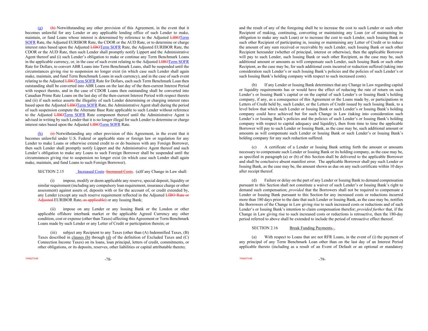 744627140 -78- (g) (h) Notwithstanding any other provision of this Agreement, in the event that it becomes unlawful for any Lender or any applicable lending office of such Lender to make, maintain, or fund Loans whose interest is determined by reference to the Adjusted LIBOTerm SOFR Rate, the Adjusted EURIBOR Rate, the CDOR or the AUD Rate, or to determine or charge interest rates based upon the Adjusted LIBOTerm SOFR Rate, the Adjusted EURIBOR Rate, the CDOR or the AUD Rate, then such Lender shall promptly notify Lippert and the Administrative Agent thereof and (i) such Lender’s obligation to make or continue any Term Benchmark Loans in the applicable currency, or, in the case of such event relating to the Adjusted LIBOTerm SOFR Rate for Dollars, to convert ABR Loans into Term Benchmark Loans, shall be suspended until the circumstances giving rise to suspension no longer exist (in which case such Lender shall again make, maintain, and fund Term Benchmark Loans in such currency), and in the case of such event relating to the Adjusted LIBOTerm SOFR Rate for Dollars, each such Term Benchmark Loan then outstanding shall be converted into ABR Loans on the last day of the then-current Interest Period with respect thereto, and in the case of CDOR Loans then outstanding shall be converted into Canadian Prime Rate Loans on the last day of the then-current Interest Period with respect thereto and (ii) if such notice asserts the illegality of such Lender determining or charging interest rates based upon the Adjusted LIBOTerm SOFR Rate, the Administrative Agent shall during the period of such suspension compute the Alternate Base Rate applicable to such Lender without reference to the Adjusted LIBOTerm SOFR Rate component thereof until the Administrative Agent is advised in writing by such Lender that it is no longer illegal for such Lender to determine or charge interest rates based upon the Adjusted LIBOTerm SOFR Rate. (h) (i) Notwithstanding any other provision of this Agreement, in the event that it becomes unlawful under U.S. Federal or applicable state or foreign law or regulation for any Lender to make Loans or otherwise extend credit to or do business with any Foreign Borrower, then such Lender shall promptly notify Lippert and the Administrative Agent thereof and such Lender’s obligation to make any Loans to such Foreign Borrower shall be suspended until the circumstances giving rise to suspension no longer exist (in which case such Lender shall again make, maintain, and fund Loans to such Foreign Borrower). SECTION 2.15 Increased Costs Increased Costs. (a)If any Change in Law shall: (i) impose, modify or deem applicable any reserve, special deposit, liquidity or similar requirement (including any compulsory loan requirement, insurance charge or other assessment) against assets of, deposits with or for the account of, or credit extended by, any Lender (except any such reserve requirement reflected in the Adjusted LIBO Rate or Adjusted EURIBOR Rate, as applicable) or any Issuing Bank; (ii) impose on any Lender or any Issuing Bank or the London or other applicable offshore interbank market or the applicable Agreed Currency any other condition, cost or expense (other than Taxes) affecting this Agreement or Term Benchmark Loans made by such Lender or any Letter of Credit or participation therein; or (iii) subject any Recipient to any Taxes (other than (A) Indemnified Taxes, (B) Taxes described in clauses (b) through (d) of the definition of Excluded Taxes and (C) Connection Income Taxes) on its loans, loan principal, letters of credit, commitments, or other obligations, or its deposits, reserves, other liabilities or capital attributable thereto; 744627140 -79- and the result of any of the foregoing shall be to increase the cost to such Lender or such other Recipient of making, continuing, converting or maintaining any Loan (or of maintaining its obligation to make any such Loan) or to increase the cost to such Lender, such Issuing Bank or such other Recipient of participating in, issuing or maintaining any Letter of Credit or to reduce the amount of any sum received or receivable by such Lender, such Issuing Bank or such other Recipient hereunder (whether of principal, interest or otherwise), then the applicable Borrower will pay to such Lender, such Issuing Bank or such other Recipient, as the case may be, such additional amount or amounts as will compensate such Lender, such Issuing Bank or such other Recipient, as the case may be, for such additional costs incurred or reduction suffered (taking into consideration such Lender’s or such Issuing Bank’s policies and the policies of such Lender’s or such Issuing Bank’s holding company with respect to such increased costs). (b) If any Lender or Issuing Bank determines that any Change in Law regarding capital or liquidity requirements has or would have the effect of reducing the rate of return on such Lender’s or Issuing Bank’s capital or on the capital of such Lender’s or Issuing Bank’s holding company, if any, as a consequence of this Agreement or the Loans made by, or participations in Letters of Credit held by, such Lender, or the Letters of Credit issued by such Issuing Bank, to a level below that which such Lender or Issuing Bank or such Lender’s or Issuing Bank’s holding company could have achieved but for such Change in Law (taking into consideration such Lender’s or Issuing Bank’s policies and the policies of such Lender’s or Issuing Bank’s holding company with respect to capital adequacy and liquidity), then from time to time the applicable Borrower will pay to such Lender or Issuing Bank, as the case may be, such additional amount or amounts as will compensate such Lender or Issuing Bank or such Lender’s or Issuing Bank’s holding company for any such reduction suffered. (c) A certificate of a Lender or Issuing Bank setting forth the amount or amounts necessary to compensate such Lender or Issuing Ban
