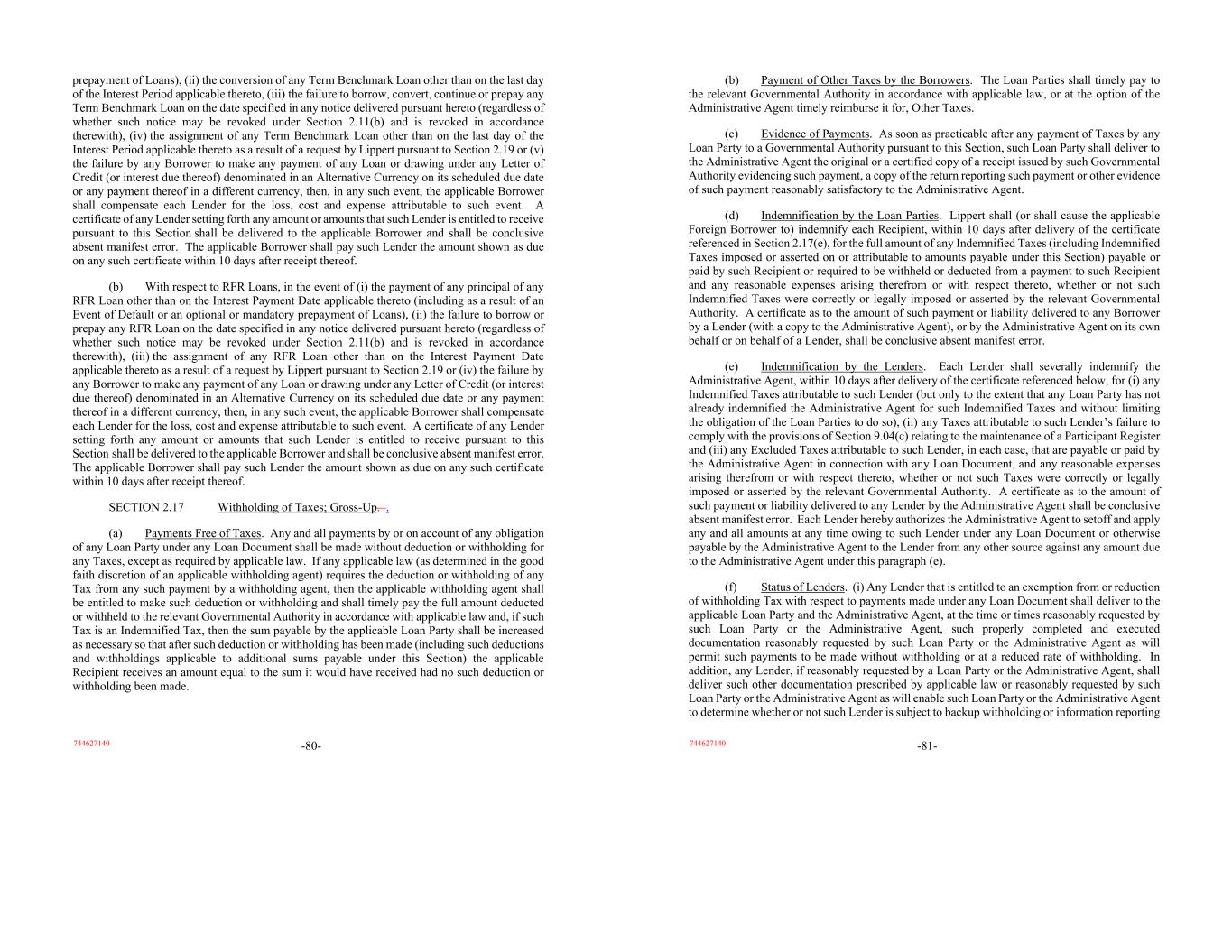 744627140 -80- prepayment of Loans), (ii) the conversion of any Term Benchmark Loan other than on the last day of the Interest Period applicable thereto, (iii) the failure to borrow, convert, continue or prepay any Term Benchmark Loan on the date specified in any notice delivered pursuant hereto (regardless of whether such notice may be revoked under Section 2.11(b) and is revoked in accordance therewith), (iv) the assignment of any Term Benchmark Loan other than on the last day of the Interest Period applicable thereto as a result of a request by Lippert pursuant to Section 2.19 or (v) the failure by any Borrower to make any payment of any Loan or drawing under any Letter of Credit (or interest due thereof) denominated in an Alternative Currency on its scheduled due date or any payment thereof in a different currency, then, in any such event, the applicable Borrower shall compensate each Lender for the loss, cost and expense attributable to such event. A certificate of any Lender setting forth any amount or amounts that such Lender is entitled to receive pursuant to this Section shall be delivered to the applicable Borrower and shall be conclusive absent manifest error. The applicable Borrower shall pay such Lender the amount shown as due on any such certificate within 10 days after receipt thereof. (b) With respect to RFR Loans, in the event of (i) the payment of any principal of any RFR Loan other than on the Interest Payment Date applicable thereto (including as a result of an Event of Default or an optional or mandatory prepayment of Loans), (ii) the failure to borrow or prepay any RFR Loan on the date specified in any notice delivered pursuant hereto (regardless of whether such notice may be revoked under Section 2.11(b) and is revoked in accordance therewith), (iii) the assignment of any RFR Loan other than on the Interest Payment Date applicable thereto as a result of a request by Lippert pursuant to Section 2.19 or (iv) the failure by any Borrower to make any payment of any Loan or drawing under any Letter of Credit (or interest due thereof) denominated in an Alternative Currency on its scheduled due date or any payment thereof in a different currency, then, in any such event, the applicable Borrower shall compensate each Lender for the loss, cost and expense attributable to such event. A certificate of any Lender setting forth any amount or amounts that such Lender is entitled to receive pursuant to this Section shall be delivered to the applicable Borrower and shall be conclusive absent manifest error. The applicable Borrower shall pay such Lender the amount shown as due on any such certificate within 10 days after receipt thereof. SECTION 2.17 Withholding of Taxes; Gross-Up. . (a) Payments Free of Taxes. Any and all payments by or on account of any obligation of any Loan Party under any Loan Document shall be made without deduction or withholding for any Taxes, except as required by applicable law. If any applicable law (as determined in the good faith discretion of an applicable withholding agent) requires the deduction or withholding of any Tax from any such payment by a withholding agent, then the applicable withholding agent shall be entitled to make such deduction or withholding and shall timely pay the full amount deducted or withheld to the relevant Governmental Authority in accordance with applicable law and, if such Tax is an Indemnified Tax, then the sum payable by the applicable Loan Party shall be increased as necessary so that after such deduction or withholding has been made (including such deductions and withholdings applicable to additional sums payable under this Section) the applicable Recipient receives an amount equal to the sum it would have received had no such deduction or withholding been made. 744627140 -81- (b) Payment of Other Taxes by the Borrowers. The Loan Parties shall timely pay to the relevant Governmental Authority in accordance with applicable law, or at the option of the Administrative Agent timely reimburse it for, Other Taxes. (c) Evidence of Payments. As soon as practicable after any payment of Taxes by any Loan Party to a Governmental Authority pursuant to this Section, such Loan Party shall deliver to the Administrative Agent the original or a certified copy of a receipt issued by such Governmental Authority evidencing such payment, a copy of the return reporting such payment or other evidence of such payment reasonably satisfactory to the Administrative Agent. (d) Indemnification by the Loan Parties. Lippert shall (or shall cause the applicable Foreign Borrower to) indemnify each Recipient, within 10 days after delivery of the certificate referenced in Section 2.17(e), for the full amount of any Indemnified Taxes (including Indemnified Taxes imposed or asserted on or attributable to amounts payable under this Section) payable or paid by such Recipient or required to be withheld or deducted from a payment to such Recipient and any reasonable expenses arising therefrom or with respect thereto, whether or not such Indemnified Taxes were correctly or legally imposed or asserted by the relevant Governmental Authority. A certificate as to the amount of such payment or liability delivered to any Borrower by a Lender (with a copy to the Administrative Agent), or by the Administrative Agent on its own behalf or on behalf of a Lender, shall be conclusive absent manifest error. (e) Indemnification by the Lenders. Each Lender shall severally indemnify the Administrative Agent, within 10 days after delivery of the certificate referenced below, for (i) any Indemnified Taxes attributable to such Lender (but only to the extent that any Loan Party has not already indemnified the Administrative Agent for such Indemnified Taxes and without limiting the obligation of the Loan Parties to do so), (ii) any Taxes attributable to such Lender’s failure to comply with the provisions of Section 9.04(c) relating to the maintenance of a Participant Register and 