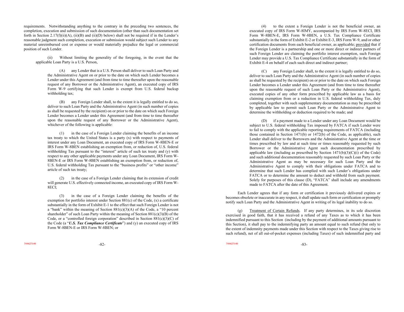 744627140 -82- requirements. Notwithstanding anything to the contrary in the preceding two sentences, the completion, execution and submission of such documentation (other than such documentation set forth in Section 2.17(f)(ii)(A), (ii)(B) and (ii)(D) below) shall not be required if in the Lender’s reasonable judgment such completion, execution or submission would subject such Lender to any material unreimbursed cost or expense or would materially prejudice the legal or commercial position of such Lender. (ii) Without limiting the generality of the foregoing, in the event that the applicable Loan Party is a U.S. Person, (A) any Lender that is a U.S. Person shall deliver to such Loan Party and the Administrative Agent on or prior to the date on which such Lender becomes a Lender under this Agreement (and from time to time thereafter upon the reasonable request of any Borrower or the Administrative Agent), an executed copy of IRS Form W-9 certifying that such Lender is exempt from U.S. federal backup withholding tax; (B) any Foreign Lender shall, to the extent it is legally entitled to do so, deliver to such Loan Party and the Administrative Agent (in such number of copies as shall be requested by the recipient) on or prior to the date on which such Foreign Lender becomes a Lender under this Agreement (and from time to time thereafter upon the reasonable request of any Borrower or the Administrative Agent), whichever of the following is applicable: (1) in the case of a Foreign Lender claiming the benefits of an income tax treaty to which the United States is a party (x) with respect to payments of interest under any Loan Document, an executed copy of IRS Form W-8BEN-E or IRS Form W-8BEN establishing an exemption from, or reduction of, U.S. federal withholding Tax pursuant to the “interest” article of such tax treaty and (y) with respect to any other applicable payments under any Loan Document, IRS Form W- 8BEN-E or IRS Form W-8BEN establishing an exemption from, or reduction of, U.S. federal withholding Tax pursuant to the “business profits” or “other income” article of such tax treaty; (2) in the case of a Foreign Lender claiming that its extension of credit will generate U.S. effectively connected income, an executed copy of IRS Form W- 8ECI; (3) in the case of a Foreign Lender claiming the benefits of the exemption for portfolio interest under Section 881(c) of the Code, (x) a certificate substantially in the form of Exhibit E-1 to the effect that such Foreign Lender is not a “bank” within the meaning of Section 881(c)(3)(A) of the Code, a “10 percent shareholder” of such Loan Party within the meaning of Section 881(c)(3)(B) of the Code, or a “controlled foreign corporation” described in Section 881(c)(3)(C) of the Code (a “U.S. Tax Compliance Certificate”) and (y) an executed copy of IRS Form W-8BEN-E or IRS Form W-8BEN; or 744627140 -83- (4) to the extent a Foreign Lender is not the beneficial owner, an executed copy of IRS Form W-8IMY, accompanied by IRS Form W-8ECI, IRS Form W-8BEN-E, IRS Form W-8BEN, a U.S. Tax Compliance Certificate substantially in the form of Exhibit E-2 or Exhibit E-3, IRS Form W-9, and/or other certification documents from each beneficial owner, as applicable; provided that if the Foreign Lender is a partnership and one or more direct or indirect partners of such Foreign Lender are claiming the portfolio interest exemption, such Foreign Lender may provide a U.S. Tax Compliance Certificate substantially in the form of Exhibit E-4 on behalf of each such direct and indirect partner; (C) any Foreign Lender shall, to the extent it is legally entitled to do so, deliver to such Loan Party and the Administrative Agent (in such number of copies as shall be requested by the recipient) on or prior to the date on which such Foreign Lender becomes a Lender under this Agreement (and from time to time thereafter upon the reasonable request of such Loan Party or the Administrative Agent), executed copies of any other form prescribed by applicable law as a basis for claiming exemption from or a reduction in U.S. federal withholding Tax, duly completed, together with such supplementary documentation as may be prescribed by applicable law to permit such Loan Party or the Administrative Agent to determine the withholding or deduction required to be made; and (D) if a payment made to a Lender under any Loan Document would be subject to U.S. federal withholding Tax imposed by FATCA if such Lender were to fail to comply with the applicable reporting requirements of FATCA (including those contained in Section 1471(b) or 1472(b) of the Code, as applicable), such Lender shall deliver to the Borrowers and the Administrative Agent at the time or times prescribed by law and at such time or times reasonably requested by such Borrower or the Administrative Agent such documentation prescribed by applicable law (including as prescribed by Section 1471(b)(3)(C)(i) of the Code) and such additional documentation reasonably requested by such Loan Party or the Administrative Agent as may be necessary for such Loan Party and the Administrative Agent to comply with their obligations under FATCA and to determine that such Lender has complied with such Lender’s obligations under FATCA or to determine the amount to deduct and withhold from such payment. Solely for purposes of this clause (D), “FATCA” shall include any amendments made to FATCA after the date of this Agreement. Each Lender agrees that if any form or certification it previously delivered expires or becomes obsolete or inaccurate in any respect, it shall update such form or certification or promptly notify such Loan Party and the Administrative Agent in writing of its legal inability to do so. (g) Treatment of Certain Refunds. If any party determines, in its sole discretion exercised in good faith, that it has received a refund of any Taxes as to which it has been indemnified pursuant to this Section (i