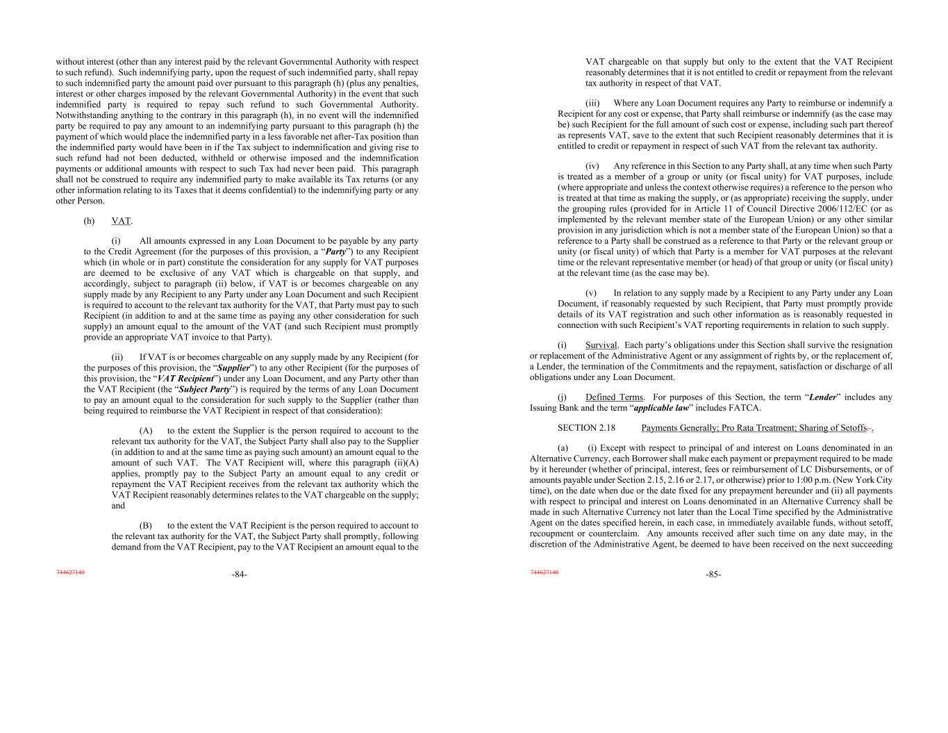 744627140 -84- without interest (other than any interest paid by the relevant Governmental Authority with respect to such refund). Such indemnifying party, upon the request of such indemnified party, shall repay to such indemnified party the amount paid over pursuant to this paragraph (h) (plus any penalties, interest or other charges imposed by the relevant Governmental Authority) in the event that such indemnified party is required to repay such refund to such Governmental Authority. Notwithstanding anything to the contrary in this paragraph (h), in no event will the indemnified party be required to pay any amount to an indemnifying party pursuant to this paragraph (h) the payment of which would place the indemnified party in a less favorable net after-Tax position than the indemnified party would have been in if the Tax subject to indemnification and giving rise to such refund had not been deducted, withheld or otherwise imposed and the indemnification payments or additional amounts with respect to such Tax had never been paid. This paragraph shall not be construed to require any indemnified party to make available its Tax returns (or any other information relating to its Taxes that it deems confidential) to the indemnifying party or any other Person. (h) VAT. (i) All amounts expressed in any Loan Document to be payable by any party to the Credit Agreement (for the purposes of this provision, a “Party”) to any Recipient which (in whole or in part) constitute the consideration for any supply for VAT purposes are deemed to be exclusive of any VAT which is chargeable on that supply, and accordingly, subject to paragraph (ii) below, if VAT is or becomes chargeable on any supply made by any Recipient to any Party under any Loan Document and such Recipient is required to account to the relevant tax authority for the VAT, that Party must pay to such Recipient (in addition to and at the same time as paying any other consideration for such supply) an amount equal to the amount of the VAT (and such Recipient must promptly provide an appropriate VAT invoice to that Party). (ii) If VAT is or becomes chargeable on any supply made by any Recipient (for the purposes of this provision, the “Supplier”) to any other Recipient (for the purposes of this provision, the “VAT Recipient”) under any Loan Document, and any Party other than the VAT Recipient (the “Subject Party”) is required by the terms of any Loan Document to pay an amount equal to the consideration for such supply to the Supplier (rather than being required to reimburse the VAT Recipient in respect of that consideration): (A) to the extent the Supplier is the person required to account to the relevant tax authority for the VAT, the Subject Party shall also pay to the Supplier (in addition to and at the same time as paying such amount) an amount equal to the amount of such VAT. The VAT Recipient will, where this paragraph (ii)(A) applies, promptly pay to the Subject Party an amount equal to any credit or repayment the VAT Recipient receives from the relevant tax authority which the VAT Recipient reasonably determines relates to the VAT chargeable on the supply; and (B) to the extent the VAT Recipient is the person required to account to the relevant tax authority for the VAT, the Subject Party shall promptly, following demand from the VAT Recipient, pay to the VAT Recipient an amount equal to the 744627140 -85- VAT chargeable on that supply but only to the extent that the VAT Recipient reasonably determines that it is not entitled to credit or repayment from the relevant tax authority in respect of that VAT. (iii) Where any Loan Document requires any Party to reimburse or indemnify a Recipient for any cost or expense, that Party shall reimburse or indemnify (as the case may be) such Recipient for the full amount of such cost or expense, including such part thereof as represents VAT, save to the extent that such Recipient reasonably determines that it is entitled to credit or repayment in respect of such VAT from the relevant tax authority. (iv) Any reference in this Section to any Party shall, at any time when such Party is treated as a member of a group or unity (or fiscal unity) for VAT purposes, include (where appropriate and unless the context otherwise requires) a reference to the person who is treated at that time as making the supply, or (as appropriate) receiving the supply, under the grouping rules (provided for in Article 11 of Council Directive 2006/112/EC (or as implemented by the relevant member state of the European Union) or any other similar provision in any jurisdiction which is not a member state of the European Union) so that a reference to a Party shall be construed as a reference to that Party or the relevant group or unity (or fiscal unity) of which that Party is a member for VAT purposes at the relevant time or the relevant representative member (or head) of that group or unity (or fiscal unity) at the relevant time (as the case may be). (v) In relation to any supply made by a Recipient to any Party under any Loan Document, if reasonably requested by such Recipient, that Party must promptly provide details of its VAT registration and such other information as is reasonably requested in connection with such Recipient’s VAT reporting requirements in relation to such supply. (i) Survival. Each party’s obligations under this Section shall survive the resignation or replacement of the Administrative Agent or any assignment of rights by, or the replacement of, a Lender, the termination of the Commitments and the repayment, satisfaction or discharge of all obligations under any Loan Document. (j) Defined Terms. For purposes of this Section, the term “Lender” includes any Issuing Bank and the term “applicable law” includes FATCA. SECTION 2.18 Payments Generally; Pro Rata Treatment; Sharing of Setoffs. . (a) (i) Except with respect to principal of and interest on Loans denominated in an Alternative Cu