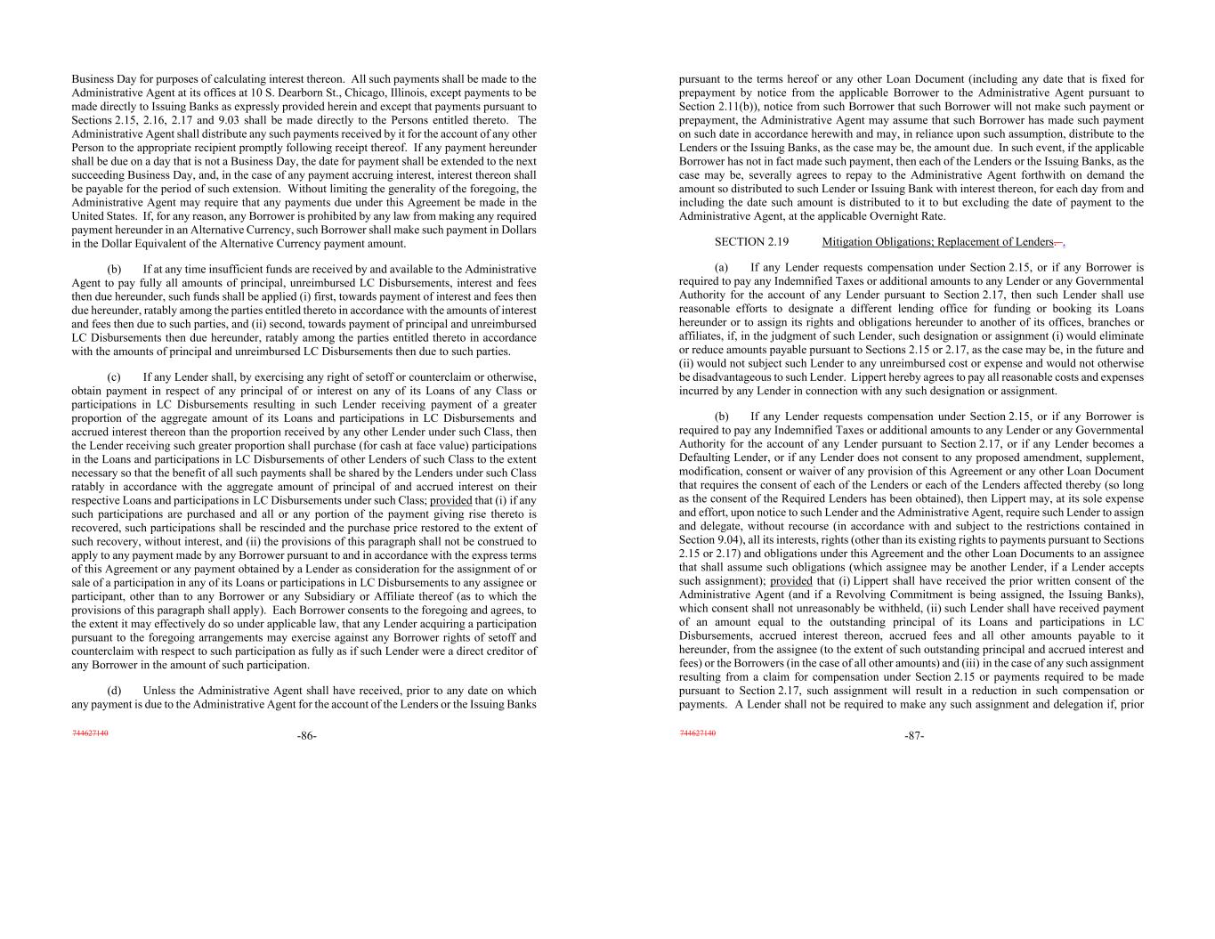 744627140 -86- Business Day for purposes of calculating interest thereon. All such payments shall be made to the Administrative Agent at its offices at 10 S. Dearborn St., Chicago, Illinois, except payments to be made directly to Issuing Banks as expressly provided herein and except that payments pursuant to Sections 2.15, 2.16, 2.17 and 9.03 shall be made directly to the Persons entitled thereto. The Administrative Agent shall distribute any such payments received by it for the account of any other Person to the appropriate recipient promptly following receipt thereof. If any payment hereunder shall be due on a day that is not a Business Day, the date for payment shall be extended to the next succeeding Business Day, and, in the case of any payment accruing interest, interest thereon shall be payable for the period of such extension. Without limiting the generality of the foregoing, the Administrative Agent may require that any payments due under this Agreement be made in the United States. If, for any reason, any Borrower is prohibited by any law from making any required payment hereunder in an Alternative Currency, such Borrower shall make such payment in Dollars in the Dollar Equivalent of the Alternative Currency payment amount. (b) If at any time insufficient funds are received by and available to the Administrative Agent to pay fully all amounts of principal, unreimbursed LC Disbursements, interest and fees then due hereunder, such funds shall be applied (i) first, towards payment of interest and fees then due hereunder, ratably among the parties entitled thereto in accordance with the amounts of interest and fees then due to such parties, and (ii) second, towards payment of principal and unreimbursed LC Disbursements then due hereunder, ratably among the parties entitled thereto in accordance with the amounts of principal and unreimbursed LC Disbursements then due to such parties. (c) If any Lender shall, by exercising any right of setoff or counterclaim or otherwise, obtain payment in respect of any principal of or interest on any of its Loans of any Class or participations in LC Disbursements resulting in such Lender receiving payment of a greater proportion of the aggregate amount of its Loans and participations in LC Disbursements and accrued interest thereon than the proportion received by any other Lender under such Class, then the Lender receiving such greater proportion shall purchase (for cash at face value) participations in the Loans and participations in LC Disbursements of other Lenders of such Class to the extent necessary so that the benefit of all such payments shall be shared by the Lenders under such Class ratably in accordance with the aggregate amount of principal of and accrued interest on their respective Loans and participations in LC Disbursements under such Class; provided that (i) if any such participations are purchased and all or any portion of the payment giving rise thereto is recovered, such participations shall be rescinded and the purchase price restored to the extent of such recovery, without interest, and (ii) the provisions of this paragraph shall not be construed to apply to any payment made by any Borrower pursuant to and in accordance with the express terms of this Agreement or any payment obtained by a Lender as consideration for the assignment of or sale of a participation in any of its Loans or participations in LC Disbursements to any assignee or participant, other than to any Borrower or any Subsidiary or Affiliate thereof (as to which the provisions of this paragraph shall apply). Each Borrower consents to the foregoing and agrees, to the extent it may effectively do so under applicable law, that any Lender acquiring a participation pursuant to the foregoing arrangements may exercise against any Borrower rights of setoff and counterclaim with respect to such participation as fully as if such Lender were a direct creditor of any Borrower in the amount of such participation. (d) Unless the Administrative Agent shall have received, prior to any date on which any payment is due to the Administrative Agent for the account of the Lenders or the Issuing Banks 744627140 -87- pursuant to the terms hereof or any other Loan Document (including any date that is fixed for prepayment by notice from the applicable Borrower to the Administrative Agent pursuant to Section 2.11(b)), notice from such Borrower that such Borrower will not make such payment or prepayment, the Administrative Agent may assume that such Borrower has made such payment on such date in accordance herewith and may, in reliance upon such assumption, distribute to the Lenders or the Issuing Banks, as the case may be, the amount due. In such event, if the applicable Borrower has not in fact made such payment, then each of the Lenders or the Issuing Banks, as the case may be, severally agrees to repay to the Administrative Agent forthwith on demand the amount so distributed to such Lender or Issuing Bank with interest thereon, for each day from and including the date such amount is distributed to it to but excluding the date of payment to the Administrative Agent, at the applicable Overnight Rate. SECTION 2.19 Mitigation Obligations; Replacement of Lenders. . (a) If any Lender requests compensation under Section 2.15, or if any Borrower is required to pay any Indemnified Taxes or additional amounts to any Lender or any Governmental Authority for the account of any Lender pursuant to Section 2.17, then such Lender shall use reasonable efforts to designate a different lending office for funding or booking its Loans hereunder or to assign its rights and obligations hereunder to another of its offices, branches or affiliates, if, in the judgment of such Lender, such designation or assignment (i) would eliminate or reduce amounts payable pursuant to Sections 2.15 or 2.17, as the case may be, in the future and (ii) would not subject such Lender to any unreimbursed cost or expense and would 