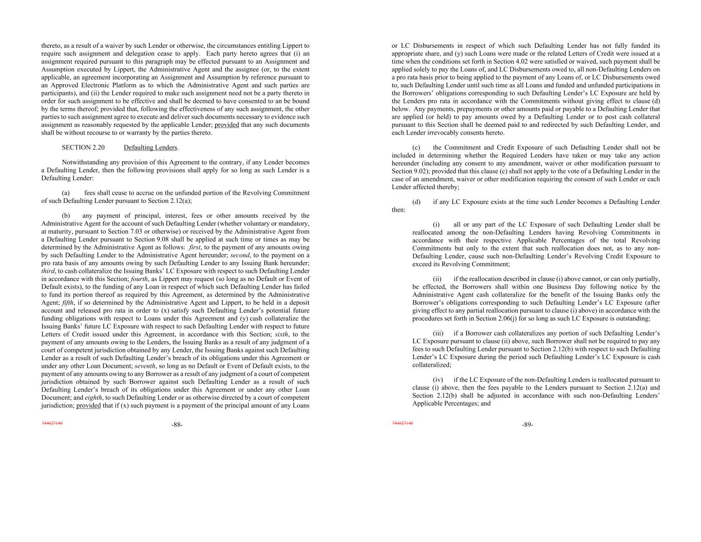 744627140 -88- thereto, as a result of a waiver by such Lender or otherwise, the circumstances entitling Lippert to require such assignment and delegation cease to apply. Each party hereto agrees that (i) an assignment required pursuant to this paragraph may be effected pursuant to an Assignment and Assumption executed by Lippert, the Administrative Agent and the assignee (or, to the extent applicable, an agreement incorporating an Assignment and Assumption by reference pursuant to an Approved Electronic Platform as to which the Administrative Agent and such parties are participants), and (ii) the Lender required to make such assignment need not be a party thereto in order for such assignment to be effective and shall be deemed to have consented to an be bound by the terms thereof; provided that, following the effectiveness of any such assignment, the other parties to such assignment agree to execute and deliver such documents necessary to evidence such assignment as reasonably requested by the applicable Lender; provided that any such documents shall be without recourse to or warranty by the parties thereto. SECTION 2.20 Defaulting Lenders. Notwithstanding any provision of this Agreement to the contrary, if any Lender becomes a Defaulting Lender, then the following provisions shall apply for so long as such Lender is a Defaulting Lender: (a) fees shall cease to accrue on the unfunded portion of the Revolving Commitment of such Defaulting Lender pursuant to Section 2.12(a); (b) any payment of principal, interest, fees or other amounts received by the Administrative Agent for the account of such Defaulting Lender (whether voluntary or mandatory, at maturity, pursuant to Section 7.03 or otherwise) or received by the Administrative Agent from a Defaulting Lender pursuant to Section 9.08 shall be applied at such time or times as may be determined by the Administrative Agent as follows: first, to the payment of any amounts owing by such Defaulting Lender to the Administrative Agent hereunder; second, to the payment on a pro rata basis of any amounts owing by such Defaulting Lender to any Issuing Bank hereunder; third, to cash collateralize the Issuing Banks’ LC Exposure with respect to such Defaulting Lender in accordance with this Section; fourth, as Lippert may request (so long as no Default or Event of Default exists), to the funding of any Loan in respect of which such Defaulting Lender has failed to fund its portion thereof as required by this Agreement, as determined by the Administrative Agent; fifth, if so determined by the Administrative Agent and Lippert, to be held in a deposit account and released pro rata in order to (x) satisfy such Defaulting Lender’s potential future funding obligations with respect to Loans under this Agreement and (y) cash collateralize the Issuing Banks’ future LC Exposure with respect to such Defaulting Lender with respect to future Letters of Credit issued under this Agreement, in accordance with this Section; sixth, to the payment of any amounts owing to the Lenders, the Issuing Banks as a result of any judgment of a court of competent jurisdiction obtained by any Lender, the Issuing Banks against such Defaulting Lender as a result of such Defaulting Lender’s breach of its obligations under this Agreement or under any other Loan Document; seventh, so long as no Default or Event of Default exists, to the payment of any amounts owing to any Borrower as a result of any judgment of a court of competent jurisdiction obtained by such Borrower against such Defaulting Lender as a result of such Defaulting Lender’s breach of its obligations under this Agreement or under any other Loan Document; and eighth, to such Defaulting Lender or as otherwise directed by a court of competent jurisdiction; provided that if (x) such payment is a payment of the principal amount of any Loans 744627140 -89- or LC Disbursements in respect of which such Defaulting Lender has not fully funded its appropriate share, and (y) such Loans were made or the related Letters of Credit were issued at a time when the conditions set forth in Section 4.02 were satisfied or waived, such payment shall be applied solely to pay the Loans of, and LC Disbursements owed to, all non-Defaulting Lenders on a pro rata basis prior to being applied to the payment of any Loans of, or LC Disbursements owed to, such Defaulting Lender until such time as all Loans and funded and unfunded participations in the Borrowers’ obligations corresponding to such Defaulting Lender’s LC Exposure are held by the Lenders pro rata in accordance with the Commitments without giving effect to clause (d) below. Any payments, prepayments or other amounts paid or payable to a Defaulting Lender that are applied (or held) to pay amounts owed by a Defaulting Lender or to post cash collateral pursuant to this Section shall be deemed paid to and redirected by such Defaulting Lender, and each Lender irrevocably consents hereto. (c) the Commitment and Credit Exposure of such Defaulting Lender shall not be included in determining whether the Required Lenders have taken or may take any action hereunder (including any consent to any amendment, waiver or other modification pursuant to Section 9.02); provided that this clause (c) shall not apply to the vote of a Defaulting Lender in the case of an amendment, waiver or other modification requiring the consent of such Lender or each Lender affected thereby; (d) if any LC Exposure exists at the time such Lender becomes a Defaulting Lender then: (i) all or any part of the LC Exposure of such Defaulting Lender shall be reallocated among the non-Defaulting Lenders having Revolving Commitments in accordance with their respective Applicable Percentages of the total Revolving Commitments but only to the extent that such reallocation does not, as to any non- Defaulting Lender, cause such non-Defaulting Lender’s Revolving Credit Exposure to exceed its Revolving Commitment; (ii) if the real