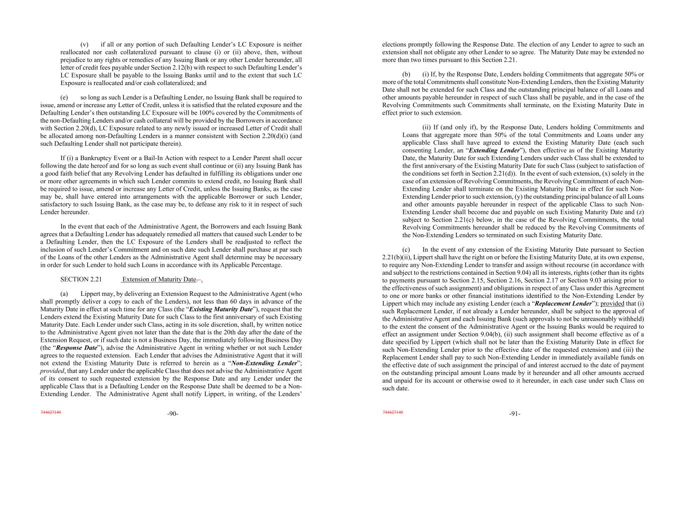 744627140 -90- (v) if all or any portion of such Defaulting Lender’s LC Exposure is neither reallocated nor cash collateralized pursuant to clause (i) or (ii) above, then, without prejudice to any rights or remedies of any Issuing Bank or any other Lender hereunder, all letter of credit fees payable under Section 2.12(b) with respect to such Defaulting Lender’s LC Exposure shall be payable to the Issuing Banks until and to the extent that such LC Exposure is reallocated and/or cash collateralized; and (e) so long as such Lender is a Defaulting Lender, no Issuing Bank shall be required to issue, amend or increase any Letter of Credit, unless it is satisfied that the related exposure and the Defaulting Lender’s then outstanding LC Exposure will be 100% covered by the Commitments of the non-Defaulting Lenders and/or cash collateral will be provided by the Borrowers in accordance with Section 2.20(d), LC Exposure related to any newly issued or increased Letter of Credit shall be allocated among non-Defaulting Lenders in a manner consistent with Section 2.20(d)(i) (and such Defaulting Lender shall not participate therein). If (i) a Bankruptcy Event or a Bail-In Action with respect to a Lender Parent shall occur following the date hereof and for so long as such event shall continue or (ii) any Issuing Bank has a good faith belief that any Revolving Lender has defaulted in fulfilling its obligations under one or more other agreements in which such Lender commits to extend credit, no Issuing Bank shall be required to issue, amend or increase any Letter of Credit, unless the Issuing Banks, as the case may be, shall have entered into arrangements with the applicable Borrower or such Lender, satisfactory to such Issuing Bank, as the case may be, to defease any risk to it in respect of such Lender hereunder. In the event that each of the Administrative Agent, the Borrowers and each Issuing Bank agrees that a Defaulting Lender has adequately remedied all matters that caused such Lender to be a Defaulting Lender, then the LC Exposure of the Lenders shall be readjusted to reflect the inclusion of such Lender’s Commitment and on such date such Lender shall purchase at par such of the Loans of the other Lenders as the Administrative Agent shall determine may be necessary in order for such Lender to hold such Loans in accordance with its Applicable Percentage. SECTION 2.21 Extension of Maturity Date. . (a) Lippert may, by delivering an Extension Request to the Administrative Agent (who shall promptly deliver a copy to each of the Lenders), not less than 60 days in advance of the Maturity Date in effect at such time for any Class (the “Existing Maturity Date”), request that the Lenders extend the Existing Maturity Date for such Class to the first anniversary of such Existing Maturity Date. Each Lender under such Class, acting in its sole discretion, shall, by written notice to the Administrative Agent given not later than the date that is the 20th day after the date of the Extension Request, or if such date is not a Business Day, the immediately following Business Day (the “Response Date”), advise the Administrative Agent in writing whether or not such Lender agrees to the requested extension. Each Lender that advises the Administrative Agent that it will not extend the Existing Maturity Date is referred to herein as a “Non-Extending Lender”; provided, that any Lender under the applicable Class that does not advise the Administrative Agent of its consent to such requested extension by the Response Date and any Lender under the applicable Class that is a Defaulting Lender on the Response Date shall be deemed to be a Non- Extending Lender. The Administrative Agent shall notify Lippert, in writing, of the Lenders’ 744627140 -91- elections promptly following the Response Date. The election of any Lender to agree to such an extension shall not obligate any other Lender to so agree. The Maturity Date may be extended no more than two times pursuant to this Section 2.21. (b) (i) If, by the Response Date, Lenders holding Commitments that aggregate 50% or more of the total Commitments shall constitute Non-Extending Lenders, then the Existing Maturity Date shall not be extended for such Class and the outstanding principal balance of all Loans and other amounts payable hereunder in respect of such Class shall be payable, and in the case of the Revolving Commitments such Commitments shall terminate, on the Existing Maturity Date in effect prior to such extension. (ii) If (and only if), by the Response Date, Lenders holding Commitments and Loans that aggregate more than 50% of the total Commitments and Loans under any applicable Class shall have agreed to extend the Existing Maturity Date (each such consenting Lender, an “Extending Lender”), then effective as of the Existing Maturity Date, the Maturity Date for such Extending Lenders under such Class shall be extended to the first anniversary of the Existing Maturity Date for such Class (subject to satisfaction of the conditions set forth in Section 2.21(d)). In the event of such extension, (x) solely in the case of an extension of Revolving Commitments, the Revolving Commitment of each Non- Extending Lender shall terminate on the Existing Maturity Date in effect for such Non- Extending Lender prior to such extension, (y) the outstanding principal balance of all Loans and other amounts payable hereunder in respect of the applicable Class to such Non- Extending Lender shall become due and payable on such Existing Maturity Date and (z) subject to Section 2.21(c) below, in the case of the Revolving Commitments, the total Revolving Commitments hereunder shall be reduced by the Revolving Commitments of the Non-Extending Lenders so terminated on such Existing Maturity Date. (c) In the event of any extension of the Existing Maturity Date pursuant to Section 2.21(b)(ii), Lippert shall have the right on or before the Existing Maturity Date, at its own e