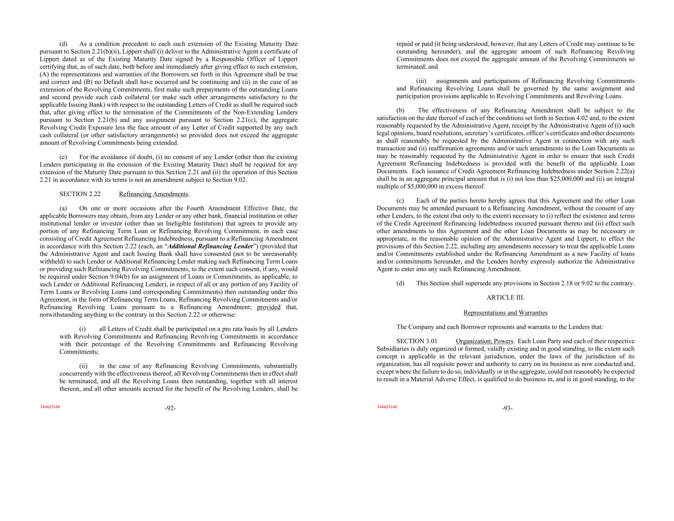 744627140 -92- (d) As a condition precedent to each such extension of the Existing Maturity Date pursuant to Section 2.21(b)(ii), Lippert shall (i) deliver to the Administrative Agent a certificate of Lippert dated as of the Existing Maturity Date signed by a Responsible Officer of Lippert certifying that, as of such date, both before and immediately after giving effect to such extension, (A) the representations and warranties of the Borrowers set forth in this Agreement shall be true and correct and (B) no Default shall have occurred and be continuing and (ii) in the case of an extension of the Revolving Commitments, first make such prepayments of the outstanding Loans and second provide such cash collateral (or make such other arrangements satisfactory to the applicable Issuing Bank) with respect to the outstanding Letters of Credit as shall be required such that, after giving effect to the termination of the Commitments of the Non-Extending Lenders pursuant to Section 2.21(b) and any assignment pursuant to Section 2.21(c), the aggregate Revolving Credit Exposure less the face amount of any Letter of Credit supported by any such cash collateral (or other satisfactory arrangements) so provided does not exceed the aggregate amount of Revolving Commitments being extended. (e) For the avoidance of doubt, (i) no consent of any Lender (other than the existing Lenders participating in the extension of the Existing Maturity Date) shall be required for any extension of the Maturity Date pursuant to this Section 2.21 and (ii) the operation of this Section 2.21 in accordance with its terms is not an amendment subject to Section 9.02. SECTION 2.22 Refinancing Amendments. (a) On one or more occasions after the Fourth Amendment Effective Date, the applicable Borrowers may obtain, from any Lender or any other bank, financial institution or other institutional lender or investor (other than an Ineligible Institution) that agrees to provide any portion of any Refinancing Term Loan or Refinancing Revolving Commitment, in each case consisting of Credit Agreement Refinancing Indebtedness, pursuant to a Refinancing Amendment in accordance with this Section 2.22 (each, an “Additional Refinancing Lender”) (provided that the Administrative Agent and each Issuing Bank shall have consented (not to be unreasonably withheld) to such Lender or Additional Refinancing Lender making such Refinancing Term Loans or providing such Refinancing Revolving Commitments, to the extent such consent, if any, would be required under Section 9.04(b) for an assignment of Loans or Commitments, as applicable, to such Lender or Additional Refinancing Lender), in respect of all or any portion of any Facility of Term Loans or Revolving Loans (and corresponding Commitments) then outstanding under this Agreement, in the form of Refinancing Term Loans, Refinancing Revolving Commitments and/or Refinancing Revolving Loans pursuant to a Refinancing Amendment; provided that, notwithstanding anything to the contrary in this Section 2.22 or otherwise: (i) all Letters of Credit shall be participated on a pro rata basis by all Lenders with Revolving Commitments and Refinancing Revolving Commitments in accordance with their percentage of the Revolving Commitments and Refinancing Revolving Commitments; (ii) in the case of any Refinancing Revolving Commitments, substantially concurrently with the effectiveness thereof, all Revolving Commitments then in effect shall be terminated, and all the Revolving Loans then outstanding, together with all interest thereon, and all other amounts accrued for the benefit of the Revolving Lenders, shall be 744627140 -93- repaid or paid (it being understood, however, that any Letters of Credit may continue to be outstanding hereunder), and the aggregate amount of such Refinancing Revolving Commitments does not exceed the aggregate amount of the Revolving Commitments so terminated; and (iii) assignments and participations of Refinancing Revolving Commitments and Refinancing Revolving Loans shall be governed by the same assignment and participation provisions applicable to Revolving Commitments and Revolving Loans. (b) The effectiveness of any Refinancing Amendment shall be subject to the satisfaction on the date thereof of each of the conditions set forth in Section 4.02 and, to the extent reasonably requested by the Administrative Agent, receipt by the Administrative Agent of (i) such legal opinions, board resolutions, secretary’s certificates, officer’s certificates and other documents as shall reasonably be requested by the Administrative Agent in connection with any such transaction and (ii) reaffirmation agreements and/or such amendments to the Loan Documents as may be reasonably requested by the Administrative Agent in order to ensure that such Credit Agreement Refinancing Indebtedness is provided with the benefit of the applicable Loan Documents. Each issuance of Credit Agreement Refinancing Indebtedness under Section 2.22(a) shall be in an aggregate principal amount that is (i) not less than $25,000,000 and (ii) an integral multiple of $5,000,000 in excess thereof. (c) Each of the parties hereto hereby agrees that this Agreement and the other Loan Documents may be amended pursuant to a Refinancing Amendment, without the consent of any other Lenders, to the extent (but only to the extent) necessary to (i) reflect the existence and terms of the Credit Agreement Refinancing Indebtedness incurred pursuant thereto and (ii) effect such other amendments to this Agreement and the other Loan Documents as may be necessary or appropriate, in the reasonable opinion of the Administrative Agent and Lippert, to effect the provisions of this Section 2.22, including any amendments necessary to treat the applicable Loans and/or Commitments established under the Refinancing Amendment as a new Facility of loans and/or commitments hereunder, and the Lenders hereby expressly authorize the Administrative Agent to enter into 