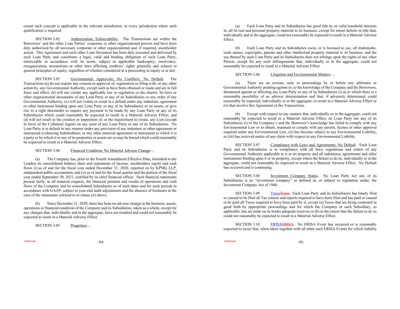 744627140 -94- extent such concept is applicable in the relevant jurisdiction, in every jurisdiction where such qualification is required. SECTION 3.02 Authorization; Enforceability. The Transactions are within the Borrowers’ and the other Loan Parties’ corporate or other organizational powers and have been duly authorized by all necessary corporate or other organizational and, if required, stockholder action. This Agreement and each other Loan Document has been duly executed and delivered by each Loan Party and constitutes a legal, valid and binding obligation of such Loan Party, enforceable in accordance with its terms, subject to applicable bankruptcy, insolvency, reorganization, moratorium or other laws affecting creditors’ rights generally and subject to general principles of equity, regardless of whether considered in a proceeding in equity or at law. SECTION 3.03 Governmental Approvals; No Conflicts; No Default. The Transactions (a) do not require any consent or approval of, registration or filing with, or any other action by, any Governmental Authority, except such as have been obtained or made and are in full force and effect, (b) will not violate any applicable law or regulation or the charter, by-laws or other organizational documents of any Loan Party or any of its Subsidiaries or any order of any Governmental Authority, (c) will not violate or result in a default under any indenture, agreement or other instrument binding upon any Loan Party or any of its Subsidiaries or its assets, or give rise to a right thereunder to require any payment to be made by any Loan Party or any of its Subsidiaries which could reasonably be expected to result in a Material Adverse Effect, and (d) will not result in the creation or imposition of, or the requirement to create, any Lien (except in favor of the Collateral Agent) on any asset of any Loan Party or any of its Subsidiaries. No Loan Party is in default in any manner under any provision of any indenture or other agreement or instrument evidencing Indebtedness, or any other material agreement or instrument to which it is a party or by which it or any of its properties or assets are or may be bound which could reasonably be expected to result in a Material Adverse Effect. SECTION 3.04 Financial Condition; No Material Adverse Change. . (a) The Company has, prior to the Fourth Amendment Effective Date, furnished to the Lenders its consolidated balance sheet and statements of income, stockholders equity and cash flows (i) as of and for the fiscal year ended December 31, 2020, reported on by KPMG LLP, independent public accountants, and (ii) as of and for the fiscal quarter and the portion of the fiscal year ended September 30, 2021, certified by its chief financial officer. Such financial statements present fairly, in all material respects, the financial position and results of operations and cash flows of the Company and its consolidated Subsidiaries as of such dates and for such periods in accordance with GAAP, subject to year-end audit adjustments and the absence of footnotes in the case of the statements referred to in clause (ii) above. (b) Since December 31, 2020, there has been no adverse change in the business, assets, operations or financial condition of the Company and its Subsidiaries, taken as a whole, except for any changes that, individually and in the aggregate, have not resulted and could not reasonably be expected to result in a Material Adverse Effect. SECTION 3.05 Properties. . 744627140 -95- (a) Each Loan Party and its Subsidiaries has good title to, or valid leasehold interests in, all its real and personal property material to its business, except for minor defects in title that, individually and in the aggregate, could not reasonably be expected to result in a Material Adverse Effect. (b) Each Loan Party and its Subsidiaries owns, or is licensed to use, all trademarks, trade names, copyrights, patents and other intellectual property material to its business, and the use thereof by such Loan Party and its Subsidiaries does not infringe upon the rights of any other Person, except for any such infringements that, individually or in the aggregate, could not reasonably be expected to result in a Material Adverse Effect. SECTION 3.06 Litigation and Environmental Matters. . (a) There are no actions, suits or proceedings by or before any arbitrator or Governmental Authority pending against or, to the knowledge of the Company and the Borrowers, threatened against or affecting any Loan Party or any of its Subsidiaries (i) as to which there is a reasonable possibility of an adverse determination and that, if adversely determined, could reasonably be expected, individually or in the aggregate, to result in a Material Adverse Effect or (ii) that involve this Agreement or the Transactions. (b) Except with respect to any matters that, individually or in the aggregate, could not reasonably be expected to result in a Material Adverse Effect, no Loan Party nor any of its Subsidiaries (i) to the Company’s and the Borrower’s knowledge has failed to comply with any Environmental Law or to obtain, maintain or comply with any permit, license or other approval required under any Environmental Law, (ii) has become subject to any Environmental Liability, or (iii) has received notice of any claim with respect to any Environmental Liability. SECTION 3.07 Compliance with Laws and Agreements; No Default. Each Loan Party and its Subsidiaries is in compliance with all laws, regulations and orders of any Governmental Authority applicable to it or its property and all indentures, agreements and other instruments binding upon it or its property, except where the failure to do so, individually or in the aggregate, could not reasonably be expected to result in a Material Adverse Effect. No Default has occurred and is continuing. SECTION 3.08 Investment Company Status. No Loan Party nor any of its Subsidiaries is an “investment company” as defin