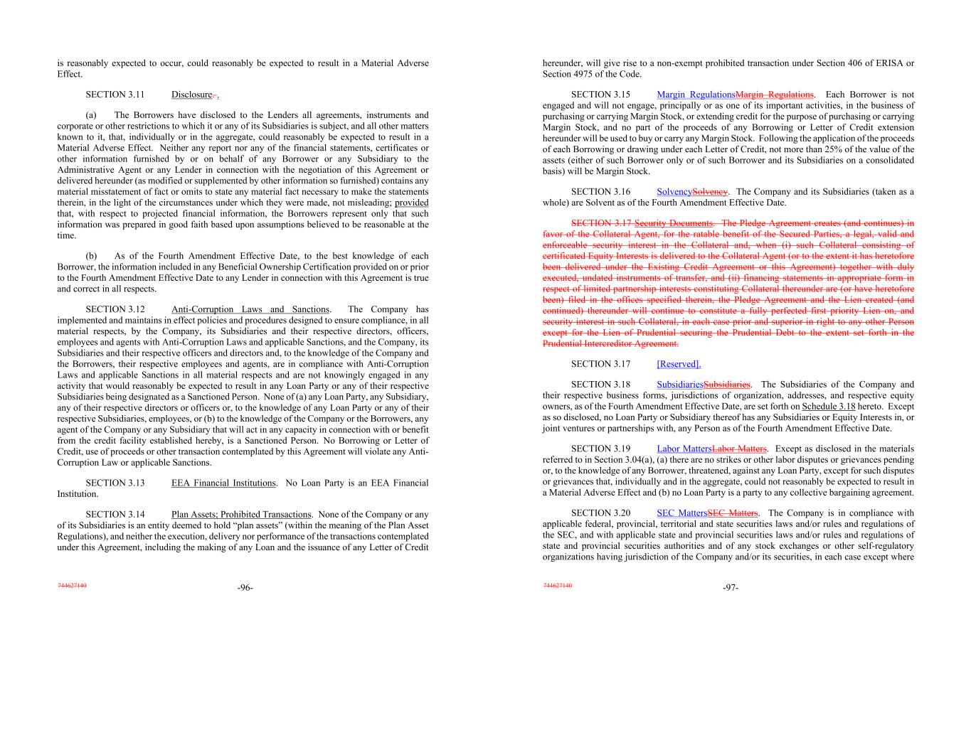 744627140 -96- is reasonably expected to occur, could reasonably be expected to result in a Material Adverse Effect. SECTION 3.11 Disclosure. . (a) The Borrowers have disclosed to the Lenders all agreements, instruments and corporate or other restrictions to which it or any of its Subsidiaries is subject, and all other matters known to it, that, individually or in the aggregate, could reasonably be expected to result in a Material Adverse Effect. Neither any report nor any of the financial statements, certificates or other information furnished by or on behalf of any Borrower or any Subsidiary to the Administrative Agent or any Lender in connection with the negotiation of this Agreement or delivered hereunder (as modified or supplemented by other information so furnished) contains any material misstatement of fact or omits to state any material fact necessary to make the statements therein, in the light of the circumstances under which they were made, not misleading; provided that, with respect to projected financial information, the Borrowers represent only that such information was prepared in good faith based upon assumptions believed to be reasonable at the time. (b) As of the Fourth Amendment Effective Date, to the best knowledge of each Borrower, the information included in any Beneficial Ownership Certification provided on or prior to the Fourth Amendment Effective Date to any Lender in connection with this Agreement is true and correct in all respects. SECTION 3.12 Anti-Corruption Laws and Sanctions. The Company has implemented and maintains in effect policies and procedures designed to ensure compliance, in all material respects, by the Company, its Subsidiaries and their respective directors, officers, employees and agents with Anti-Corruption Laws and applicable Sanctions, and the Company, its Subsidiaries and their respective officers and directors and, to the knowledge of the Company and the Borrowers, their respective employees and agents, are in compliance with Anti-Corruption Laws and applicable Sanctions in all material respects and are not knowingly engaged in any activity that would reasonably be expected to result in any Loan Party or any of their respective Subsidiaries being designated as a Sanctioned Person. None of (a) any Loan Party, any Subsidiary, any of their respective directors or officers or, to the knowledge of any Loan Party or any of their respective Subsidiaries, employees, or (b) to the knowledge of the Company or the Borrowers, any agent of the Company or any Subsidiary that will act in any capacity in connection with or benefit from the credit facility established hereby, is a Sanctioned Person. No Borrowing or Letter of Credit, use of proceeds or other transaction contemplated by this Agreement will violate any Anti- Corruption Law or applicable Sanctions. SECTION 3.13 EEA Financial Institutions. No Loan Party is an EEA Financial Institution. SECTION 3.14 Plan Assets; Prohibited Transactions. None of the Company or any of its Subsidiaries is an entity deemed to hold “plan assets” (within the meaning of the Plan Asset Regulations), and neither the execution, delivery nor performance of the transactions contemplated under this Agreement, including the making of any Loan and the issuance of any Letter of Credit 744627140 -97- hereunder, will give rise to a non-exempt prohibited transaction under Section 406 of ERISA or Section 4975 of the Code. SECTION 3.15 Margin RegulationsMargin Regulations. Each Borrower is not engaged and will not engage, principally or as one of its important activities, in the business of purchasing or carrying Margin Stock, or extending credit for the purpose of purchasing or carrying Margin Stock, and no part of the proceeds of any Borrowing or Letter of Credit extension hereunder will be used to buy or carry any Margin Stock. Following the application of the proceeds of each Borrowing or drawing under each Letter of Credit, not more than 25% of the value of the assets (either of such Borrower only or of such Borrower and its Subsidiaries on a consolidated basis) will be Margin Stock. SECTION 3.16 SolvencySolvency. The Company and its Subsidiaries (taken as a whole) are Solvent as of the Fourth Amendment Effective Date. SECTION 3.17 Security Documents. The Pledge Agreement creates (and continues) in favor of the Collateral Agent, for the ratable benefit of the Secured Parties, a legal, valid and enforceable security interest in the Collateral and, when (i) such Collateral consisting of certificated Equity Interests is delivered to the Collateral Agent (or to the extent it has heretofore been delivered under the Existing Credit Agreement or this Agreement) together with duly executed, undated instruments of transfer, and (ii) financing statements in appropriate form in respect of limited partnership interests constituting Collateral thereunder are (or have heretofore been) filed in the offices specified therein, the Pledge Agreement and the Lien created (and continued) thereunder will continue to constitute a fully perfected first priority Lien on, and security interest in such Collateral, in each case prior and superior in right to any other Person except for the Lien of Prudential securing the Prudential Debt to the extent set forth in the Prudential Intercreditor Agreement. SECTION 3.17 [Reserved]. SECTION 3.18 SubsidiariesSubsidiaries. The Subsidiaries of the Company and their respective business forms, jurisdictions of organization, addresses, and respective equity owners, as of the Fourth Amendment Effective Date, are set forth on Schedule 3.18 hereto. Except as so disclosed, no Loan Party or Subsidiary thereof has any Subsidiaries or Equity Interests in, or joint ventures or partnerships with, any Person as of the Fourth Amendment Effective Date. SECTION 3.19 Labor MattersLabor Matters. Except as disclosed in the materials referred to in Section 3.04(a), (a) there are no strikes or other labor disputes or grievances 