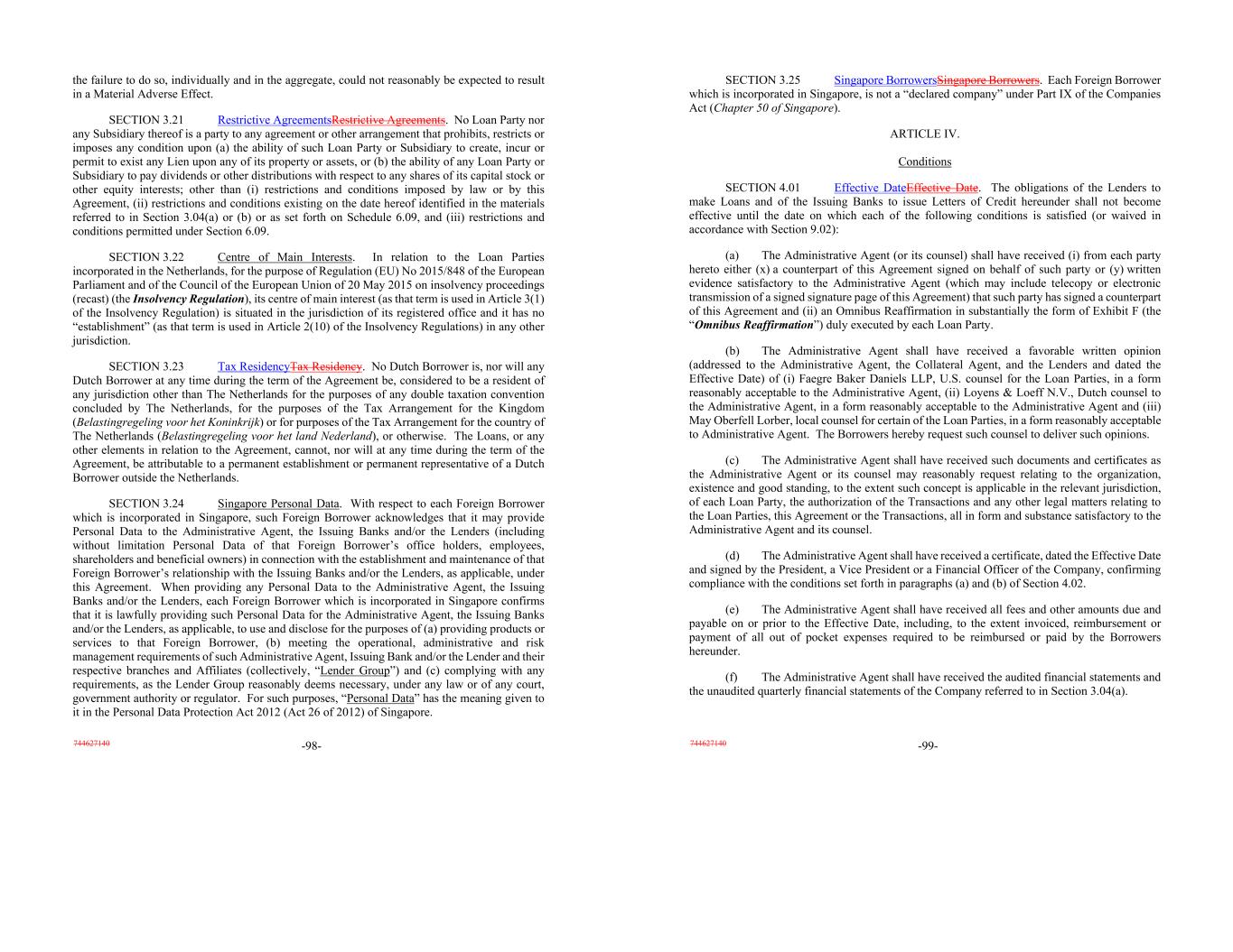 744627140 -98- the failure to do so, individually and in the aggregate, could not reasonably be expected to result in a Material Adverse Effect. SECTION 3.21 Restrictive AgreementsRestrictive Agreements. No Loan Party nor any Subsidiary thereof is a party to any agreement or other arrangement that prohibits, restricts or imposes any condition upon (a) the ability of such Loan Party or Subsidiary to create, incur or permit to exist any Lien upon any of its property or assets, or (b) the ability of any Loan Party or Subsidiary to pay dividends or other distributions with respect to any shares of its capital stock or other equity interests; other than (i) restrictions and conditions imposed by law or by this Agreement, (ii) restrictions and conditions existing on the date hereof identified in the materials referred to in Section 3.04(a) or (b) or as set forth on Schedule 6.09, and (iii) restrictions and conditions permitted under Section 6.09. SECTION 3.22 Centre of Main Interests. In relation to the Loan Parties incorporated in the Netherlands, for the purpose of Regulation (EU) No 2015/848 of the European Parliament and of the Council of the European Union of 20 May 2015 on insolvency proceedings (recast) (the Insolvency Regulation), its centre of main interest (as that term is used in Article 3(1) of the Insolvency Regulation) is situated in the jurisdiction of its registered office and it has no “establishment” (as that term is used in Article 2(10) of the Insolvency Regulations) in any other jurisdiction. SECTION 3.23 Tax ResidencyTax Residency. No Dutch Borrower is, nor will any Dutch Borrower at any time during the term of the Agreement be, considered to be a resident of any jurisdiction other than The Netherlands for the purposes of any double taxation convention concluded by The Netherlands, for the purposes of the Tax Arrangement for the Kingdom (Belastingregeling voor het Koninkrijk) or for purposes of the Tax Arrangement for the country of The Netherlands (Belastingregeling voor het land Nederland), or otherwise. The Loans, or any other elements in relation to the Agreement, cannot, nor will at any time during the term of the Agreement, be attributable to a permanent establishment or permanent representative of a Dutch Borrower outside the Netherlands. SECTION 3.24 Singapore Personal Data. With respect to each Foreign Borrower which is incorporated in Singapore, such Foreign Borrower acknowledges that it may provide Personal Data to the Administrative Agent, the Issuing Banks and/or the Lenders (including without limitation Personal Data of that Foreign Borrower’s office holders, employees, shareholders and beneficial owners) in connection with the establishment and maintenance of that Foreign Borrower’s relationship with the Issuing Banks and/or the Lenders, as applicable, under this Agreement. When providing any Personal Data to the Administrative Agent, the Issuing Banks and/or the Lenders, each Foreign Borrower which is incorporated in Singapore confirms that it is lawfully providing such Personal Data for the Administrative Agent, the Issuing Banks and/or the Lenders, as applicable, to use and disclose for the purposes of (a) providing products or services to that Foreign Borrower, (b) meeting the operational, administrative and risk management requirements of such Administrative Agent, Issuing Bank and/or the Lender and their respective branches and Affiliates (collectively, “Lender Group”) and (c) complying with any requirements, as the Lender Group reasonably deems necessary, under any law or of any court, government authority or regulator. For such purposes, “Personal Data” has the meaning given to it in the Personal Data Protection Act 2012 (Act 26 of 2012) of Singapore. 744627140 -99- SECTION 3.25 Singapore BorrowersSingapore Borrowers. Each Foreign Borrower which is incorporated in Singapore, is not a “declared company” under Part IX of the Companies Act (Chapter 50 of Singapore). ARTICLE IV. Conditions SECTION 4.01 Effective DateEffective Date. The obligations of the Lenders to make Loans and of the Issuing Banks to issue Letters of Credit hereunder shall not become effective until the date on which each of the following conditions is satisfied (or waived in accordance with Section 9.02): (a) The Administrative Agent (or its counsel) shall have received (i) from each party hereto either (x) a counterpart of this Agreement signed on behalf of such party or (y) written evidence satisfactory to the Administrative Agent (which may include telecopy or electronic transmission of a signed signature page of this Agreement) that such party has signed a counterpart of this Agreement and (ii) an Omnibus Reaffirmation in substantially the form of Exhibit F (the “Omnibus Reaffirmation”) duly executed by each Loan Party. (b) The Administrative Agent shall have received a favorable written opinion (addressed to the Administrative Agent, the Collateral Agent, and the Lenders and dated the Effective Date) of (i) Faegre Baker Daniels LLP, U.S. counsel for the Loan Parties, in a form reasonably acceptable to the Administrative Agent, (ii) Loyens & Loeff N.V., Dutch counsel to the Administrative Agent, in a form reasonably acceptable to the Administrative Agent and (iii) May Oberfell Lorber, local counsel for certain of the Loan Parties, in a form reasonably acceptable to Administrative Agent. The Borrowers hereby request such counsel to deliver such opinions. (c) The Administrative Agent shall have received such documents and certificates as the Administrative Agent or its counsel may reasonably request relating to the organization, existence and good standing, to the extent such concept is applicable in the relevant jurisdiction, of each Loan Party, the authorization of the Transactions and any other legal matters relating to the Loan Parties, this Agreement or the Transactions, all in form and substance satisfactory to the Administrative Agent and its counsel