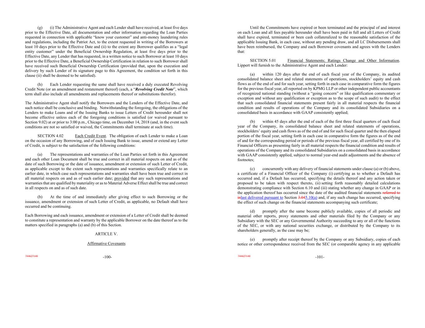 744627140 -100- (g) (i) The Administrative Agent and each Lender shall have received, at least five days prior to the Effective Date, all documentation and other information regarding the Loan Parties requested in connection with applicable “know your customer” and anti-money laundering rules and regulations, including the Patriot Act, to the extent requested in writing of the Borrowers at least 10 days prior to the Effective Date and (ii) to the extent any Borrower qualifies as a “legal entity customer” under the Beneficial Ownership Regulation, at least five days prior to the Effective Date, any Lender that has requested, in a written notice to such Borrower at least 10 days prior to the Effective Date, a Beneficial Ownership Certification in relation to such Borrower shall have received such Beneficial Ownership Certification (provided that, upon the execution and delivery by such Lender of its signature page to this Agreement, the condition set forth in this clause (ii) shall be deemed to be satisfied). (h) Each Lender requesting the same shall have received a duly executed Revolving Credit Note (or an amendment and restatement thereof) (each, a “Revolving Credit Note”, which term shall also include all amendments and replacements thereof or substitutions therefor). The Administrative Agent shall notify the Borrowers and the Lenders of the Effective Date, and such notice shall be conclusive and binding. Notwithstanding the foregoing, the obligations of the Lenders to make Loans and of the Issuing Banks to issue Letters of Credit hereunder shall not become effective unless each of the foregoing conditions is satisfied (or waived pursuant to Section 9.02) at or prior to 3:00 p.m., Chicago time, on December 14, 2018 (and, in the event such conditions are not so satisfied or waived, the Commitments shall terminate at such time). SECTION 4.02 Each Credit Event. The obligation of each Lender to make a Loan on the occasion of any Borrowing, and of each Issuing Bank to issue, amend or extend any Letter of Credit, is subject to the satisfaction of the following conditions: (a) The representations and warranties of the Loan Parties set forth in this Agreement and each other Loan Document shall be true and correct in all material respects on and as of the date of such Borrowing or the date of issuance, amendment or extension of such Letter of Credit, as applicable except to the extent such representations and warranties specifically relate to an earlier date, in which case such representations and warranties shall have been true and correct in all material respects on and as of such earlier date; provided that any such representations and warranties that are qualified by materiality or as to Material Adverse Effect shall be true and correct in all respects on and as of such date. (b) At the time of and immediately after giving effect to such Borrowing or the issuance, amendment or extension of such Letter of Credit, as applicable, no Default shall have occurred and be continuing. Each Borrowing and each issuance, amendment or extension of a Letter of Credit shall be deemed to constitute a representation and warranty by the applicable Borrower on the date thereof as to the matters specified in paragraphs (a) and (b) of this Section. ARTICLE V. Affirmative Covenants 744627140 -101- Until the Commitments have expired or been terminated and the principal of and interest on each Loan and all fees payable hereunder shall have been paid in full and all Letters of Credit shall have expired, terminated or been cash collateralized to the reasonable satisfaction of the applicable Issuing Bank, in each case, without any pending draw, and all LC Disbursements shall have been reimbursed, the Company and each Borrower covenants and agrees with the Lenders that: SECTION 5.01 Financial Statements; Ratings Change and Other Information. Lippert will furnish to the Administrative Agent and each Lender: (a) within 120 days after the end of each fiscal year of the Company, its audited consolidated balance sheet and related statements of operations, stockholders’ equity and cash flows as of the end of and for such year, setting forth in each case in comparative form the figures for the previous fiscal year, all reported on by KPMG LLP or other independent public accountants of recognized national standing (without a “going concern” or like qualification commentary or exception and without any qualification or exception as to the scope of such audit) to the effect that such consolidated financial statements present fairly in all material respects the financial condition and results of operations of the Company and its consolidated Subsidiaries on a consolidated basis in accordance with GAAP consistently applied; (b) within 45 days after the end of each of the first three fiscal quarters of each fiscal year of the Company, its consolidated balance sheet and related statements of operations, stockholders’ equity and cash flows as of the end of and for such fiscal quarter and the then elapsed portion of the fiscal year, setting forth in each case in comparative form the figures as of the end of and for the corresponding period or periods of the previous fiscal year, all certified by one of its Financial Officers as presenting fairly in all material respects the financial condition and results of operations of the Company and its consolidated Subsidiaries on a consolidated basis in accordance with GAAP consistently applied, subject to normal year-end audit adjustments and the absence of footnotes; (c) concurrently with any delivery of financial statements under clause (a) or (b) above, a certificate of a Financial Officer of the Company (i) certifying as to whether a Default has occurred and, if a Default has occurred, specifying the details thereof and any action taken or proposed to be taken with respect thereto, (ii) setting forth reasonably detailed calculations demonstrating compliance with Sectio