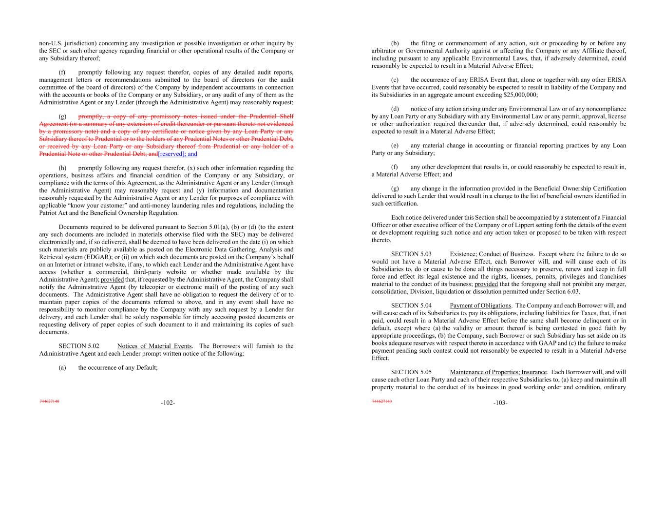 744627140 -102- non-U.S. jurisdiction) concerning any investigation or possible investigation or other inquiry by the SEC or such other agency regarding financial or other operational results of the Company or any Subsidiary thereof; (f) promptly following any request therefor, copies of any detailed audit reports, management letters or recommendations submitted to the board of directors (or the audit committee of the board of directors) of the Company by independent accountants in connection with the accounts or books of the Company or any Subsidiary, or any audit of any of them as the Administrative Agent or any Lender (through the Administrative Agent) may reasonably request; (g) promptly, a copy of any promissory notes issued under the Prudential Shelf Agreement (or a summary of any extension of credit thereunder or pursuant thereto not evidenced by a promissory note) and a copy of any certificate or notice given by any Loan Party or any Subsidiary thereof to Prudential or to the holders of any Prudential Notes or other Prudential Debt, or received by any Loan Party or any Subsidiary thereof from Prudential or any holder of a Prudential Note or other Prudential Debt; and[reserved]; and (h) promptly following any request therefor, (x) such other information regarding the operations, business affairs and financial condition of the Company or any Subsidiary, or compliance with the terms of this Agreement, as the Administrative Agent or any Lender (through the Administrative Agent) may reasonably request and (y) information and documentation reasonably requested by the Administrative Agent or any Lender for purposes of compliance with applicable “know your customer” and anti-money laundering rules and regulations, including the Patriot Act and the Beneficial Ownership Regulation. Documents required to be delivered pursuant to Section 5.01(a), (b) or (d) (to the extent any such documents are included in materials otherwise filed with the SEC) may be delivered electronically and, if so delivered, shall be deemed to have been delivered on the date (i) on which such materials are publicly available as posted on the Electronic Data Gathering, Analysis and Retrieval system (EDGAR); or (ii) on which such documents are posted on the Company’s behalf on an Internet or intranet website, if any, to which each Lender and the Administrative Agent have access (whether a commercial, third-party website or whether made available by the Administrative Agent); provided that, if requested by the Administrative Agent, the Company shall notify the Administrative Agent (by telecopier or electronic mail) of the posting of any such documents. The Administrative Agent shall have no obligation to request the delivery of or to maintain paper copies of the documents referred to above, and in any event shall have no responsibility to monitor compliance by the Company with any such request by a Lender for delivery, and each Lender shall be solely responsible for timely accessing posted documents or requesting delivery of paper copies of such document to it and maintaining its copies of such documents. SECTION 5.02 Notices of Material Events. The Borrowers will furnish to the Administrative Agent and each Lender prompt written notice of the following: (a) the occurrence of any Default; 744627140 -103- (b) the filing or commencement of any action, suit or proceeding by or before any arbitrator or Governmental Authority against or affecting the Company or any Affiliate thereof, including pursuant to any applicable Environmental Laws, that, if adversely determined, could reasonably be expected to result in a Material Adverse Effect; (c) the occurrence of any ERISA Event that, alone or together with any other ERISA Events that have occurred, could reasonably be expected to result in liability of the Company and its Subsidiaries in an aggregate amount exceeding $25,000,000; (d) notice of any action arising under any Environmental Law or of any noncompliance by any Loan Party or any Subsidiary with any Environmental Law or any permit, approval, license or other authorization required thereunder that, if adversely determined, could reasonably be expected to result in a Material Adverse Effect; (e) any material change in accounting or financial reporting practices by any Loan Party or any Subsidiary; (f) any other development that results in, or could reasonably be expected to result in, a Material Adverse Effect; and (g) any change in the information provided in the Beneficial Ownership Certification delivered to such Lender that would result in a change to the list of beneficial owners identified in such certification. Each notice delivered under this Section shall be accompanied by a statement of a Financial Officer or other executive officer of the Company or of Lippert setting forth the details of the event or development requiring such notice and any action taken or proposed to be taken with respect thereto. SECTION 5.03 Existence; Conduct of Business. Except where the failure to do so would not have a Material Adverse Effect, each Borrower will, and will cause each of its Subsidiaries to, do or cause to be done all things necessary to preserve, renew and keep in full force and effect its legal existence and the rights, licenses, permits, privileges and franchises material to the conduct of its business; provided that the foregoing shall not prohibit any merger, consolidation, Division, liquidation or dissolution permitted under Section 6.03. SECTION 5.04 Payment of Obligations. The Company and each Borrower will, and will cause each of its Subsidiaries to, pay its obligations, including liabilities for Taxes, that, if not paid, could result in a Material Adverse Effect before the same shall become delinquent or in default, except where (a) the validity or amount thereof is being contested in good faith by appropriate proceedings, (b) the Company, such Borrower or such Subsidiary has set aside on its books adequat