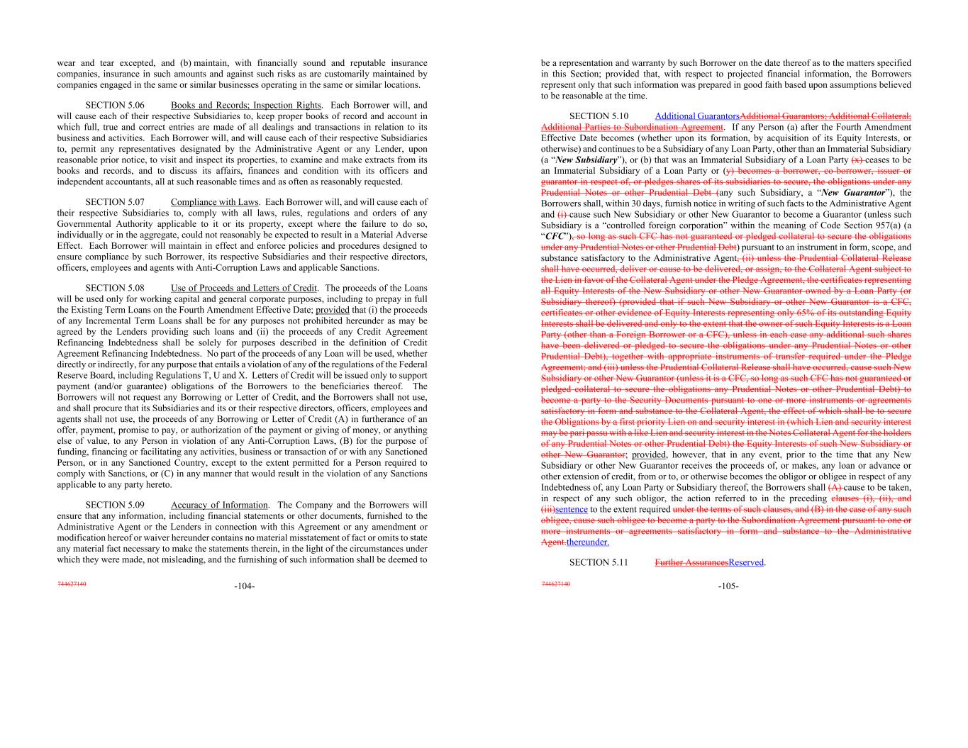 744627140 -104- wear and tear excepted, and (b) maintain, with financially sound and reputable insurance companies, insurance in such amounts and against such risks as are customarily maintained by companies engaged in the same or similar businesses operating in the same or similar locations. SECTION 5.06 Books and Records; Inspection Rights. Each Borrower will, and will cause each of their respective Subsidiaries to, keep proper books of record and account in which full, true and correct entries are made of all dealings and transactions in relation to its business and activities. Each Borrower will, and will cause each of their respective Subsidiaries to, permit any representatives designated by the Administrative Agent or any Lender, upon reasonable prior notice, to visit and inspect its properties, to examine and make extracts from its books and records, and to discuss its affairs, finances and condition with its officers and independent accountants, all at such reasonable times and as often as reasonably requested. SECTION 5.07 Compliance with Laws. Each Borrower will, and will cause each of their respective Subsidiaries to, comply with all laws, rules, regulations and orders of any Governmental Authority applicable to it or its property, except where the failure to do so, individually or in the aggregate, could not reasonably be expected to result in a Material Adverse Effect. Each Borrower will maintain in effect and enforce policies and procedures designed to ensure compliance by such Borrower, its respective Subsidiaries and their respective directors, officers, employees and agents with Anti-Corruption Laws and applicable Sanctions. SECTION 5.08 Use of Proceeds and Letters of Credit. The proceeds of the Loans will be used only for working capital and general corporate purposes, including to prepay in full the Existing Term Loans on the Fourth Amendment Effective Date; provided that (i) the proceeds of any Incremental Term Loans shall be for any purposes not prohibited hereunder as may be agreed by the Lenders providing such loans and (ii) the proceeds of any Credit Agreement Refinancing Indebtedness shall be solely for purposes described in the definition of Credit Agreement Refinancing Indebtedness. No part of the proceeds of any Loan will be used, whether directly or indirectly, for any purpose that entails a violation of any of the regulations of the Federal Reserve Board, including Regulations T, U and X. Letters of Credit will be issued only to support payment (and/or guarantee) obligations of the Borrowers to the beneficiaries thereof. The Borrowers will not request any Borrowing or Letter of Credit, and the Borrowers shall not use, and shall procure that its Subsidiaries and its or their respective directors, officers, employees and agents shall not use, the proceeds of any Borrowing or Letter of Credit (A) in furtherance of an offer, payment, promise to pay, or authorization of the payment or giving of money, or anything else of value, to any Person in violation of any Anti-Corruption Laws, (B) for the purpose of funding, financing or facilitating any activities, business or transaction of or with any Sanctioned Person, or in any Sanctioned Country, except to the extent permitted for a Person required to comply with Sanctions, or (C) in any manner that would result in the violation of any Sanctions applicable to any party hereto. SECTION 5.09 Accuracy of Information. The Company and the Borrowers will ensure that any information, including financial statements or other documents, furnished to the Administrative Agent or the Lenders in connection with this Agreement or any amendment or modification hereof or waiver hereunder contains no material misstatement of fact or omits to state any material fact necessary to make the statements therein, in the light of the circumstances under which they were made, not misleading, and the furnishing of such information shall be deemed to 744627140 -105- be a representation and warranty by such Borrower on the date thereof as to the matters specified in this Section; provided that, with respect to projected financial information, the Borrowers represent only that such information was prepared in good faith based upon assumptions believed to be reasonable at the time. SECTION 5.10 Additional GuarantorsAdditional Guarantors; Additional Collateral; Additional Parties to Subordination Agreement. If any Person (a) after the Fourth Amendment Effective Date becomes (whether upon its formation, by acquisition of its Equity Interests, or otherwise) and continues to be a Subsidiary of any Loan Party, other than an Immaterial Subsidiary (a “New Subsidiary”), or (b) that was an Immaterial Subsidiary of a Loan Party (x) ceases to be an Immaterial Subsidiary of a Loan Party or (y) becomes a borrower, co-borrower, issuer or guarantor in respect of, or pledges shares of its subsidiaries to secure, the obligations under any Prudential Notes or other Prudential Debt (any such Subsidiary, a “New Guarantor”), the Borrowers shall, within 30 days, furnish notice in writing of such facts to the Administrative Agent and (i) cause such New Subsidiary or other New Guarantor to become a Guarantor (unless such Subsidiary is a “controlled foreign corporation” within the meaning of Code Section 957(a) (a “CFC”), so long as such CFC has not guaranteed or pledged collateral to secure the obligations under any Prudential Notes or other Prudential Debt) pursuant to an instrument in form, scope, and substance satisfactory to the Administrative Agent, (ii) unless the Prudential Collateral Release shall have occurred, deliver or cause to be delivered, or assign, to the Collateral Agent subject to the Lien in favor of the Collateral Agent under the Pledge Agreement, the certificates representing all Equity Interests of the New Subsidiary or other New Guarantor owned by a Loan Party (or Subsidiary thereof) (provided that if such New Subsidiary or other New 