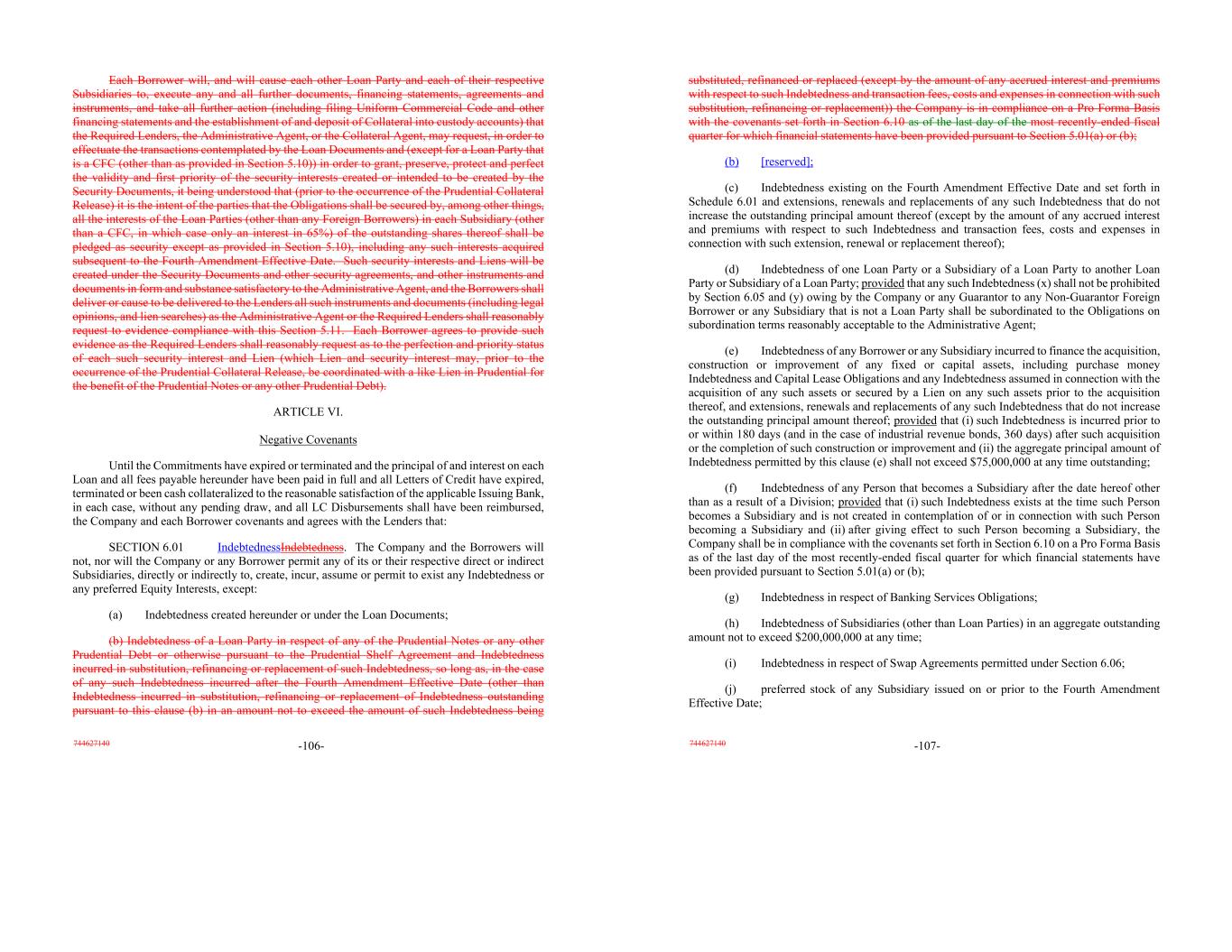 744627140 -106- Each Borrower will, and will cause each other Loan Party and each of their respective Subsidiaries to, execute any and all further documents, financing statements, agreements and instruments, and take all further action (including filing Uniform Commercial Code and other financing statements and the establishment of and deposit of Collateral into custody accounts) that the Required Lenders, the Administrative Agent, or the Collateral Agent, may request, in order to effectuate the transactions contemplated by the Loan Documents and (except for a Loan Party that is a CFC (other than as provided in Section 5.10)) in order to grant, preserve, protect and perfect the validity and first priority of the security interests created or intended to be created by the Security Documents, it being understood that (prior to the occurrence of the Prudential Collateral Release) it is the intent of the parties that the Obligations shall be secured by, among other things, all the interests of the Loan Parties (other than any Foreign Borrowers) in each Subsidiary (other than a CFC, in which case only an interest in 65%) of the outstanding shares thereof shall be pledged as security except as provided in Section 5.10), including any such interests acquired subsequent to the Fourth Amendment Effective Date. Such security interests and Liens will be created under the Security Documents and other security agreements, and other instruments and documents in form and substance satisfactory to the Administrative Agent, and the Borrowers shall deliver or cause to be delivered to the Lenders all such instruments and documents (including legal opinions, and lien searches) as the Administrative Agent or the Required Lenders shall reasonably request to evidence compliance with this Section 5.11. Each Borrower agrees to provide such evidence as the Required Lenders shall reasonably request as to the perfection and priority status of each such security interest and Lien (which Lien and security interest may, prior to the occurrence of the Prudential Collateral Release, be coordinated with a like Lien in Prudential for the benefit of the Prudential Notes or any other Prudential Debt). ARTICLE VI. Negative Covenants Until the Commitments have expired or terminated and the principal of and interest on each Loan and all fees payable hereunder have been paid in full and all Letters of Credit have expired, terminated or been cash collateralized to the reasonable satisfaction of the applicable Issuing Bank, in each case, without any pending draw, and all LC Disbursements shall have been reimbursed, the Company and each Borrower covenants and agrees with the Lenders that: SECTION 6.01 IndebtednessIndebtedness. The Company and the Borrowers will not, nor will the Company or any Borrower permit any of its or their respective direct or indirect Subsidiaries, directly or indirectly to, create, incur, assume or permit to exist any Indebtedness or any preferred Equity Interests, except: (a) Indebtedness created hereunder or under the Loan Documents; (b) Indebtedness of a Loan Party in respect of any of the Prudential Notes or any other Prudential Debt or otherwise pursuant to the Prudential Shelf Agreement and Indebtedness incurred in substitution, refinancing or replacement of such Indebtedness, so long as, in the case of any such Indebtedness incurred after the Fourth Amendment Effective Date (other than Indebtedness incurred in substitution, refinancing or replacement of Indebtedness outstanding pursuant to this clause (b) in an amount not to exceed the amount of such Indebtedness being 744627140 -107- substituted, refinanced or replaced (except by the amount of any accrued interest and premiums with respect to such Indebtedness and transaction fees, costs and expenses in connection with such substitution, refinancing or replacement)) the Company is in compliance on a Pro Forma Basis with the covenants set forth in Section 6.10 as of the last day of the most recently-ended fiscal quarter for which financial statements have been provided pursuant to Section 5.01(a) or (b); (b) [reserved]; (c) Indebtedness existing on the Fourth Amendment Effective Date and set forth in Schedule 6.01 and extensions, renewals and replacements of any such Indebtedness that do not increase the outstanding principal amount thereof (except by the amount of any accrued interest and premiums with respect to such Indebtedness and transaction fees, costs and expenses in connection with such extension, renewal or replacement thereof); (d) Indebtedness of one Loan Party or a Subsidiary of a Loan Party to another Loan Party or Subsidiary of a Loan Party; provided that any such Indebtedness (x) shall not be prohibited by Section 6.05 and (y) owing by the Company or any Guarantor to any Non-Guarantor Foreign Borrower or any Subsidiary that is not a Loan Party shall be subordinated to the Obligations on subordination terms reasonably acceptable to the Administrative Agent; (e) Indebtedness of any Borrower or any Subsidiary incurred to finance the acquisition, construction or improvement of any fixed or capital assets, including purchase money Indebtedness and Capital Lease Obligations and any Indebtedness assumed in connection with the acquisition of any such assets or secured by a Lien on any such assets prior to the acquisition thereof, and extensions, renewals and replacements of any such Indebtedness that do not increase the outstanding principal amount thereof; provided that (i) such Indebtedness is incurred prior to or within 180 days (and in the case of industrial revenue bonds, 360 days) after such acquisition or the completion of such construction or improvement and (ii) the aggregate principal amount of Indebtedness permitted by this clause (e) shall not exceed $75,000,000 at any time outstanding; (f) Indebtedness of any Person that becomes a Subsidiary after the date hereof other than as a result of a Division; provided that (i) such Indeb