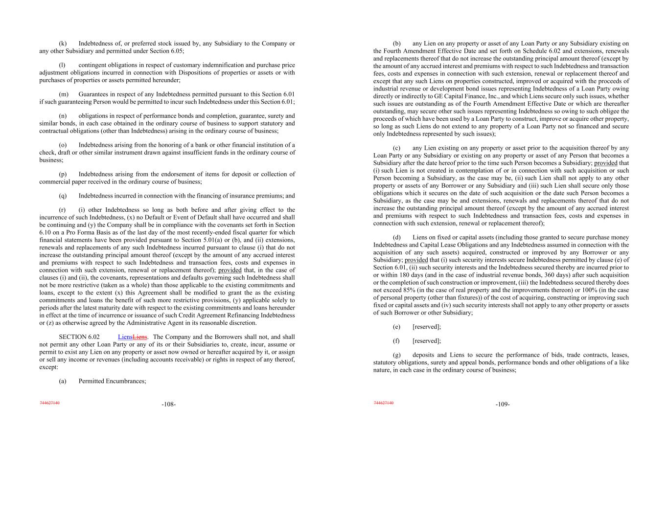 744627140 -108- (k) Indebtedness of, or preferred stock issued by, any Subsidiary to the Company or any other Subsidiary and permitted under Section 6.05; (l) contingent obligations in respect of customary indemnification and purchase price adjustment obligations incurred in connection with Dispositions of properties or assets or with purchases of properties or assets permitted hereunder; (m) Guarantees in respect of any Indebtedness permitted pursuant to this Section 6.01 if such guaranteeing Person would be permitted to incur such Indebtedness under this Section 6.01; (n) obligations in respect of performance bonds and completion, guarantee, surety and similar bonds, in each case obtained in the ordinary course of business to support statutory and contractual obligations (other than Indebtedness) arising in the ordinary course of business; (o) Indebtedness arising from the honoring of a bank or other financial institution of a check, draft or other similar instrument drawn against insufficient funds in the ordinary course of business; (p) Indebtedness arising from the endorsement of items for deposit or collection of commercial paper received in the ordinary course of business; (q) Indebtedness incurred in connection with the financing of insurance premiums; and (r) (i) other Indebtedness so long as both before and after giving effect to the incurrence of such Indebtedness, (x) no Default or Event of Default shall have occurred and shall be continuing and (y) the Company shall be in compliance with the covenants set forth in Section 6.10 on a Pro Forma Basis as of the last day of the most recently-ended fiscal quarter for which financial statements have been provided pursuant to Section 5.01(a) or (b), and (ii) extensions, renewals and replacements of any such Indebtedness incurred pursuant to clause (i) that do not increase the outstanding principal amount thereof (except by the amount of any accrued interest and premiums with respect to such Indebtedness and transaction fees, costs and expenses in connection with such extension, renewal or replacement thereof); provided that, in the case of clauses (i) and (ii), the covenants, representations and defaults governing such Indebtedness shall not be more restrictive (taken as a whole) than those applicable to the existing commitments and loans, except to the extent (x) this Agreement shall be modified to grant the as the existing commitments and loans the benefit of such more restrictive provisions, (y) applicable solely to periods after the latest maturity date with respect to the existing commitments and loans hereunder in effect at the time of incurrence or issuance of such Credit Agreement Refinancing Indebtedness or (z) as otherwise agreed by the Administrative Agent in its reasonable discretion. SECTION 6.02 LiensLiens. The Company and the Borrowers shall not, and shall not permit any other Loan Party or any of its or their Subsidiaries to, create, incur, assume or permit to exist any Lien on any property or asset now owned or hereafter acquired by it, or assign or sell any income or revenues (including accounts receivable) or rights in respect of any thereof, except: (a) Permitted Encumbrances; 744627140 -109- (b) any Lien on any property or asset of any Loan Party or any Subsidiary existing on the Fourth Amendment Effective Date and set forth on Schedule 6.02 and extensions, renewals and replacements thereof that do not increase the outstanding principal amount thereof (except by the amount of any accrued interest and premiums with respect to such Indebtedness and transaction fees, costs and expenses in connection with such extension, renewal or replacement thereof and except that any such Liens on properties constructed, improved or acquired with the proceeds of industrial revenue or development bond issues representing Indebtedness of a Loan Party owing directly or indirectly to GE Capital Finance, Inc., and which Liens secure only such issues, whether such issues are outstanding as of the Fourth Amendment Effective Date or which are thereafter outstanding, may secure other such issues representing Indebtedness so owing to such obligee the proceeds of which have been used by a Loan Party to construct, improve or acquire other property, so long as such Liens do not extend to any property of a Loan Party not so financed and secure only Indebtedness represented by such issues); (c) any Lien existing on any property or asset prior to the acquisition thereof by any Loan Party or any Subsidiary or existing on any property or asset of any Person that becomes a Subsidiary after the date hereof prior to the time such Person becomes a Subsidiary; provided that (i) such Lien is not created in contemplation of or in connection with such acquisition or such Person becoming a Subsidiary, as the case may be, (ii) such Lien shall not apply to any other property or assets of any Borrower or any Subsidiary and (iii) such Lien shall secure only those obligations which it secures on the date of such acquisition or the date such Person becomes a Subsidiary, as the case may be and extensions, renewals and replacements thereof that do not increase the outstanding principal amount thereof (except by the amount of any accrued interest and premiums with respect to such Indebtedness and transaction fees, costs and expenses in connection with such extension, renewal or replacement thereof); (d) Liens on fixed or capital assets (including those granted to secure purchase money Indebtedness and Capital Lease Obligations and any Indebtedness assumed in connection with the acquisition of any such assets) acquired, constructed or improved by any Borrower or any Subsidiary; provided that (i) such security interests secure Indebtedness permitted by clause (e) of Section 6.01, (ii) such security interests and the Indebtedness secured thereby are incurred prior to or within 180 days (and in the case of industrial revenue bonds, 360 days) after such acquisition or 