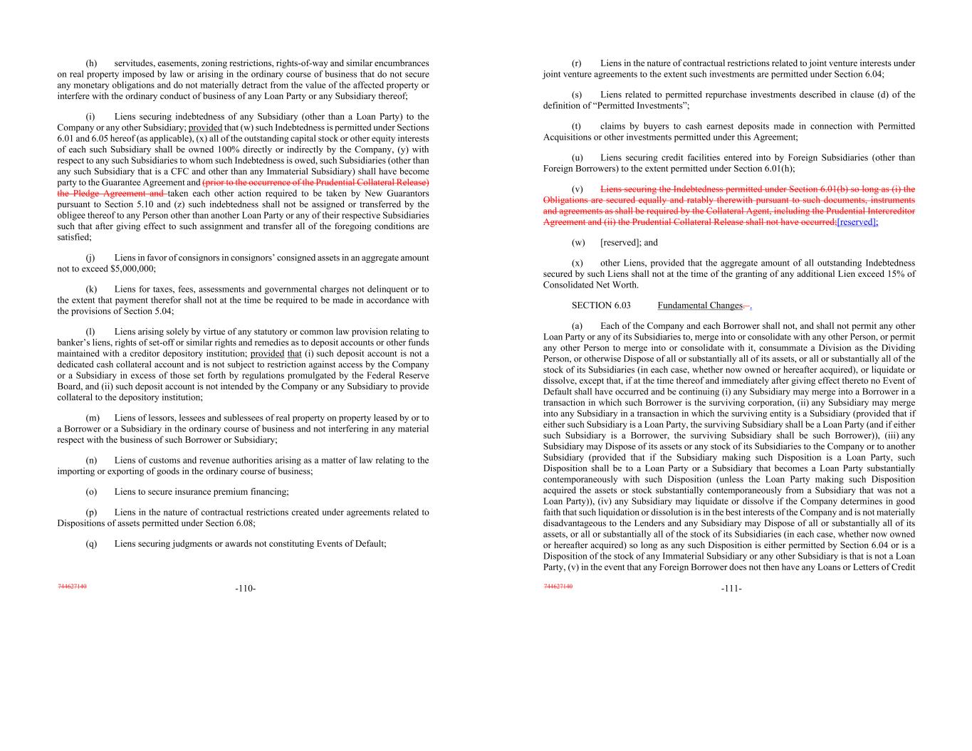 744627140 -110- (h) servitudes, easements, zoning restrictions, rights-of-way and similar encumbrances on real property imposed by law or arising in the ordinary course of business that do not secure any monetary obligations and do not materially detract from the value of the affected property or interfere with the ordinary conduct of business of any Loan Party or any Subsidiary thereof; (i) Liens securing indebtedness of any Subsidiary (other than a Loan Party) to the Company or any other Subsidiary; provided that (w) such Indebtedness is permitted under Sections 6.01 and 6.05 hereof (as applicable), (x) all of the outstanding capital stock or other equity interests of each such Subsidiary shall be owned 100% directly or indirectly by the Company, (y) with respect to any such Subsidiaries to whom such Indebtedness is owed, such Subsidiaries (other than any such Subsidiary that is a CFC and other than any Immaterial Subsidiary) shall have become party to the Guarantee Agreement and (prior to the occurrence of the Prudential Collateral Release) the Pledge Agreement and taken each other action required to be taken by New Guarantors pursuant to Section 5.10 and (z) such indebtedness shall not be assigned or transferred by the obligee thereof to any Person other than another Loan Party or any of their respective Subsidiaries such that after giving effect to such assignment and transfer all of the foregoing conditions are satisfied; (j) Liens in favor of consignors in consignors’ consigned assets in an aggregate amount not to exceed $5,000,000; (k) Liens for taxes, fees, assessments and governmental charges not delinquent or to the extent that payment therefor shall not at the time be required to be made in accordance with the provisions of Section 5.04; (l) Liens arising solely by virtue of any statutory or common law provision relating to banker’s liens, rights of set-off or similar rights and remedies as to deposit accounts or other funds maintained with a creditor depository institution; provided that (i) such deposit account is not a dedicated cash collateral account and is not subject to restriction against access by the Company or a Subsidiary in excess of those set forth by regulations promulgated by the Federal Reserve Board, and (ii) such deposit account is not intended by the Company or any Subsidiary to provide collateral to the depository institution; (m) Liens of lessors, lessees and sublessees of real property on property leased by or to a Borrower or a Subsidiary in the ordinary course of business and not interfering in any material respect with the business of such Borrower or Subsidiary; (n) Liens of customs and revenue authorities arising as a matter of law relating to the importing or exporting of goods in the ordinary course of business; (o) Liens to secure insurance premium financing; (p) Liens in the nature of contractual restrictions created under agreements related to Dispositions of assets permitted under Section 6.08; (q) Liens securing judgments or awards not constituting Events of Default; 744627140 -111- (r) Liens in the nature of contractual restrictions related to joint venture interests under joint venture agreements to the extent such investments are permitted under Section 6.04; (s) Liens related to permitted repurchase investments described in clause (d) of the definition of “Permitted Investments”; (t) claims by buyers to cash earnest deposits made in connection with Permitted Acquisitions or other investments permitted under this Agreement; (u) Liens securing credit facilities entered into by Foreign Subsidiaries (other than Foreign Borrowers) to the extent permitted under Section 6.01(h); (v) Liens securing the Indebtedness permitted under Section 6.01(b) so long as (i) the Obligations are secured equally and ratably therewith pursuant to such documents, instruments and agreements as shall be required by the Collateral Agent, including the Prudential Intercreditor Agreement and (ii) the Prudential Collateral Release shall not have occurred;[reserved]; (w) [reserved]; and (x) other Liens, provided that the aggregate amount of all outstanding Indebtedness secured by such Liens shall not at the time of the granting of any additional Lien exceed 15% of Consolidated Net Worth. SECTION 6.03 Fundamental Changes. . (a) Each of the Company and each Borrower shall not, and shall not permit any other Loan Party or any of its Subsidiaries to, merge into or consolidate with any other Person, or permit any other Person to merge into or consolidate with it, consummate a Division as the Dividing Person, or otherwise Dispose of all or substantially all of its assets, or all or substantially all of the stock of its Subsidiaries (in each case, whether now owned or hereafter acquired), or liquidate or dissolve, except that, if at the time thereof and immediately after giving effect thereto no Event of Default shall have occurred and be continuing (i) any Subsidiary may merge into a Borrower in a transaction in which such Borrower is the surviving corporation, (ii) any Subsidiary may merge into any Subsidiary in a transaction in which the surviving entity is a Subsidiary (provided that if either such Subsidiary is a Loan Party, the surviving Subsidiary shall be a Loan Party (and if either such Subsidiary is a Borrower, the surviving Subsidiary shall be such Borrower)), (iii) any Subsidiary may Dispose of its assets or any stock of its Subsidiaries to the Company or to another Subsidiary (provided that if the Subsidiary making such Disposition is a Loan Party, such Disposition shall be to a Loan Party or a Subsidiary that becomes a Loan Party substantially contemporaneously with such Disposition (unless the Loan Party making such Disposition acquired the assets or stock substantially contemporaneously from a Subsidiary that was not a Loan Party)), (iv) any Subsidiary may liquidate or dissolve if the Company determines in good faith that such liquidation or dissolution