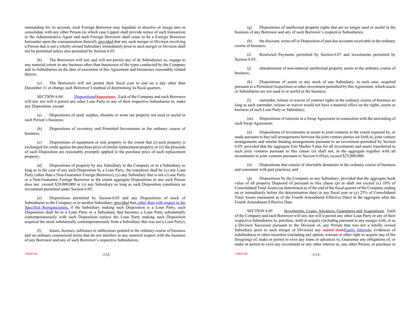 744627140 -112- outstanding for its account, such Foreign Borrower may liquidate or dissolve or merge into or consolidate with any other Person (in which case Lippert shall provide notice of such transaction to the Administrative Agent and such Foreign Borrower shall cease to be a Foreign Borrower hereunder upon the consummation thereof); provided that any such merger or Division involving a Person that is not a wholly owned Subsidiary immediately prior to such merger or Division shall not be permitted unless also permitted by Section 6.05. (b) The Borrowers will not, and will not permit any of its Subsidiaries to, engage to any material extent in any business other than businesses of the types conducted by the Company and its Subsidiaries on the date of execution of this Agreement and businesses reasonably related thereto. (c) The Borrowers will not permit their fiscal year to end on a day other than December 31 or change such Borrower’s method of determining its fiscal quarters. SECTION 6.04 DispositionsDispositions. Each of the Company and each Borrower will not, nor will it permit any other Loan Party or any of their respective Subsidiaries to, make any Disposition, except: (a) Dispositions of used, surplus, obsolete or worn out property not used or useful in such Person’s business; (b) Dispositions of inventory and Permitted Investments in the ordinary course of business; (c) Dispositions of equipment or real property to the extent that (i) such property is exchanged for credit against the purchase price of similar replacement property or (ii) the proceeds of such Disposition are reasonably promptly applied to the purchase price of such replacement property; (d) Dispositions of property by any Subsidiary to the Company or to a Subsidiary so long as in the case of any such Disposition by a Loan Party, the transferee shall be (x) any Loan Party (other than a Non-Guarantor Foreign Borrower), (y) any Subsidiary that is not a Loan Party or a Non-Guarantor Foreign Borrower to the extent aggregate Dispositions to any such Person does not exceed $20,000,000 or (z) any Subsidiary so long as such Disposition constitutes an investment permitted under Section 6.05; (e) Dispositions permitted by Section 6.03 and any Dispositions of stock of Subsidiaries to the Company or to another Subsidiary, provided that, other than with respect to the Specified Reorganization, if the Subsidiary making such Disposition is a Loan Party, such Disposition shall be to a Loan Party or a Subsidiary that becomes a Loan Party substantially contemporaneously with such Disposition (unless the Loan Party making such Disposition acquired the stock substantially contemporaneously from a Subsidiary that was not a Loan Party); (f) leases, licenses, subleases or sublicenses granted in the ordinary course of business and on ordinary commercial terms that do not interfere in any material respect with the business of any Borrower and any of such Borrower’s respective Subsidiaries; 744627140 -113- (g) Dispositions of intellectual property rights that are no longer used or useful in the business of any Borrower and any of such Borrower’s respective Subsidiaries; (h) the discount, write-off or Disposition of past due accounts receivable in the ordinary course of business; (i) Restricted Payments permitted by Section 6.07 and investments permitted by Section 6.05; (j) abandonment of non-material intellectual property assets in the ordinary course of business; (k) Dispositions of assets or any stock of any Subsidiary, in each case, acquired pursuant to a Permitted Acquisition or other investment permitted by this Agreement, which assets or Subsidiaries are not used in or useful in the business; (l) surrender, release or waiver of contract rights in the ordinary course of business so long as such surrender, release or waiver would not have a material effect on the rights, assets or business of such Loan Party or Subsidiary; (m) Dispositions of interests in a Swap Agreement in connection with the unwinding of such Swap Agreement; (n) Dispositions of investments or assets to joint ventures to the extent required by, or made pursuant to buy/sell arrangements between the joint venture parties set forth in, joint venture arrangements and similar binding arrangements pursuant to an investment permitted by Section 6.05; provided that the aggregate Fair Market Value for all investments and assets transferred to such joint ventures pursuant to this clause (n) shall not, in the aggregate together with all investments in joint ventures pursuant to Section 6.05(p), exceed $25,000,000; (o) Dispositions that consist of charitable donations in the ordinary course of business and consistent with past practices; and (p) Dispositions by the Company or any Subsidiary; provided that the aggregate book value of all property Disposed of pursuant to this clause (p) in shall not exceed (x) 10% of Consolidated Total Assets (as determined as of the end of the fiscal quarter of the Company ending on or immediately before the determination date) in any fiscal year or (y) 25% of Consolidated Total Assets (measured as of the Fourth Amendment Effective Date) in the aggregate after the Fourth Amendment Effective Date. SECTION 6.05 Investments, Loans, Advances, Guarantees and Acquisitions. Each of the Company and each Borrower will not, nor will it permit any other Loan Party or any of their respective Subsidiaries to, purchase, hold or acquire (including pursuant to any merger with, or as a Division Successor pursuant to the Division of, any Person that was not a wholly owned Subsidiary prior to such merger or Division) any capital stockEquity Interests, evidences of indebtedness or other securities (including any option, warrant or other right to acquire any of the foregoing) of, make or permit to exist any loans or advances to, Guarantee any obligations of, or make or permit to exist any investment or any other interest in, any other Person, or purchase o