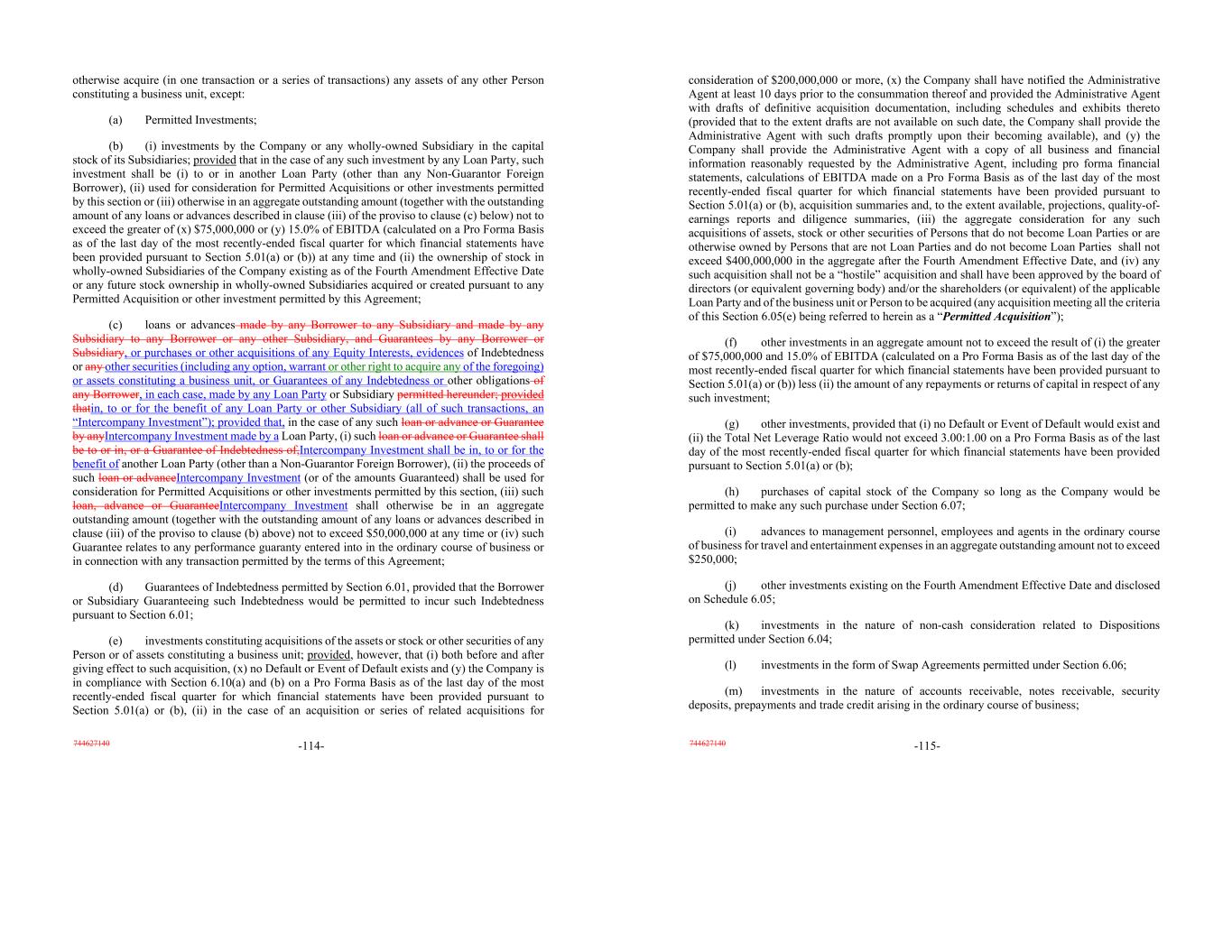744627140 -114- otherwise acquire (in one transaction or a series of transactions) any assets of any other Person constituting a business unit, except: (a) Permitted Investments; (b) (i) investments by the Company or any wholly-owned Subsidiary in the capital stock of its Subsidiaries; provided that in the case of any such investment by any Loan Party, such investment shall be (i) to or in another Loan Party (other than any Non-Guarantor Foreign Borrower), (ii) used for consideration for Permitted Acquisitions or other investments permitted by this section or (iii) otherwise in an aggregate outstanding amount (together with the outstanding amount of any loans or advances described in clause (iii) of the proviso to clause (c) below) not to exceed the greater of (x) $75,000,000 or (y) 15.0% of EBITDA (calculated on a Pro Forma Basis as of the last day of the most recently-ended fiscal quarter for which financial statements have been provided pursuant to Section 5.01(a) or (b)) at any time and (ii) the ownership of stock in wholly-owned Subsidiaries of the Company existing as of the Fourth Amendment Effective Date or any future stock ownership in wholly-owned Subsidiaries acquired or created pursuant to any Permitted Acquisition or other investment permitted by this Agreement; (c) loans or advances made by any Borrower to any Subsidiary and made by any Subsidiary to any Borrower or any other Subsidiary, and Guarantees by any Borrower or Subsidiary, or purchases or other acquisitions of any Equity Interests, evidences of Indebtedness or any other securities (including any option, warrant or other right to acquire any of the foregoing) or assets constituting a business unit, or Guarantees of any Indebtedness or other obligations of any Borrower, in each case, made by any Loan Party or Subsidiary permitted hereunder; provided thatin, to or for the benefit of any Loan Party or other Subsidiary (all of such transactions, an “Intercompany Investment”); provided that, in the case of any such loan or advance or Guarantee by anyIntercompany Investment made by a Loan Party, (i) such loan or advance or Guarantee shall be to or in, or a Guarantee of Indebtedness of,Intercompany Investment shall be in, to or for the benefit of another Loan Party (other than a Non-Guarantor Foreign Borrower), (ii) the proceeds of such loan or advanceIntercompany Investment (or of the amounts Guaranteed) shall be used for consideration for Permitted Acquisitions or other investments permitted by this section, (iii) such loan, advance or GuaranteeIntercompany Investment shall otherwise be in an aggregate outstanding amount (together with the outstanding amount of any loans or advances described in clause (iii) of the proviso to clause (b) above) not to exceed $50,000,000 at any time or (iv) such Guarantee relates to any performance guaranty entered into in the ordinary course of business or in connection with any transaction permitted by the terms of this Agreement; (d) Guarantees of Indebtedness permitted by Section 6.01, provided that the Borrower or Subsidiary Guaranteeing such Indebtedness would be permitted to incur such Indebtedness pursuant to Section 6.01; (e) investments constituting acquisitions of the assets or stock or other securities of any Person or of assets constituting a business unit; provided, however, that (i) both before and after giving effect to such acquisition, (x) no Default or Event of Default exists and (y) the Company is in compliance with Section 6.10(a) and (b) on a Pro Forma Basis as of the last day of the most recently-ended fiscal quarter for which financial statements have been provided pursuant to Section 5.01(a) or (b), (ii) in the case of an acquisition or series of related acquisitions for 744627140 -115- consideration of $200,000,000 or more, (x) the Company shall have notified the Administrative Agent at least 10 days prior to the consummation thereof and provided the Administrative Agent with drafts of definitive acquisition documentation, including schedules and exhibits thereto (provided that to the extent drafts are not available on such date, the Company shall provide the Administrative Agent with such drafts promptly upon their becoming available), and (y) the Company shall provide the Administrative Agent with a copy of all business and financial information reasonably requested by the Administrative Agent, including pro forma financial statements, calculations of EBITDA made on a Pro Forma Basis as of the last day of the most recently-ended fiscal quarter for which financial statements have been provided pursuant to Section 5.01(a) or (b), acquisition summaries and, to the extent available, projections, quality-of- earnings reports and diligence summaries, (iii) the aggregate consideration for any such acquisitions of assets, stock or other securities of Persons that do not become Loan Parties or are otherwise owned by Persons that are not Loan Parties and do not become Loan Parties shall not exceed $400,000,000 in the aggregate after the Fourth Amendment Effective Date, and (iv) any such acquisition shall not be a “hostile” acquisition and shall have been approved by the board of directors (or equivalent governing body) and/or the shareholders (or equivalent) of the applicable Loan Party and of the business unit or Person to be acquired (any acquisition meeting all the criteria of this Section 6.05(e) being referred to herein as a “Permitted Acquisition”); (f) other investments in an aggregate amount not to exceed the result of (i) the greater of $75,000,000 and 15.0% of EBITDA (calculated on a Pro Forma Basis as of the last day of the most recently-ended fiscal quarter for which financial statements have been provided pursuant to Section 5.01(a) or (b)) less (ii) the amount of any repayments or returns of capital in respect of any such investment; (g) other investments, provided that (i) no Default or Event of Default would exist and (ii) the Total Net Leverag