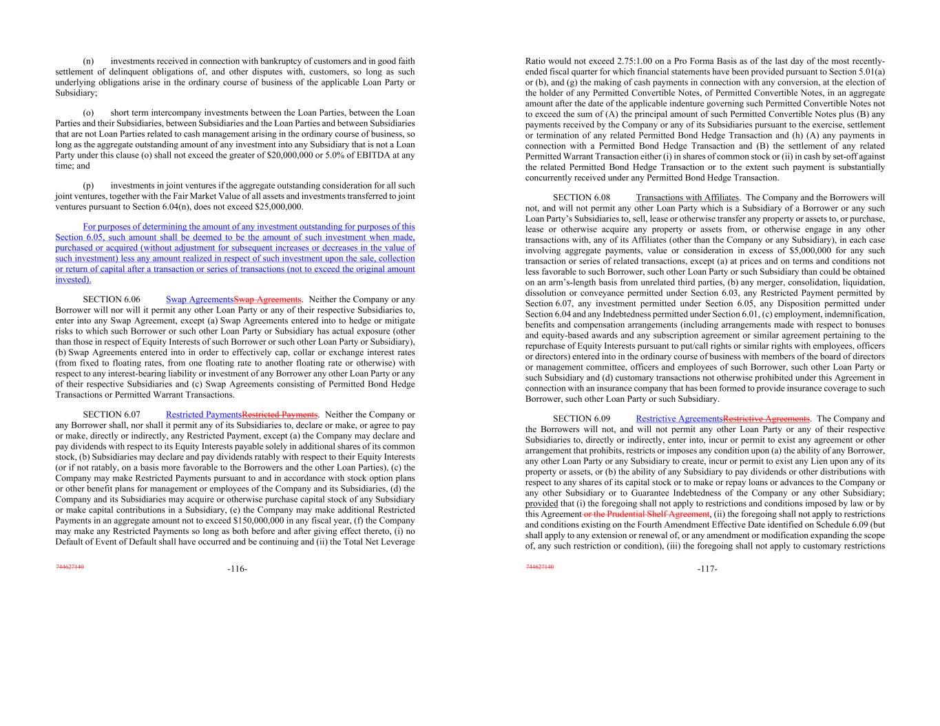 744627140 -116- (n) investments received in connection with bankruptcy of customers and in good faith settlement of delinquent obligations of, and other disputes with, customers, so long as such underlying obligations arise in the ordinary course of business of the applicable Loan Party or Subsidiary; (o) short term intercompany investments between the Loan Parties, between the Loan Parties and their Subsidiaries, between Subsidiaries and the Loan Parties and between Subsidiaries that are not Loan Parties related to cash management arising in the ordinary course of business, so long as the aggregate outstanding amount of any investment into any Subsidiary that is not a Loan Party under this clause (o) shall not exceed the greater of $20,000,000 or 5.0% of EBITDA at any time; and (p) investments in joint ventures if the aggregate outstanding consideration for all such joint ventures, together with the Fair Market Value of all assets and investments transferred to joint ventures pursuant to Section 6.04(n), does not exceed $25,000,000. For purposes of determining the amount of any investment outstanding for purposes of this Section 6.05, such amount shall be deemed to be the amount of such investment when made, purchased or acquired (without adjustment for subsequent increases or decreases in the value of such investment) less any amount realized in respect of such investment upon the sale, collection or return of capital after a transaction or series of transactions (not to exceed the original amount invested). SECTION 6.06 Swap AgreementsSwap Agreements. Neither the Company or any Borrower will nor will it permit any other Loan Party or any of their respective Subsidiaries to, enter into any Swap Agreement, except (a) Swap Agreements entered into to hedge or mitigate risks to which such Borrower or such other Loan Party or Subsidiary has actual exposure (other than those in respect of Equity Interests of such Borrower or such other Loan Party or Subsidiary), (b) Swap Agreements entered into in order to effectively cap, collar or exchange interest rates (from fixed to floating rates, from one floating rate to another floating rate or otherwise) with respect to any interest-bearing liability or investment of any Borrower any other Loan Party or any of their respective Subsidiaries and (c) Swap Agreements consisting of Permitted Bond Hedge Transactions or Permitted Warrant Transactions. SECTION 6.07 Restricted PaymentsRestricted Payments. Neither the Company or any Borrower shall, nor shall it permit any of its Subsidiaries to, declare or make, or agree to pay or make, directly or indirectly, any Restricted Payment, except (a) the Company may declare and pay dividends with respect to its Equity Interests payable solely in additional shares of its common stock, (b) Subsidiaries may declare and pay dividends ratably with respect to their Equity Interests (or if not ratably, on a basis more favorable to the Borrowers and the other Loan Parties), (c) the Company may make Restricted Payments pursuant to and in accordance with stock option plans or other benefit plans for management or employees of the Company and its Subsidiaries, (d) the Company and its Subsidiaries may acquire or otherwise purchase capital stock of any Subsidiary or make capital contributions in a Subsidiary, (e) the Company may make additional Restricted Payments in an aggregate amount not to exceed $150,000,000 in any fiscal year, (f) the Company may make any Restricted Payments so long as both before and after giving effect thereto, (i) no Default of Event of Default shall have occurred and be continuing and (ii) the Total Net Leverage 744627140 -117- Ratio would not exceed 2.75:1.00 on a Pro Forma Basis as of the last day of the most recently- ended fiscal quarter for which financial statements have been provided pursuant to Section 5.01(a) or (b), and (g) the making of cash payments in connection with any conversion, at the election of the holder of any Permitted Convertible Notes, of Permitted Convertible Notes, in an aggregate amount after the date of the applicable indenture governing such Permitted Convertible Notes not to exceed the sum of (A) the principal amount of such Permitted Convertible Notes plus (B) any payments received by the Company or any of its Subsidiaries pursuant to the exercise, settlement or termination of any related Permitted Bond Hedge Transaction and (h) (A) any payments in connection with a Permitted Bond Hedge Transaction and (B) the settlement of any related Permitted Warrant Transaction either (i) in shares of common stock or (ii) in cash by set-off against the related Permitted Bond Hedge Transaction or to the extent such payment is substantially concurrently received under any Permitted Bond Hedge Transaction. SECTION 6.08 Transactions with Affiliates. The Company and the Borrowers will not, and will not permit any other Loan Party which is a Subsidiary of a Borrower or any such Loan Party’s Subsidiaries to, sell, lease or otherwise transfer any property or assets to, or purchase, lease or otherwise acquire any property or assets from, or otherwise engage in any other transactions with, any of its Affiliates (other than the Company or any Subsidiary), in each case involving aggregate payments, value or consideration in excess of $5,000,000 for any such transaction or series of related transactions, except (a) at prices and on terms and conditions not less favorable to such Borrower, such other Loan Party or such Subsidiary than could be obtained on an arm’s-length basis from unrelated third parties, (b) any merger, consolidation, liquidation, dissolution or conveyance permitted under Section 6.03, any Restricted Payment permitted by Section 6.07, any investment permitted under Section 6.05, any Disposition permitted under Section 6.04 and any Indebtedness permitted under Section 6.01, (c) employment, indemnification, benefits and compensation arrangements (including arrangements made 