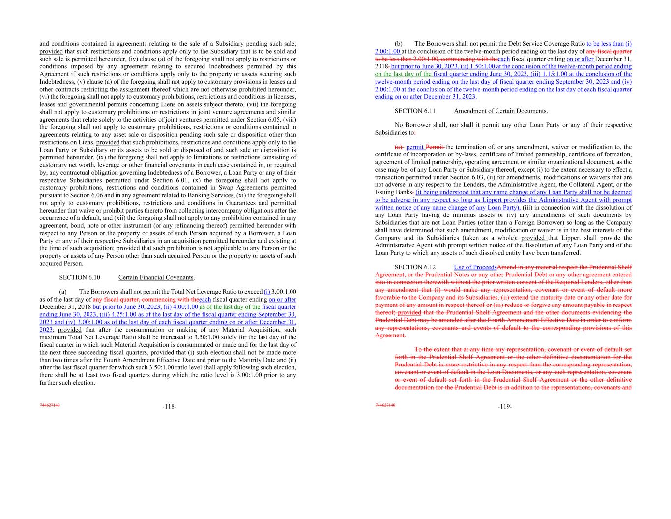 744627140 -118- and conditions contained in agreements relating to the sale of a Subsidiary pending such sale; provided that such restrictions and conditions apply only to the Subsidiary that is to be sold and such sale is permitted hereunder, (iv) clause (a) of the foregoing shall not apply to restrictions or conditions imposed by any agreement relating to secured Indebtedness permitted by this Agreement if such restrictions or conditions apply only to the property or assets securing such Indebtedness, (v) clause (a) of the foregoing shall not apply to customary provisions in leases and other contracts restricting the assignment thereof which are not otherwise prohibited hereunder, (vi) the foregoing shall not apply to customary prohibitions, restrictions and conditions in licenses, leases and governmental permits concerning Liens on assets subject thereto, (vii) the foregoing shall not apply to customary prohibitions or restrictions in joint venture agreements and similar agreements that relate solely to the activities of joint ventures permitted under Section 6.05, (viii) the foregoing shall not apply to customary prohibitions, restrictions or conditions contained in agreements relating to any asset sale or disposition pending such sale or disposition other than restrictions on Liens, provided that such prohibitions, restrictions and conditions apply only to the Loan Party or Subsidiary or its assets to be sold or disposed of and such sale or disposition is permitted hereunder, (ix) the foregoing shall not apply to limitations or restrictions consisting of customary net worth, leverage or other financial covenants in each case contained in, or required by, any contractual obligation governing Indebtedness of a Borrower, a Loan Party or any of their respective Subsidiaries permitted under Section 6.01, (x) the foregoing shall not apply to customary prohibitions, restrictions and conditions contained in Swap Agreements permitted pursuant to Section 6.06 and in any agreement related to Banking Services, (xi) the foregoing shall not apply to customary prohibitions, restrictions and conditions in Guarantees and permitted hereunder that waive or prohibit parties thereto from collecting intercompany obligations after the occurrence of a default, and (xii) the foregoing shall not apply to any prohibition contained in any agreement, bond, note or other instrument (or any refinancing thereof) permitted hereunder with respect to any Person or the property or assets of such Person acquired by a Borrower, a Loan Party or any of their respective Subsidiaries in an acquisition permitted hereunder and existing at the time of such acquisition; provided that such prohibition is not applicable to any Person or the property or assets of any Person other than such acquired Person or the property or assets of such acquired Person. SECTION 6.10 Certain Financial Covenants. (a) The Borrowers shall not permit the Total Net Leverage Ratio to exceed (i) 3.00:1.00 as of the last day of any fiscal quarter, commencing with theeach fiscal quarter ending on or after December 31, 2018 but prior to June 30, 2023, (ii) 4.00:1.00 as of the last day of the fiscal quarter ending June 30, 2023, (iii) 4.25:1.00 as of the last day of the fiscal quarter ending September 30, 2023 and (iv) 3.00:1.00 as of the last day of each fiscal quarter ending on or after December 31, 2023; provided that after the consummation or making of any Material Acquisition, such maximum Total Net Leverage Ratio shall be increased to 3.50:1.00 solely for the last day of the fiscal quarter in which such Material Acquisition is consummated or made and for the last day of the next three succeeding fiscal quarters, provided that (i) such election shall not be made more than two times after the Fourth Amendment Effective Date and prior to the Maturity Date and (ii) after the last fiscal quarter for which such 3.50:1.00 ratio level shall apply following such election, there shall be at least two fiscal quarters during which the ratio level is 3.00:1.00 prior to any further such election. 744627140 -119- (b) The Borrowers shall not permit the Debt Service Coverage Ratio to be less than (i) 2.00:1.00 at the conclusion of the twelve-month period ending on the last day of any fiscal quarter to be less than 2.00:1.00, commencing with theeach fiscal quarter ending on or after December 31, 2018. but prior to June 30, 2023, (ii) 1.50:1.00 at the conclusion of the twelve-month period ending on the last day of the fiscal quarter ending June 30, 2023, (iii) 1.15:1.00 at the conclusion of the twelve-month period ending on the last day of fiscal quarter ending September 30, 2023 and (iv) 2.00:1.00 at the conclusion of the twelve-month period ending on the last day of each fiscal quarter ending on or after December 31, 2023. SECTION 6.11 Amendment of Certain Documents. No Borrower shall, nor shall it permit any other Loan Party or any of their respective Subsidiaries to: (a) permit Permit the termination of, or any amendment, waiver or modification to, the certificate of incorporation or by-laws, certificate of limited partnership, certificate of formation, agreement of limited partnership, operating agreement or similar organizational document, as the case may be, of any Loan Party or Subsidiary thereof, except (i) to the extent necessary to effect a transaction permitted under Section 6.03, (ii) for amendments, modifications or waivers that are not adverse in any respect to the Lenders, the Administrative Agent, the Collateral Agent, or the Issuing Banks, (it being understood that any name change of any Loan Party shall not be deemed to be adverse in any respect so long as Lippert provides the Administrative Agent with prompt written notice of any name change of any Loan Party), (iii) in connection with the dissolution of any Loan Party having de minimus assets or (iv) any amendments of such documents by Subsidiaries that are not Loan Parties (other than a Foreign Bor