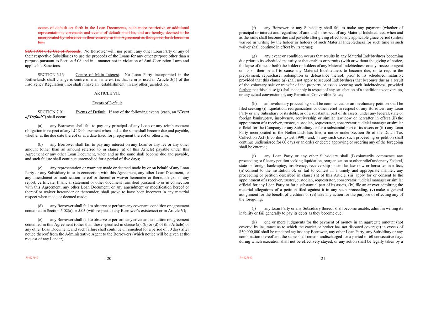 744627140 -120- events of default set forth in the Loan Documents, such more restrictive or additional representations, covenants and events of default shall be, and are hereby, deemed to be incorporated by reference in their entirety in this Agreement as though set forth herein in full. SECTION 6.12 Use of Proceeds. No Borrower will, nor permit any other Loan Party or any of their respective Subsidiaries to use the proceeds of the Loans for any other purpose other than a purpose pursuant to Section 5.08 and in a manner not in violation of Anti-Corruption Laws and applicable Sanctions. SECTION 6.13 Centre of Main Interest. No Loan Party incorporated in the Netherlands shall change is centre of main interest (as that term is used in Article 3(1) of the Insolvency Regulation), nor shall it have an “establishment” in any other jurisdiction. ARTICLE VII. Events of Default SECTION 7.01 Events of Default. If any of the following events (each, an “Event of Default”) shall occur: (a) any Borrower shall fail to pay any principal of any Loan or any reimbursement obligation in respect of any LC Disbursement when and as the same shall become due and payable, whether at the due date thereof or at a date fixed for prepayment thereof or otherwise; (b) any Borrower shall fail to pay any interest on any Loan or any fee or any other amount (other than an amount referred to in clause (a) of this Article) payable under this Agreement or any other Loan Document, when and as the same shall become due and payable, and such failure shall continue unremedied for a period of five days; (c) any representation or warranty made or deemed made by or on behalf of any Loan Party or any Subsidiary in or in connection with this Agreement, any other Loan Document, or any amendment or modification hereof or thereof or waiver hereunder or thereunder, or in any report, certificate, financial statement or other document furnished pursuant to or in connection with this Agreement, any other Loan Document, or any amendment or modification hereof or thereof or waiver hereunder or thereunder, shall prove to have been incorrect in any material respect when made or deemed made; (d) any Borrower shall fail to observe or perform any covenant, condition or agreement contained in Section 5.02(a) or 5.03 (with respect to any Borrower’s existence) or in Article VI; (e) any Borrower shall fail to observe or perform any covenant, condition or agreement contained in this Agreement (other than those specified in clause (a), (b) or (d) of this Article) or any other Loan Document, and such failure shall continue unremedied for a period of 30 days after notice thereof from the Administrative Agent to the Borrowers (which notice will be given at the request of any Lender); 744627140 -121- (f) any Borrower or any Subsidiary shall fail to make any payment (whether of principal or interest and regardless of amount) in respect of any Material Indebtedness, when and as the same shall become due and payable after giving effect to any applicable grace period (unless waived in writing by the holder or holders of such Material Indebtedness for such time as such waiver shall continue in effect by its terms); (g) any event or condition occurs that results in any Material Indebtedness becoming due prior to its scheduled maturity or that enables or permits (with or without the giving of notice, the lapse of time or both) the holder or holders of any Material Indebtedness or any trustee or agent on its or their behalf to cause any Material Indebtedness to become due, or to require the prepayment, repurchase, redemption or defeasance thereof, prior to its scheduled maturity; provided that this clause (g) shall not apply to secured Indebtedness that becomes due as a result of the voluntary sale or transfer of the property or assets securing such Indebtedness; provided further that this clause (g) shall not apply in respect of any satisfaction of a condition to conversion, or any actual conversion of, any Permitted Convertible Notes; (h) an involuntary proceeding shall be commenced or an involuntary petition shall be filed seeking (i) liquidation, reorganization or other relief in respect of any Borrower, any Loan Party or any Subsidiary or its debts, or of a substantial part of its assets, under any federal, state or foreign bankruptcy, insolvency, receivership or similar law now or hereafter in effect (ii) the appointment of a receiver, trustee, custodian, sequestrator, conservator, judicial manager or similar official for the Company or any Subsidiary or for a substantial part of its assets or (iii) any Loan Party incorporated in the Netherlands has filed a notice under Section 36 of the Dutch Tax Collection Act (Invorderingswet 1990), and, in any such case, such proceeding or petition shall continue undismissed for 60 days or an order or decree approving or ordering any of the foregoing shall be entered; (i) any Loan Party or any other Subsidiary shall (i) voluntarily commence any proceeding or file any petition seeking liquidation, reorganization or other relief under any Federal, state or foreign bankruptcy, insolvency, receivership or similar law now or hereafter in effect, (ii) consent to the institution of, or fail to contest in a timely and appropriate manner, any proceeding or petition described in clause (h) of this Article, (iii) apply for or consent to the appointment of a receiver, trustee, custodian, sequestrator, conservator, judicial manager or similar official for any Loan Party or for a substantial part of its assets, (iv) file an answer admitting the material allegations of a petition filed against it in any such proceeding, (v) make a general assignment for the benefit of creditors or (vi) take any action for the purpose of effecting any of the foregoing; (j) any Loan Party or any Subsidiary thereof shall become unable, admit in writing its inability or fail generally to pay its debts as they become due; (k) one or more judgments f