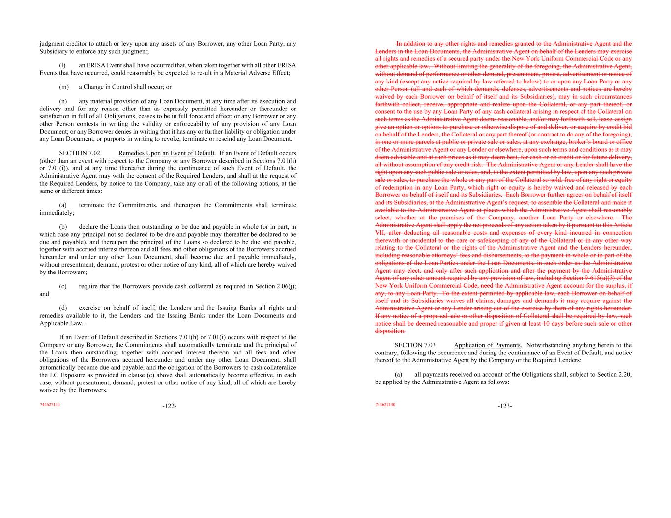 744627140 -122- judgment creditor to attach or levy upon any assets of any Borrower, any other Loan Party, any Subsidiary to enforce any such judgment; (l) an ERISA Event shall have occurred that, when taken together with all other ERISA Events that have occurred, could reasonably be expected to result in a Material Adverse Effect; (m) a Change in Control shall occur; or (n) any material provision of any Loan Document, at any time after its execution and delivery and for any reason other than as expressly permitted hereunder or thereunder or satisfaction in full of all Obligations, ceases to be in full force and effect; or any Borrower or any other Person contests in writing the validity or enforceability of any provision of any Loan Document; or any Borrower denies in writing that it has any or further liability or obligation under any Loan Document, or purports in writing to revoke, terminate or rescind any Loan Document. SECTION 7.02 Remedies Upon an Event of Default. If an Event of Default occurs (other than an event with respect to the Company or any Borrower described in Sections 7.01(h) or 7.01(i)), and at any time thereafter during the continuance of such Event of Default, the Administrative Agent may with the consent of the Required Lenders, and shall at the request of the Required Lenders, by notice to the Company, take any or all of the following actions, at the same or different times: (a) terminate the Commitments, and thereupon the Commitments shall terminate immediately; (b) declare the Loans then outstanding to be due and payable in whole (or in part, in which case any principal not so declared to be due and payable may thereafter be declared to be due and payable), and thereupon the principal of the Loans so declared to be due and payable, together with accrued interest thereon and all fees and other obligations of the Borrowers accrued hereunder and under any other Loan Document, shall become due and payable immediately, without presentment, demand, protest or other notice of any kind, all of which are hereby waived by the Borrowers; (c) require that the Borrowers provide cash collateral as required in Section 2.06(j); and (d) exercise on behalf of itself, the Lenders and the Issuing Banks all rights and remedies available to it, the Lenders and the Issuing Banks under the Loan Documents and Applicable Law. If an Event of Default described in Sections 7.01(h) or 7.01(i) occurs with respect to the Company or any Borrower, the Commitments shall automatically terminate and the principal of the Loans then outstanding, together with accrued interest thereon and all fees and other obligations of the Borrowers accrued hereunder and under any other Loan Document, shall automatically become due and payable, and the obligation of the Borrowers to cash collateralize the LC Exposure as provided in clause (c) above shall automatically become effective, in each case, without presentment, demand, protest or other notice of any kind, all of which are hereby waived by the Borrowers. 744627140 -123- In addition to any other rights and remedies granted to the Administrative Agent and the Lenders in the Loan Documents, the Administrative Agent on behalf of the Lenders may exercise all rights and remedies of a secured party under the New York Uniform Commercial Code or any other applicable law. Without limiting the generality of the foregoing, the Administrative Agent, without demand of performance or other demand, presentment, protest, advertisement or notice of any kind (except any notice required by law referred to below) to or upon any Loan Party or any other Person (all and each of which demands, defenses, advertisements and notices are hereby waived by each Borrower on behalf of itself and its Subsidiaries), may in such circumstances forthwith collect, receive, appropriate and realize upon the Collateral, or any part thereof, or consent to the use by any Loan Party of any cash collateral arising in respect of the Collateral on such terms as the Administrative Agent deems reasonable, and/or may forthwith sell, lease, assign give an option or options to purchase or otherwise dispose of and deliver, or acquire by credit bid on behalf of the Lenders, the Collateral or any part thereof (or contract to do any of the foregoing), in one or more parcels at public or private sale or sales, at any exchange, broker’s board or office of the Administrative Agent or any Lender or elsewhere, upon such terms and conditions as it may deem advisable and at such prices as it may deem best, for cash or on credit or for future delivery, all without assumption of any credit risk. The Administrative Agent or any Lender shall have the right upon any such public sale or sales, and, to the extent permitted by law, upon any such private sale or sales, to purchase the whole or any part of the Collateral so sold, free of any right or equity of redemption in any Loan Party, which right or equity is hereby waived and released by each Borrower on behalf of itself and its Subsidiaries. Each Borrower further agrees on behalf of itself and its Subsidiaries, at the Administrative Agent’s request, to assemble the Collateral and make it available to the Administrative Agent at places which the Administrative Agent shall reasonably select, whether at the premises of the Company, another Loan Party or elsewhere. The Administrative Agent shall apply the net proceeds of any action taken by it pursuant to this Article VII, after deducting all reasonable costs and expenses of every kind incurred in connection therewith or incidental to the care or safekeeping of any of the Collateral or in any other way relating to the Collateral or the rights of the Administrative Agent and the Lenders hereunder, including reasonable attorneys’ fees and disbursements, to the payment in whole or in part of the obligations of the Loan Parties under the Loan Documents, in such order as the Administrative Agent may elect, and only after such 