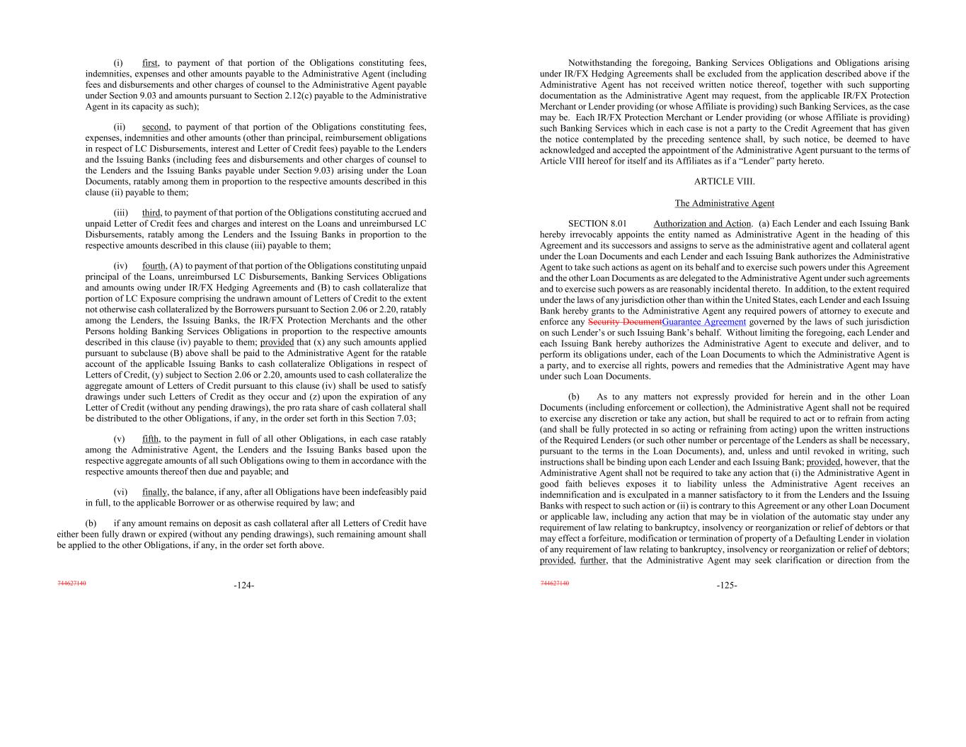 744627140 -124- (i) first, to payment of that portion of the Obligations constituting fees, indemnities, expenses and other amounts payable to the Administrative Agent (including fees and disbursements and other charges of counsel to the Administrative Agent payable under Section 9.03 and amounts pursuant to Section 2.12(c) payable to the Administrative Agent in its capacity as such); (ii) second, to payment of that portion of the Obligations constituting fees, expenses, indemnities and other amounts (other than principal, reimbursement obligations in respect of LC Disbursements, interest and Letter of Credit fees) payable to the Lenders and the Issuing Banks (including fees and disbursements and other charges of counsel to the Lenders and the Issuing Banks payable under Section 9.03) arising under the Loan Documents, ratably among them in proportion to the respective amounts described in this clause (ii) payable to them; (iii) third, to payment of that portion of the Obligations constituting accrued and unpaid Letter of Credit fees and charges and interest on the Loans and unreimbursed LC Disbursements, ratably among the Lenders and the Issuing Banks in proportion to the respective amounts described in this clause (iii) payable to them; (iv) fourth, (A) to payment of that portion of the Obligations constituting unpaid principal of the Loans, unreimbursed LC Disbursements, Banking Services Obligations and amounts owing under IR/FX Hedging Agreements and (B) to cash collateralize that portion of LC Exposure comprising the undrawn amount of Letters of Credit to the extent not otherwise cash collateralized by the Borrowers pursuant to Section 2.06 or 2.20, ratably among the Lenders, the Issuing Banks, the IR/FX Protection Merchants and the other Persons holding Banking Services Obligations in proportion to the respective amounts described in this clause (iv) payable to them; provided that (x) any such amounts applied pursuant to subclause (B) above shall be paid to the Administrative Agent for the ratable account of the applicable Issuing Banks to cash collateralize Obligations in respect of Letters of Credit, (y) subject to Section 2.06 or 2.20, amounts used to cash collateralize the aggregate amount of Letters of Credit pursuant to this clause (iv) shall be used to satisfy drawings under such Letters of Credit as they occur and (z) upon the expiration of any Letter of Credit (without any pending drawings), the pro rata share of cash collateral shall be distributed to the other Obligations, if any, in the order set forth in this Section 7.03; (v) fifth, to the payment in full of all other Obligations, in each case ratably among the Administrative Agent, the Lenders and the Issuing Banks based upon the respective aggregate amounts of all such Obligations owing to them in accordance with the respective amounts thereof then due and payable; and (vi) finally, the balance, if any, after all Obligations have been indefeasibly paid in full, to the applicable Borrower or as otherwise required by law; and (b) if any amount remains on deposit as cash collateral after all Letters of Credit have either been fully drawn or expired (without any pending drawings), such remaining amount shall be applied to the other Obligations, if any, in the order set forth above. 744627140 -125- Notwithstanding the foregoing, Banking Services Obligations and Obligations arising under IR/FX Hedging Agreements shall be excluded from the application described above if the Administrative Agent has not received written notice thereof, together with such supporting documentation as the Administrative Agent may request, from the applicable IR/FX Protection Merchant or Lender providing (or whose Affiliate is providing) such Banking Services, as the case may be. Each IR/FX Protection Merchant or Lender providing (or whose Affiliate is providing) such Banking Services which in each case is not a party to the Credit Agreement that has given the notice contemplated by the preceding sentence shall, by such notice, be deemed to have acknowledged and accepted the appointment of the Administrative Agent pursuant to the terms of Article VIII hereof for itself and its Affiliates as if a “Lender” party hereto. ARTICLE VIII. The Administrative Agent SECTION 8.01 Authorization and Action. (a) Each Lender and each Issuing Bank hereby irrevocably appoints the entity named as Administrative Agent in the heading of this Agreement and its successors and assigns to serve as the administrative agent and collateral agent under the Loan Documents and each Lender and each Issuing Bank authorizes the Administrative Agent to take such actions as agent on its behalf and to exercise such powers under this Agreement and the other Loan Documents as are delegated to the Administrative Agent under such agreements and to exercise such powers as are reasonably incidental thereto. In addition, to the extent required under the laws of any jurisdiction other than within the United States, each Lender and each Issuing Bank hereby grants to the Administrative Agent any required powers of attorney to execute and enforce any Security DocumentGuarantee Agreement governed by the laws of such jurisdiction on such Lender’s or such Issuing Bank’s behalf. Without limiting the foregoing, each Lender and each Issuing Bank hereby authorizes the Administrative Agent to execute and deliver, and to perform its obligations under, each of the Loan Documents to which the Administrative Agent is a party, and to exercise all rights, powers and remedies that the Administrative Agent may have under such Loan Documents. (b) As to any matters not expressly provided for herein and in the other Loan Documents (including enforcement or collection), the Administrative Agent shall not be required to exercise any discretion or take any action, but shall be required to act or to refrain from acting (and shall be fully protected in so acting or refraining from acting) upon the written i