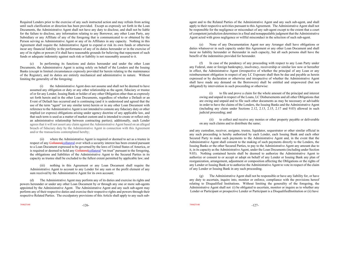 744627140 -126- Required Lenders prior to the exercise of any such instructed action and may refrain from acting until such clarification or direction has been provided. Except as expressly set forth in the Loan Documents, the Administrative Agent shall not have any duty to disclose, and shall not be liable for the failure to disclose, any information relating to any Borrower, any other Loan Party, any Subsidiary or any Affiliate of any of the foregoing that is communicated to or obtained by the Person serving as Administrative Agent or any of its Affiliates in any capacity. Nothing in this Agreement shall require the Administrative Agent to expend or risk its own funds or otherwise incur any financial liability in the performance of any of its duties hereunder or in the exercise of any of its rights or powers if it shall have reasonable grounds for believing that repayment of such funds or adequate indemnity against such risk or liability is not reasonably assured to it. (c) In performing its functions and duties hereunder and under the other Loan Documents, the Administrative Agent is acting solely on behalf of the Lenders and the Issuing Banks (except in limited circumstances expressly provided for herein relating to the maintenance of the Register), and its duties are entirely mechanical and administrative in nature. Without limiting the generality of the foregoing: (i) the Administrative Agent does not assume and shall not be deemed to have assumed any obligation or duty or any other relationship as the agent, fiduciary or trustee of or for any Lender, Issuing Bank or holder of any other Obligation other than as expressly set forth herein and in the other Loan Documents, regardless of whether a Default or an Event of Default has occurred and is continuing (and it is understood and agreed that the use of the term “agent” (or any similar term) herein or in any other Loan Document with reference to the Administrative Agent is not intended to connote any fiduciary duty or other implied (or express) obligations arising under agency doctrine of any applicable law, and that such term is used as a matter of market custom and is intended to create or reflect only an administrative relationship between contracting parties); additionally, each Lender agrees that it will not assert any claim against the Administrative Agent based on an alleged breach of fiduciary duty by the Administrative Agent in connection with this Agreement and/or the transactions contemplated hereby; (ii) where the Administrative Agent is required or deemed to act as a trustee in respect of any Collateralcollateral over which a security interest has been created pursuant to a Loan Document expressed to be governed by the laws of United States of America, or is required or deemed to hold any Collateralcollateral “on trust” pursuant to the foregoing, the obligations and liabilities of the Administrative Agent to the Secured Parties in its capacity as trustee shall be excluded to the fullest extent permitted by applicable law; and (iii) nothing in this Agreement or any Loan Document shall require the Administrative Agent to account to any Lender for any sum or the profit element of any sum received by the Administrative Agent for its own account; (d) The Administrative Agent may perform any of its duties and exercise its rights and powers hereunder or under any other Loan Document by or through any one or more sub-agents appointed by the Administrative Agent. The Administrative Agent and any such sub-agent may perform any of their respective duties and exercise their respective rights and powers through their respective Related Parties. The exculpatory provisions of this Article shall apply to any such sub- 744627140 -127- agent and to the Related Parties of the Administrative Agent and any such sub-agent, and shall apply to their respective activities pursuant to this Agreement. The Administrative Agent shall not be responsible for the negligence or misconduct of any sub-agent except to the extent that a court of competent jurisdiction determines in a final and nonappealable judgment that the Administrative Agent acted with gross negligence or willful misconduct in the selection of such sub-agent. (e) None of any Documentation Agent nor any Arranger shall have obligations or duties whatsoever in such capacity under this Agreement or any other Loan Document and shall incur no liability hereunder or thereunder in such capacity, but all such persons shall have the benefit of the indemnities provided for hereunder. (f) In case of the pendency of any proceeding with respect to any Loan Party under any Federal, state or foreign bankruptcy, insolvency, receivership or similar law now or hereafter in effect, the Administrative Agent (irrespective of whether the principal of any Loan or any reimbursement obligation in respect of any LC Exposure shall then be due and payable as herein expressed or by declaration or otherwise and irrespective of whether the Administrative Agent shall have made any demand on the Borrowers) shall be entitled and empowered (but not obligated) by intervention in such proceeding or otherwise: (i) to file and prove a claim for the whole amount of the principal and interest owing and unpaid in respect of the Loans, LC Disbursements and all other Obligations that are owing and unpaid and to file such other documents as may be necessary or advisable in order to have the claims of the Lenders, the Issuing Banks and the Administrative Agent (including any claim under Sections 2.12, 2.13, 2.15, 2.17 and 9.03) allowed in such judicial proceeding; and (ii) to collect and receive any monies or other property payable or deliverable on any such claims and to distribute the same; and any custodian, receiver, assignee, trustee, liquidator, sequestrator or other similar official in any such proceeding is hereby authorized by each Lender, each Issuing Bank and each other Secured Party to make such payments to the 