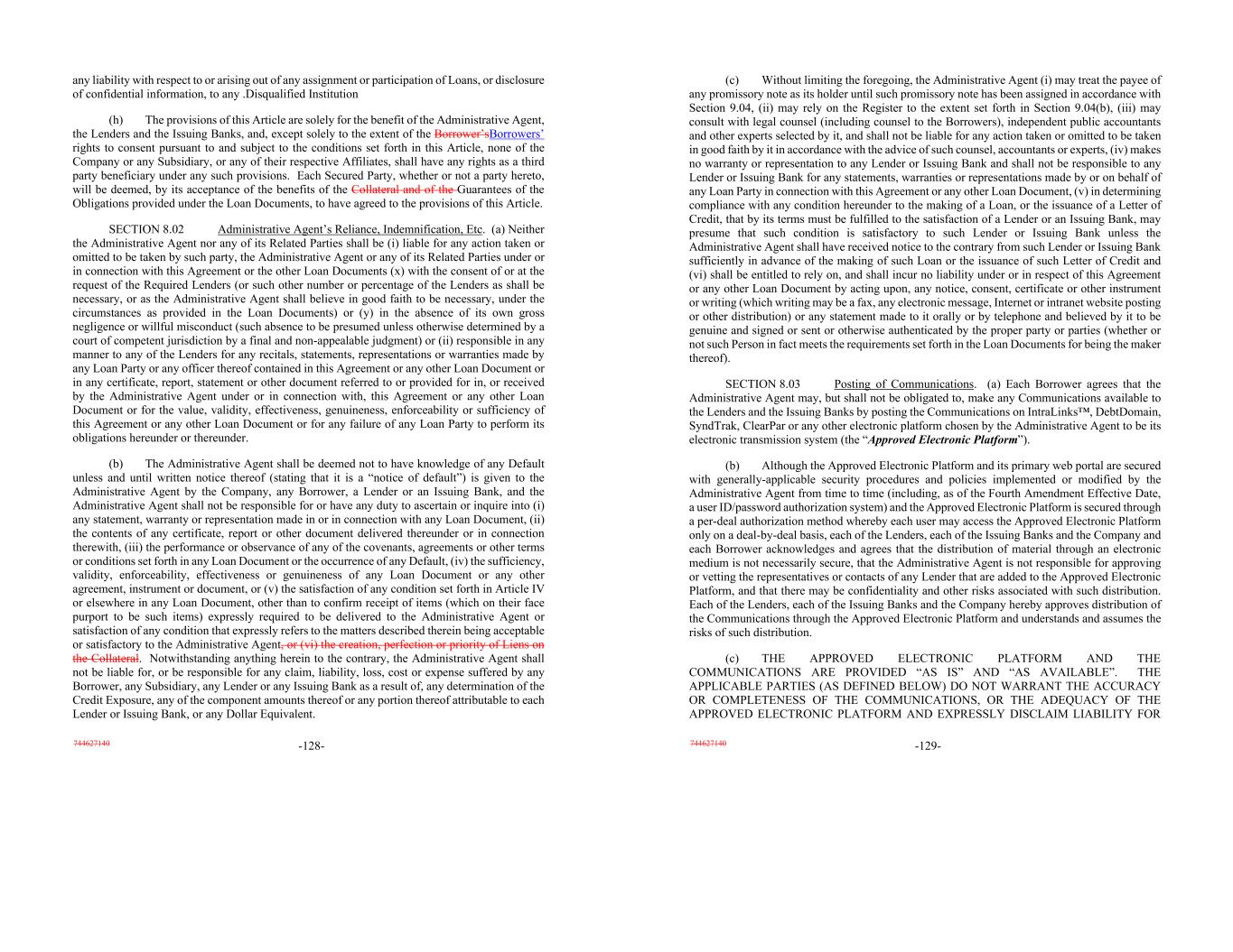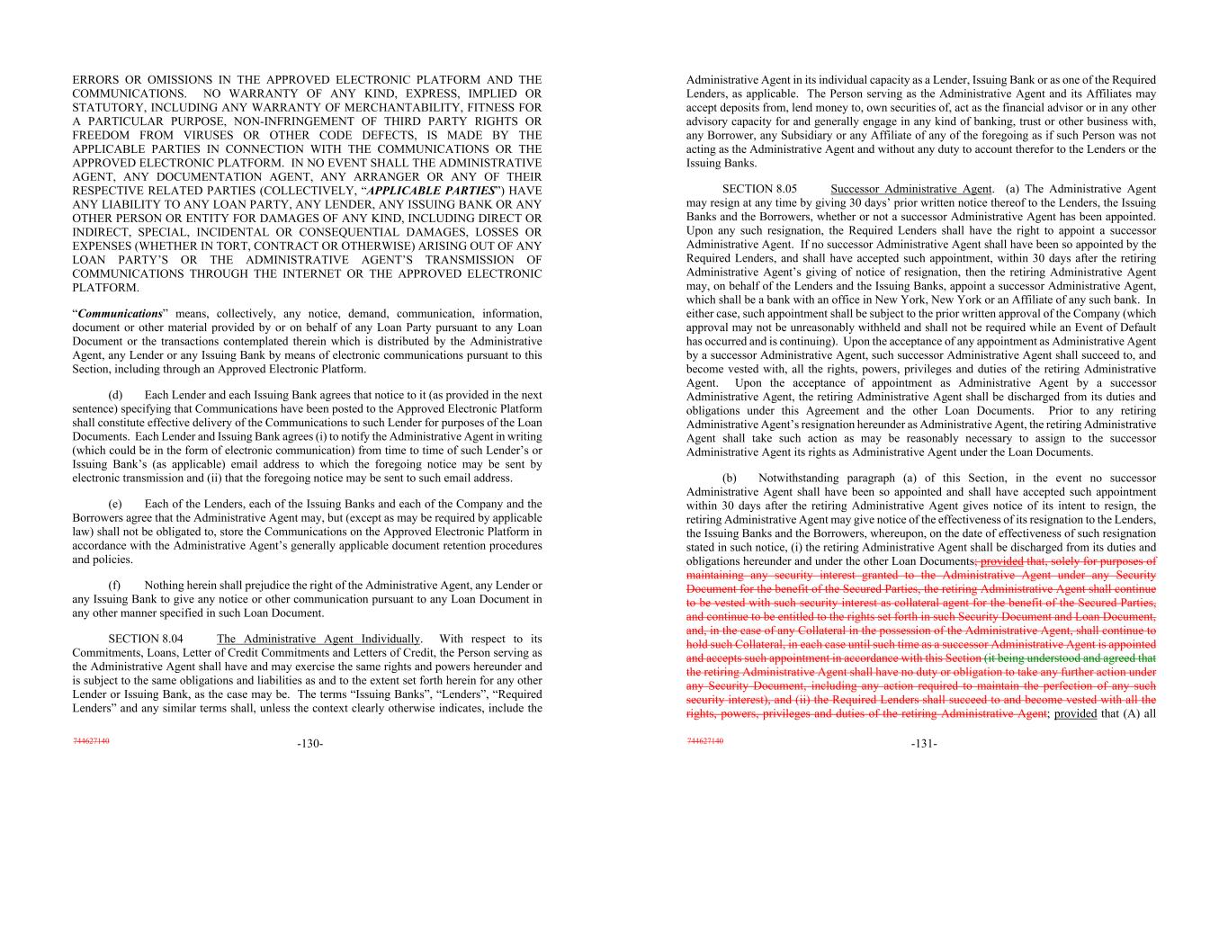 744627140 -130- ERRORS OR OMISSIONS IN THE APPROVED ELECTRONIC PLATFORM AND THE COMMUNICATIONS. NO WARRANTY OF ANY KIND, EXPRESS, IMPLIED OR STATUTORY, INCLUDING ANY WARRANTY OF MERCHANTABILITY, FITNESS FOR A PARTICULAR PURPOSE, NON-INFRINGEMENT OF THIRD PARTY RIGHTS OR FREEDOM FROM VIRUSES OR OTHER CODE DEFECTS, IS MADE BY THE APPLICABLE PARTIES IN CONNECTION WITH THE COMMUNICATIONS OR THE APPROVED ELECTRONIC PLATFORM. IN NO EVENT SHALL THE ADMINISTRATIVE AGENT, ANY DOCUMENTATION AGENT, ANY ARRANGER OR ANY OF THEIR RESPECTIVE RELATED PARTIES (COLLECTIVELY, “APPLICABLE PARTIES”) HAVE ANY LIABILITY TO ANY LOAN PARTY, ANY LENDER, ANY ISSUING BANK OR ANY OTHER PERSON OR ENTITY FOR DAMAGES OF ANY KIND, INCLUDING DIRECT OR INDIRECT, SPECIAL, INCIDENTAL OR CONSEQUENTIAL DAMAGES, LOSSES OR EXPENSES (WHETHER IN TORT, CONTRACT OR OTHERWISE) ARISING OUT OF ANY LOAN PARTY’S OR THE ADMINISTRATIVE AGENT’S TRANSMISSION OF COMMUNICATIONS THROUGH THE INTERNET OR THE APPROVED ELECTRONIC PLATFORM. “Communications” means, collectively, any notice, demand, communication, information, document or other material provided by or on behalf of any Loan Party pursuant to any Loan Document or the transactions contemplated therein which is distributed by the Administrative Agent, any Lender or any Issuing Bank by means of electronic communications pursuant to this Section, including through an Approved Electronic Platform. (d) Each Lender and each Issuing Bank agrees that notice to it (as provided in the next sentence) specifying that Communications have been posted to the Approved Electronic Platform shall constitute effective delivery of the Communications to such Lender for purposes of the Loan Documents. Each Lender and Issuing Bank agrees (i) to notify the Administrative Agent in writing (which could be in the form of electronic communication) from time to time of such Lender’s or Issuing Bank’s (as applicable) email address to which the foregoing notice may be sent by electronic transmission and (ii) that the foregoing notice may be sent to such email address. (e) Each of the Lenders, each of the Issuing Banks and each of the Company and the Borrowers agree that the Administrative Agent may, but (except as may be required by applicable law) shall not be obligated to, store the Communications on the Approved Electronic Platform in accordance with the Administrative Agent’s generally applicable document retention procedures and policies. (f) Nothing herein shall prejudice the right of the Administrative Agent, any Lender or any Issuing Bank to give any notice or other communication pursuant to any Loan Document in any other manner specified in such Loan Document. SECTION 8.04 The Administrative Agent Individually. With respect to its Commitments, Loans, Letter of Credit Commitments and Letters of Credit, the Person serving as the Administrative Agent shall have and may exercise the same rights and powers hereunder and is subject to the same obligations and liabilities as and to the extent set forth herein for any other Lender or Issuing Bank, as the case may be. The terms “Issuing Banks”, “Lenders”, “Required Lenders” and any similar terms shall, unless the context clearly otherwise indicates, include the 744627140 -131- Administrative Agent in its individual capacity as a Lender, Issuing Bank or as one of the Required Lenders, as applicable. The Person serving as the Administrative Agent and its Affiliates may accept deposits from, lend money to, own securities of, act as the financial advisor or in any other advisory capacity for and generally engage in any kind of banking, trust or other business with, any Borrower, any Subsidiary or any Affiliate of any of the foregoing as if such Person was not acting as the Administrative Agent and without any duty to account therefor to the Lenders or the Issuing Banks. SECTION 8.05 Successor Administrative Agent. (a) The Administrative Agent may resign at any time by giving 30 days’ prior written notice thereof to the Lenders, the Issuing Banks and the Borrowers, whether or not a successor Administrative Agent has been appointed. Upon any such resignation, the Required Lenders shall have the right to appoint a successor Administrative Agent. If no successor Administrative Agent shall have been so appointed by the Required Lenders, and shall have accepted such appointment, within 30 days after the retiring Administrative Agent’s giving of notice of resignation, then the retiring Administrative Agent may, on behalf of the Lenders and the Issuing Banks, appoint a successor Administrative Agent, which shall be a bank with an office in New York, New York or an Affiliate of any such bank. In either case, such appointment shall be subject to the prior written approval of the Company (which approval may not be unreasonably withheld and shall not be required while an Event of Default has occurred and is continuing). Upon the acceptance of any appointment as Administrative Agent by a successor Administrative Agent, such successor Administrative Agent shall succeed to, and become vested with, all the rights, powers, privileges and duties of the retiring Administrative Agent. Upon the acceptance of appointment as Administrative Agent by a successor Administrative Agent, the retiring Administrative Agent shall be discharged from its duties and obligations under this Agreement and the other Loan Documents. Prior to any retiring Administrative Agent’s resignation hereunder as Administrative Agent, the retiring Administrative Agent shall take such action as may be reasonably necessary to assign to the successor Administrative Agent its rights as Administrative Agent under the Loan Documents. (b) Notwithstanding paragraph (a) of this Section, in the event no successor Administrative Agent shall have been so appointed and shall have accepted such appointment within 30 days after the retiring Administrative Agent gives notice of its intent to resign, the