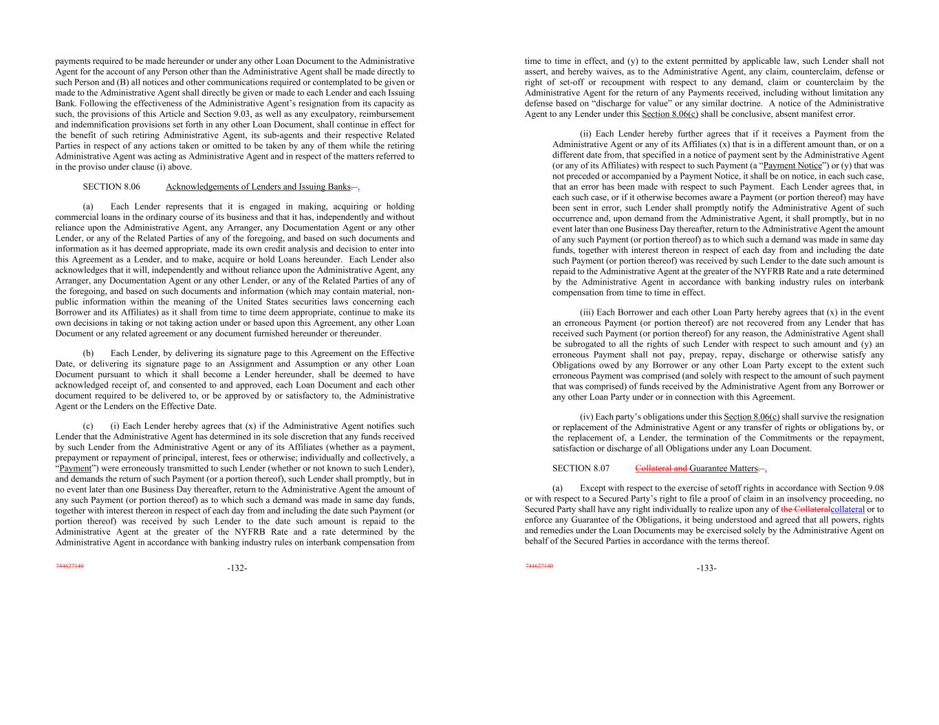 744627140 -132- payments required to be made hereunder or under any other Loan Document to the Administrative Agent for the account of any Person other than the Administrative Agent shall be made directly to such Person and (B) all notices and other communications required or contemplated to be given or made to the Administrative Agent shall directly be given or made to each Lender and each Issuing Bank. Following the effectiveness of the Administrative Agent’s resignation from its capacity as such, the provisions of this Article and Section 9.03, as well as any exculpatory, reimbursement and indemnification provisions set forth in any other Loan Document, shall continue in effect for the benefit of such retiring Administrative Agent, its sub-agents and their respective Related Parties in respect of any actions taken or omitted to be taken by any of them while the retiring Administrative Agent was acting as Administrative Agent and in respect of the matters referred to in the proviso under clause (i) above. SECTION 8.06 Acknowledgements of Lenders and Issuing Banks. . (a) Each Lender represents that it is engaged in making, acquiring or holding commercial loans in the ordinary course of its business and that it has, independently and without reliance upon the Administrative Agent, any Arranger, any Documentation Agent or any other Lender, or any of the Related Parties of any of the foregoing, and based on such documents and information as it has deemed appropriate, made its own credit analysis and decision to enter into this Agreement as a Lender, and to make, acquire or hold Loans hereunder. Each Lender also acknowledges that it will, independently and without reliance upon the Administrative Agent, any Arranger, any Documentation Agent or any other Lender, or any of the Related Parties of any of the foregoing, and based on such documents and information (which may contain material, non- public information within the meaning of the United States securities laws concerning each Borrower and its Affiliates) as it shall from time to time deem appropriate, continue to make its own decisions in taking or not taking action under or based upon this Agreement, any other Loan Document or any related agreement or any document furnished hereunder or thereunder. (b) Each Lender, by delivering its signature page to this Agreement on the Effective Date, or delivering its signature page to an Assignment and Assumption or any other Loan Document pursuant to which it shall become a Lender hereunder, shall be deemed to have acknowledged receipt of, and consented to and approved, each Loan Document and each other document required to be delivered to, or be approved by or satisfactory to, the Administrative Agent or the Lenders on the Effective Date. (c) (i) Each Lender hereby agrees that (x) if the Administrative Agent notifies such Lender that the Administrative Agent has determined in its sole discretion that any funds received by such Lender from the Administrative Agent or any of its Affiliates (whether as a payment, prepayment or repayment of principal, interest, fees or otherwise; individually and collectively, a “Payment”) were erroneously transmitted to such Lender (whether or not known to such Lender), and demands the return of such Payment (or a portion thereof), such Lender shall promptly, but in no event later than one Business Day thereafter, return to the Administrative Agent the amount of any such Payment (or portion thereof) as to which such a demand was made in same day funds, together with interest thereon in respect of each day from and including the date such Payment (or portion thereof) was received by such Lender to the date such amount is repaid to the Administrative Agent at the greater of the NYFRB Rate and a rate determined by the Administrative Agent in accordance with banking industry rules on interbank compensation from 744627140 -133- time to time in effect, and (y) to the extent permitted by applicable law, such Lender shall not assert, and hereby waives, as to the Administrative Agent, any claim, counterclaim, defense or right of set-off or recoupment with respect to any demand, claim or counterclaim by the Administrative Agent for the return of any Payments received, including without limitation any defense based on “discharge for value” or any similar doctrine. A notice of the Administrative Agent to any Lender under this Section 8.06(c) shall be conclusive, absent manifest error. (ii) Each Lender hereby further agrees that if it receives a Payment from the Administrative Agent or any of its Affiliates (x) that is in a different amount than, or on a different date from, that specified in a notice of payment sent by the Administrative Agent (or any of its Affiliates) with respect to such Payment (a “Payment Notice”) or (y) that was not preceded or accompanied by a Payment Notice, it shall be on notice, in each such case, that an error has been made with respect to such Payment. Each Lender agrees that, in each such case, or if it otherwise becomes aware a Payment (or portion thereof) may have been sent in error, such Lender shall promptly notify the Administrative Agent of such occurrence and, upon demand from the Administrative Agent, it shall promptly, but in no event later than one Business Day thereafter, return to the Administrative Agent the amount of any such Payment (or portion thereof) as to which such a demand was made in same day funds, together with interest thereon in respect of each day from and including the date such Payment (or portion thereof) was received by such Lender to the date such amount is repaid to the Administrative Agent at the greater of the NYFRB Rate and a rate determined by the Administrative Agent in accordance with banking industry rules on interbank compensation from time to time in effect. (iii) Each Borrower and each other Loan Party hereby agrees that (x) in the event an erroneous Payment (or portion thereof) are not rec