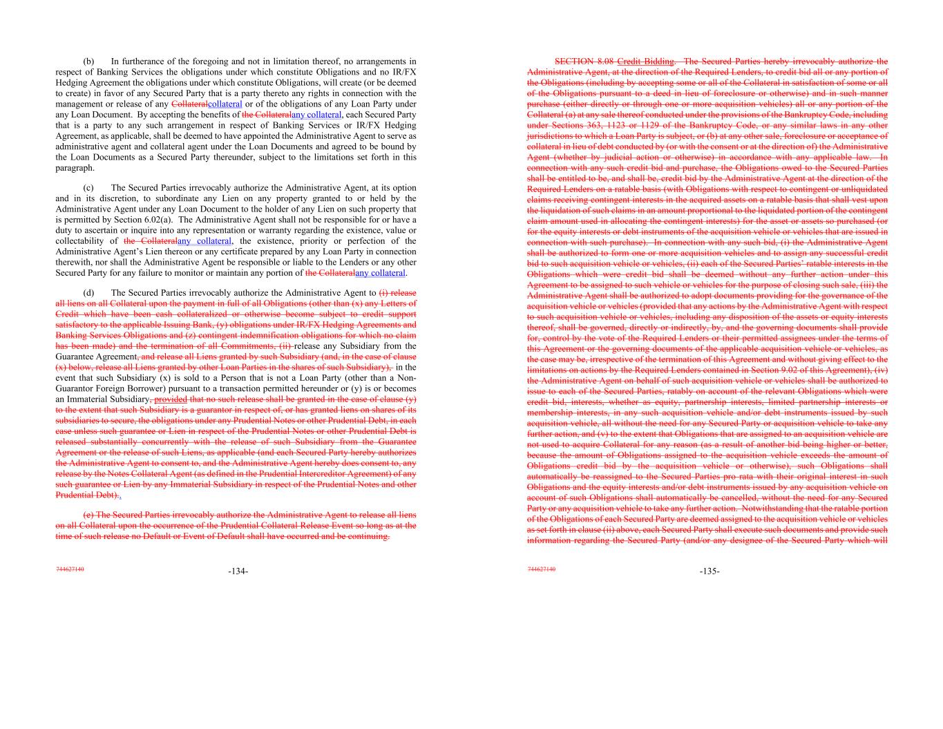 744627140 -134- (b) In furtherance of the foregoing and not in limitation thereof, no arrangements in respect of Banking Services the obligations under which constitute Obligations and no IR/FX Hedging Agreement the obligations under which constitute Obligations, will create (or be deemed to create) in favor of any Secured Party that is a party thereto any rights in connection with the management or release of any Collateralcollateral or of the obligations of any Loan Party under any Loan Document. By accepting the benefits of the Collateralany collateral, each Secured Party that is a party to any such arrangement in respect of Banking Services or IR/FX Hedging Agreement, as applicable, shall be deemed to have appointed the Administrative Agent to serve as administrative agent and collateral agent under the Loan Documents and agreed to be bound by the Loan Documents as a Secured Party thereunder, subject to the limitations set forth in this paragraph. (c) The Secured Parties irrevocably authorize the Administrative Agent, at its option and in its discretion, to subordinate any Lien on any property granted to or held by the Administrative Agent under any Loan Document to the holder of any Lien on such property that is permitted by Section 6.02(a). The Administrative Agent shall not be responsible for or have a duty to ascertain or inquire into any representation or warranty regarding the existence, value or collectability of the Collateralany collateral, the existence, priority or perfection of the Administrative Agent’s Lien thereon or any certificate prepared by any Loan Party in connection therewith, nor shall the Administrative Agent be responsible or liable to the Lenders or any other Secured Party for any failure to monitor or maintain any portion of the Collateralany collateral. (d) The Secured Parties irrevocably authorize the Administrative Agent to (i) release all liens on all Collateral upon the payment in full of all Obligations (other than (x) any Letters of Credit which have been cash collateralized or otherwise become subject to credit support satisfactory to the applicable Issuing Bank, (y) obligations under IR/FX Hedging Agreements and Banking Services Obligations and (z) contingent indemnification obligations for which no claim has been made) and the termination of all Commitments, (ii) release any Subsidiary from the Guarantee Agreement, and release all Liens granted by such Subsidiary (and, in the case of clause (x) below, release all Liens granted by other Loan Parties in the shares of such Subsidiary), in the event that such Subsidiary (x) is sold to a Person that is not a Loan Party (other than a Non- Guarantor Foreign Borrower) pursuant to a transaction permitted hereunder or (y) is or becomes an Immaterial Subsidiary, provided that no such release shall be granted in the case of clause (y) to the extent that such Subsidiary is a guarantor in respect of, or has granted liens on shares of its subsidiaries to secure, the obligations under any Prudential Notes or other Prudential Debt, in each case unless such guarantee or Lien in respect of the Prudential Notes or other Prudential Debt is released substantially concurrently with the release of such Subsidiary from the Guarantee Agreement or the release of such Liens, as applicable (and each Secured Party hereby authorizes the Administrative Agent to consent to, and the Administrative Agent hereby does consent to, any release by the Notes Collateral Agent (as defined in the Prudential Intercreditor Agreement) of any such guarantee or Lien by any Immaterial Subsidiary in respect of the Prudential Notes and other Prudential Debt).. (e) The Secured Parties irrevocably authorize the Administrative Agent to release all liens on all Collateral upon the occurrence of the Prudential Collateral Release Event so long as at the time of such release no Default or Event of Default shall have occurred and be continuing. 744627140 -135- SECTION 8.08 Credit Bidding. The Secured Parties hereby irrevocably authorize the Administrative Agent, at the direction of the Required Lenders, to credit bid all or any portion of the Obligations (including by accepting some or all of the Collateral in satisfaction of some or all of the Obligations pursuant to a deed in lieu of foreclosure or otherwise) and in such manner purchase (either directly or through one or more acquisition vehicles) all or any portion of the Collateral (a) at any sale thereof conducted under the provisions of the Bankruptcy Code, including under Sections 363, 1123 or 1129 of the Bankruptcy Code, or any similar laws in any other jurisdictions to which a Loan Party is subject, or (b) at any other sale, foreclosure or acceptance of collateral in lieu of debt conducted by (or with the consent or at the direction of) the Administrative Agent (whether by judicial action or otherwise) in accordance with any applicable law. In connection with any such credit bid and purchase, the Obligations owed to the Secured Parties shall be entitled to be, and shall be, credit bid by the Administrative Agent at the direction of the Required Lenders on a ratable basis (with Obligations with respect to contingent or unliquidated claims receiving contingent interests in the acquired assets on a ratable basis that shall vest upon the liquidation of such claims in an amount proportional to the liquidated portion of the contingent claim amount used in allocating the contingent interests) for the asset or assets so purchased (or for the equity interests or debt instruments of the acquisition vehicle or vehicles that are issued in connection with such purchase). In connection with any such bid, (i) the Administrative Agent shall be authorized to form one or more acquisition vehicles and to assign any successful credit bid to such acquisition vehicle or vehicles, (ii) each of the Secured Parties’ ratable interests in the Obligations which were credit bid shall be deemed without any further action u