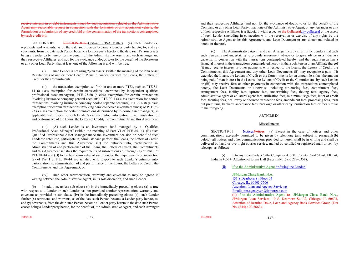 744627140 -136- receive interests in or debt instruments issued by such acquisition vehicle) as the Administrative Agent may reasonably request in connection with the formation of any acquisition vehicle, the formulation or submission of any credit bid or the consummation of the transactions contemplated by such credit bid. SECTION 8.08 SECTION 8.09 Certain ERISA Matters. (a) Each Lender (x) represents and warrants, as of the date such Person became a Lender party hereto, to, and (y) covenants, from the date such Person became a Lender party hereto to the date such Person ceases being a Lender party hereto, for the benefit of, the Administrative Agent, and each Arranger and their respective Affiliates, and not, for the avoidance of doubt, to or for the benefit of the Borrowers or any other Loan Party, that at least one of the following is and will be true: (i) such Lender is not using “plan assets” (within the meaning of the Plan Asset Regulations) of one or more Benefit Plans in connection with the Loans, the Letters of Credit or the Commitments, (ii) the transaction exemption set forth in one or more PTEs, such as PTE 84- 14 (a class exemption for certain transactions determined by independent qualified professional asset managers), PTE 95-60 (a class exemption for certain transactions involving insurance company general accounts), PTE 90-1 (a class exemption for certain transactions involving insurance company pooled separate accounts), PTE 91-38 (a class exemption for certain transactions involving bank collective investment funds) or PTE 96- 23 (a class exemption for certain transactions determined by in-house asset managers), is applicable with respect to such Lender’s entrance into, participation in, administration of and performance of the Loans, the Letters of Credit, the Commitments and this Agreement, (iii) (A) such Lender is an investment fund managed by a “Qualified Professional Asset Manager” (within the meaning of Part VI of PTE 84-14), (B) such Qualified Professional Asset Manager made the investment decision on behalf of such Lender to enter into, participate in, administer and perform the Loans, the Letters of Credit, the Commitments and this Agreement, (C) the entrance into, participation in, administration of and performance of the Loans, the Letters of Credit, the Commitments and this Agreement satisfies the requirements of sub-sections (b) through (g) of Part I of PTE 84-14 and (D) to the best knowledge of such Lender, the requirements of subsection (a) of Part I of PTE 84-14 are satisfied with respect to such Lender’s entrance into, participation in, administration of and performance of the Loans, the Letters of Credit, the Commitments and this Agreement, or (iv) such other representation, warranty and covenant as may be agreed in writing between the Administrative Agent, in its sole discretion, and such Lender. (b) In addition, unless sub-clause (i) in the immediately preceding clause (a) is true with respect to a Lender or such Lender has not provided another representation, warranty and covenant as provided in sub-clause (iv) in the immediately preceding clause (a), such Lender further (x) represents and warrants, as of the date such Person became a Lender party hereto, to, and (y) covenants, from the date such Person became a Lender party hereto to the date such Person ceases being a Lender party hereto, for the benefit of, the Administrative Agent, and each Arranger 744627140 -137- and their respective Affiliates, and not, for the avoidance of doubt, to or for the benefit of the Company or any other Loan Party, that none of the Administrative Agent, or any Arranger or any of their respective Affiliates is a fiduciary with respect to the Collateralany collateral or the assets of such Lender (including in connection with the reservation or exercise of any rights by the Administrative Agent under this Agreement, any Loan Document or any documents related to hereto or thereto). (c) The Administrative Agent, and each Arranger hereby informs the Lenders that each such Person is not undertaking to provide investment advice or to give advice in a fiduciary capacity, in connection with the transactions contemplated hereby, and that such Person has a financial interest in the transactions contemplated hereby in that such Person or an Affiliate thereof (i) may receive interest or other payments with respect to the Loans, the Letters of Credit, the Commitments, this Agreement and any other Loan Documents (ii) may recognize a gain if it extended the Loans, the Letters of Credit or the Commitments for an amount less than the amount being paid for an interest in the Loans, the Letters of Credit or the Commitments by such Lender or (iii) may receive fees or other payments in connection with the transactions contemplated hereby, the Loan Documents or otherwise, including structuring fees, commitment fees, arrangement fees, facility fees, upfront fees, underwriting fees, ticking fees, agency fees, administrative agent or collateral agent fees, utilization fees, minimum usage fees, letter of credit fees, fronting fees, deal-away or alternate transaction fees, amendment fees, processing fees, term out premiums, banker’s acceptance fees, breakage or other early termination fees or fees similar to the foregoing. ARTICLE IX. Miscellaneous SECTION 9.01 NoticesNotices. (a) Except in the case of notices and other communications expressly permitted to be given by telephone (and subject to paragraph (b) below), all notices and other communications provided for herein shall be in writing and shall be delivered by hand or overnight courier service, mailed by certified or registered mail or sent by telecopy, as follows: (i) if to any Loan Party, c/o the Company at: 3501 County Road 6 East, Elkhart, Indiana 46514, Attention of Brian Hall (Facsimile: (575) 217-0358); (ii) if to the Administrative Agent or Swingline Lender: JPMorgan Chase Bank, N.A. 131 S Dearborn St, Floor 04 Ch