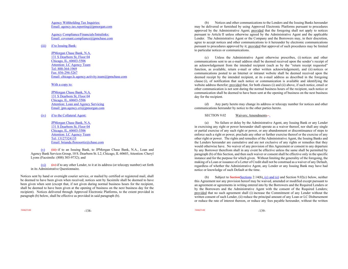 744627140 -138- Agency Withholding Tax Inquiries: Email: agency.tax.reporting@jpmorgan.com Agency Compliance/Financials/Intralinks: Email: covenant.compliance@jpmchase.com (iii) if to Issuing Bank: JPMorgan Chase Bank, N.A. 131 S Dearborn St, Floor 04 Chicago, IL, 60603-5506 Attention: LC Agency Team Tel: 800-364-1969 Fax: 856-294-5267 Email: chicago.lc.agency.activity.team@jpmchase.com With a copy to: JPMorgan Chase Bank, N.A. 131 S Dearborn St, Floor 04 Chicago, IL, 60603-5506 Attention: Loan and Agency Servicing Email: jpm.agency.cri@jpmorgan.com (iv) if to the Collateral Agent: JPMorgan Chase Bank, N.A. 131 S Dearborn St, Floor 04 Chicago, IL, 60603-5506 Attention: LC Agency Team Tel: 13127324135 Email: brianda.floresortiz@chase.com (v) (iii) if to an Issuing Bank, to JPMorgan Chase Bank, N.A., Loan and Agency Bank Services Group, 10 S. Dearborn St. L2, Chicago, IL 60603, Attention: Cheryl Lyons (Facsimile: (888) 303-9732); and (vi) (iv) if to any other Lender, to it at its address (or telecopy number) set forth in its Administrative Questionnaire. Notices sent by hand or overnight courier service, or mailed by certified or registered mail, shall be deemed to have been given when received; notices sent by facsimile shall be deemed to have been given when sent (except that, if not given during normal business hours for the recipient, shall be deemed to have been given at the opening of business on the next business day for the recipient). Notices delivered through Approved Electronic Platforms, to the extent provided in paragraph (b) below, shall be effective as provided in said paragraph (b). 744627140 -139- (b) Notices and other communications to the Lenders and the Issuing Banks hereunder may be delivered or furnished by using Approved Electronic Platforms pursuant to procedures approved by the Administrative Agent; provided that the foregoing shall not apply to notices pursuant to Article II unless otherwise agreed by the Administrative Agent and the applicable Lender. The Administrative Agent or the Company and the Borrowers may, in their discretion, agree to accept notices and other communications to it hereunder by electronic communications pursuant to procedures approved by it; provided that approval of such procedures may be limited to particular notices or communications. (c) Unless the Administrative Agent otherwise prescribes, (i) notices and other communications sent to an e-mail address shall be deemed received upon the sender’s receipt of an acknowledgement from the intended recipient (such as by the “return receipt requested” function, as available, return e-mail or other written acknowledgement), and (ii) notices or communications posted to an Internet or intranet website shall be deemed received upon the deemed receipt by the intended recipient, at its e-mail address as described in the foregoing clause (i), of notification that such notice or communication is available and identifying the website address therefor; provided that, for both clauses (i) and (ii) above, if such notice, email or other communication is not sent during the normal business hours of the recipient, such notice or communication shall be deemed to have been sent at the opening of business on the next business day for the recipient. (d) Any party hereto may change its address or telecopy number for notices and other communications hereunder by notice to the other parties hereto. SECTION 9.02 Waivers; Amendments. . (a) No failure or delay by the Administrative Agent, any Issuing Bank or any Lender in exercising any right or power hereunder shall operate as a waiver thereof, nor shall any single or partial exercise of any such right or power, or any abandonment or discontinuance of steps to enforce such a right or power, preclude any other or further exercise thereof or the exercise of any other right or power. The rights and remedies of the Administrative Agent, the Issuing Banks and the Lenders hereunder are cumulative and are not exclusive of any rights or remedies that they would otherwise have. No waiver of any provision of this Agreement or consent to any departure by any Borrower therefrom shall in any event be effective unless the same shall be permitted by paragraph (b) of this Section, and then such waiver or consent shall be effective only in the specific instance and for the purpose for which given. Without limiting the generality of the foregoing, the making of a Loan or issuance of a Letter of Credit shall not be construed as a waiver of any Default, regardless of whether the Administrative Agent, any Lender or any Issuing Bank may have had notice or knowledge of such Default at the time. (b) Subject to SectionSections 2.14(b), (c) and (e) and Section 9.02(c) below, neither this Agreement nor any provision hereof may be waived, amended or modified except pursuant to an agreement or agreements in writing entered into by the Borrowers and the Required Lenders or by the Borrowers and the Administrative Agent with the consent of the Required Lenders; provided that no such agreement shall (i) increase the Commitment of any Lender without the written consent of such Lender, (ii) reduce the principal amount of any Loan or LC Disbursement or reduce the rate of interest thereon, or reduce any fees payable hereunder, without the written